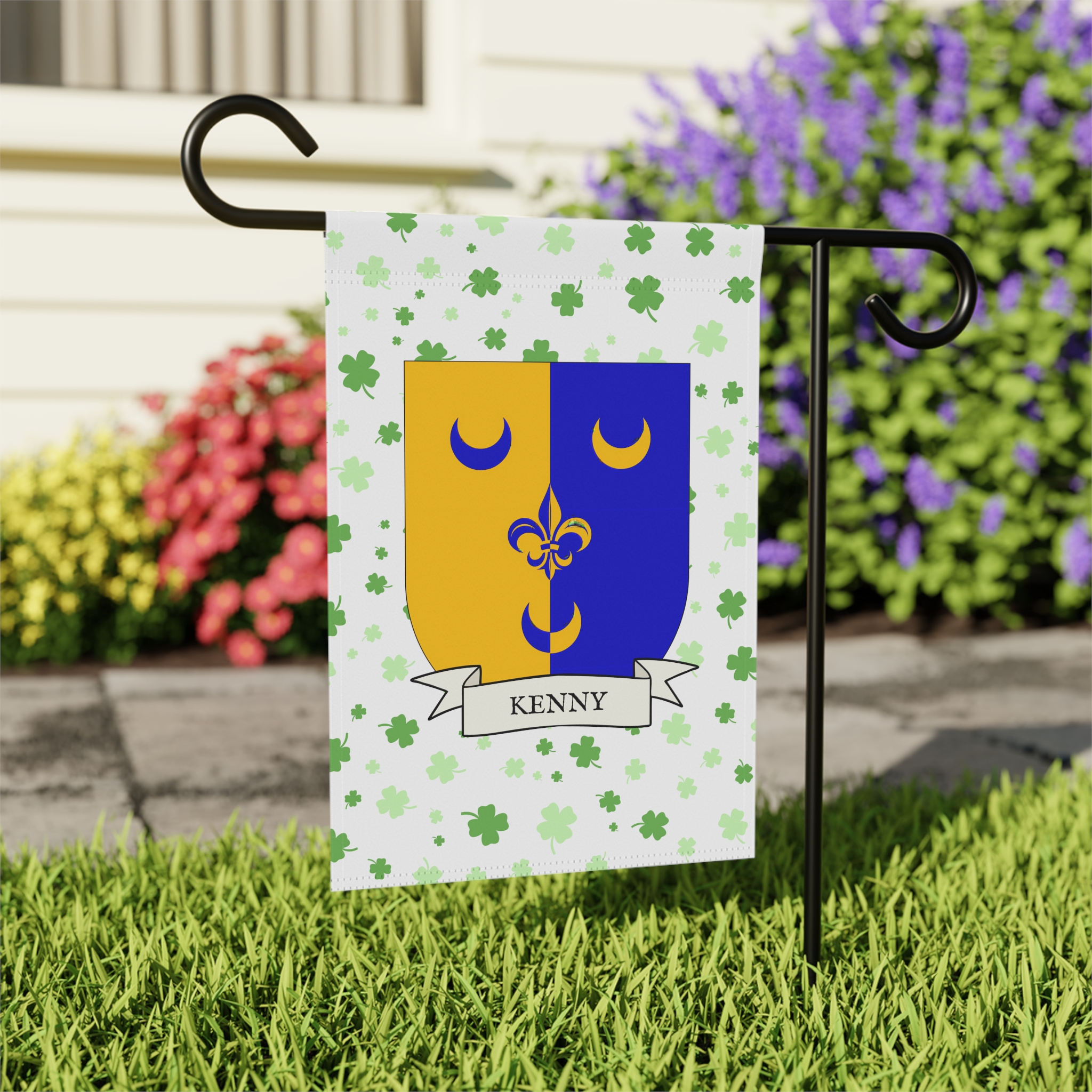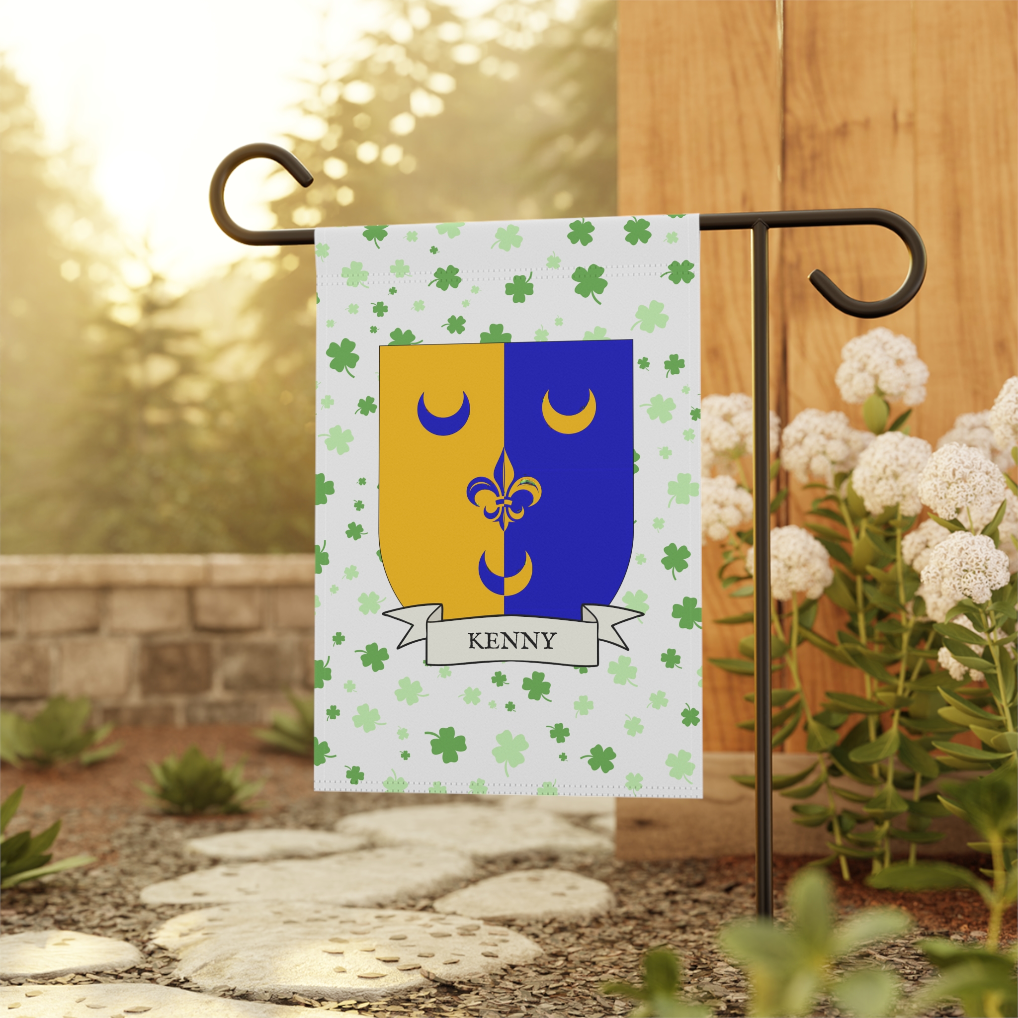 This welcoming Garden Banner will be a great addition to your garden or yard. It displays the Kenny Family Coat of Arms over a subtle background showing a field of four-leaf shamrocks. Both sides show identical images.