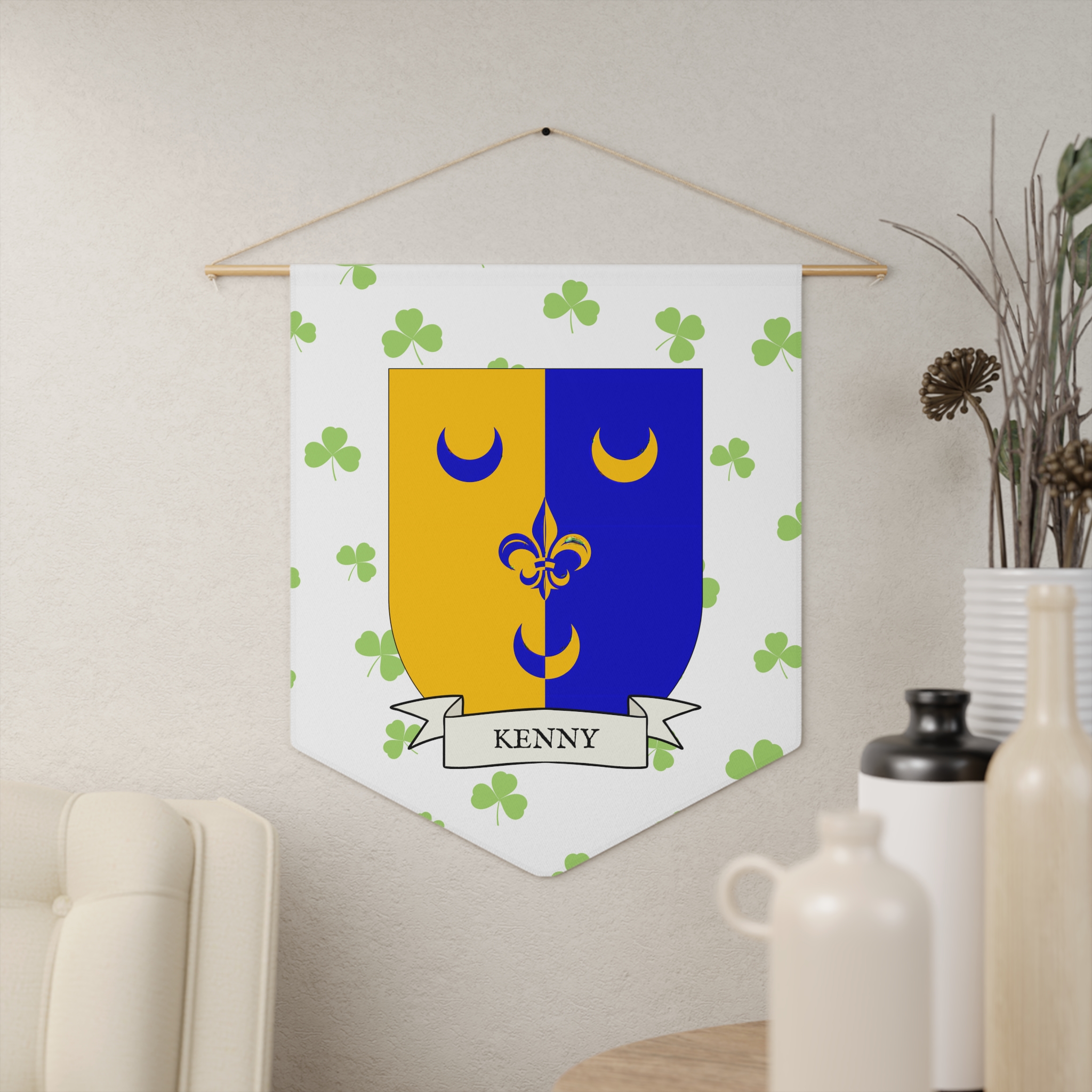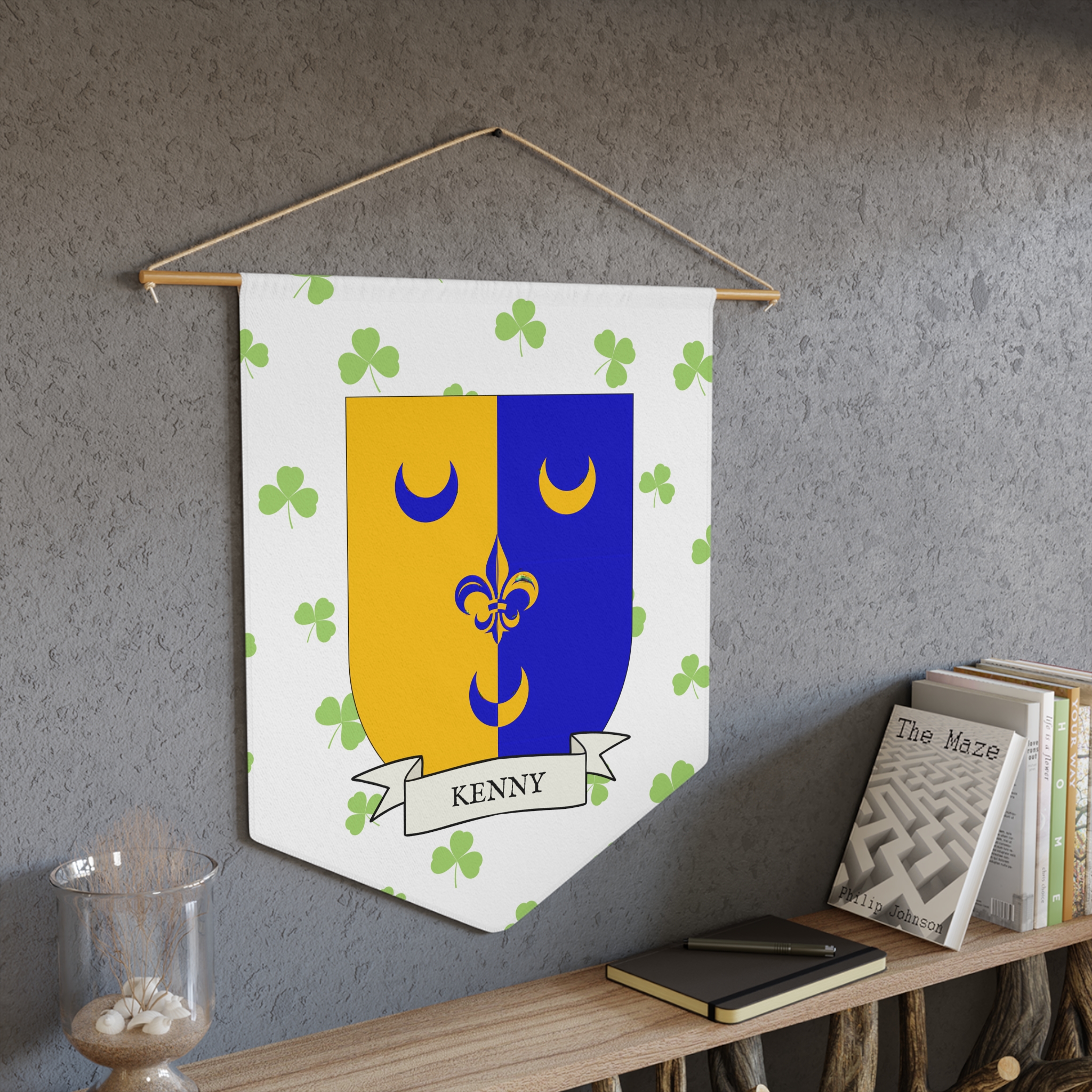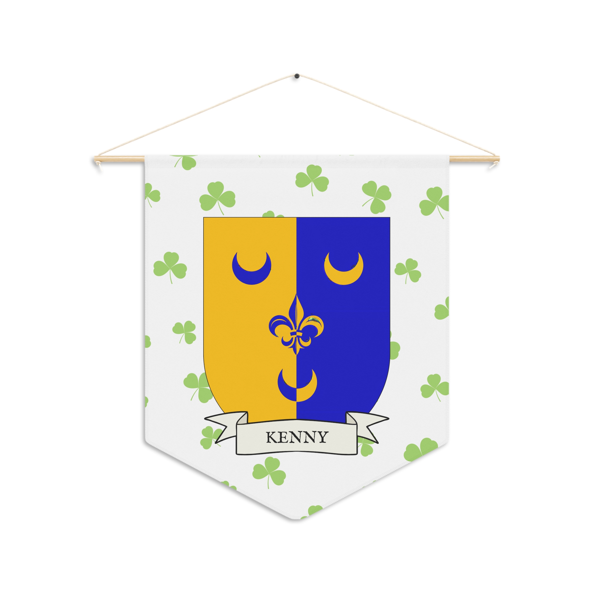 Uplift any room and show off your Irish American roots with this Kenny Family Coat of Arms Indoor Pennant. Pennant is printed on durable poly twill and comes with a wooden dowel/twine frame for easy hanging. Features your family Coat of Arms printed over a restrained shamrock patterned background.