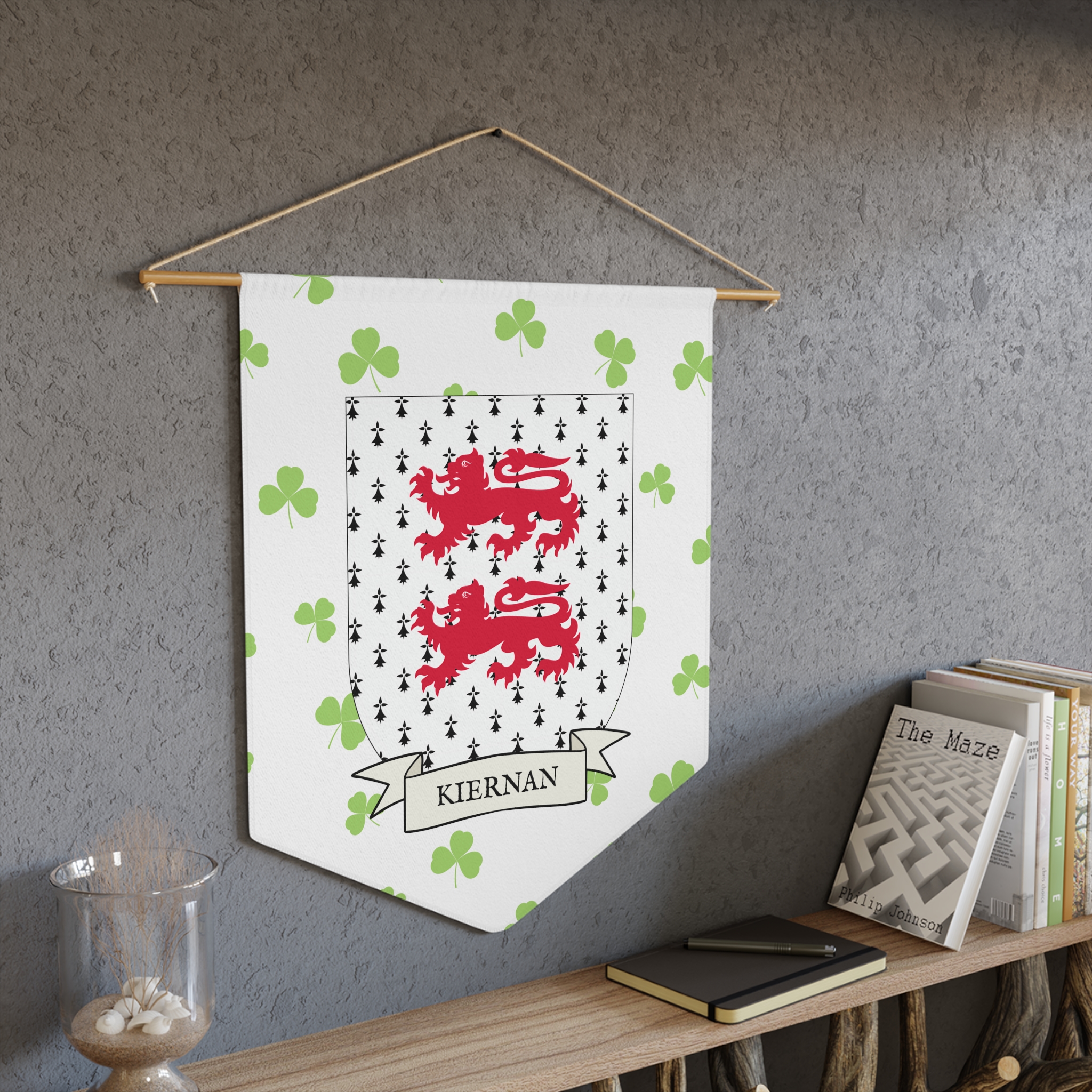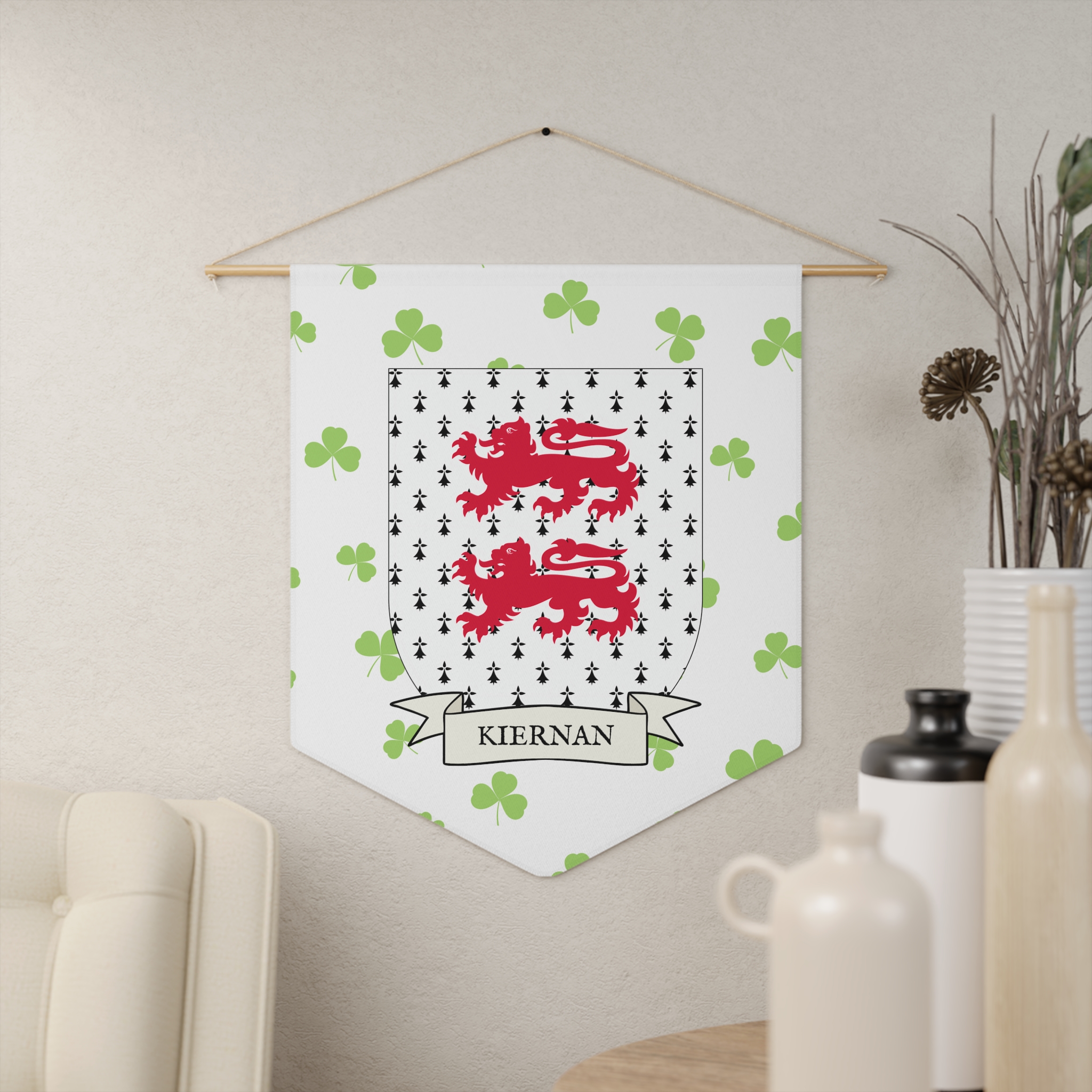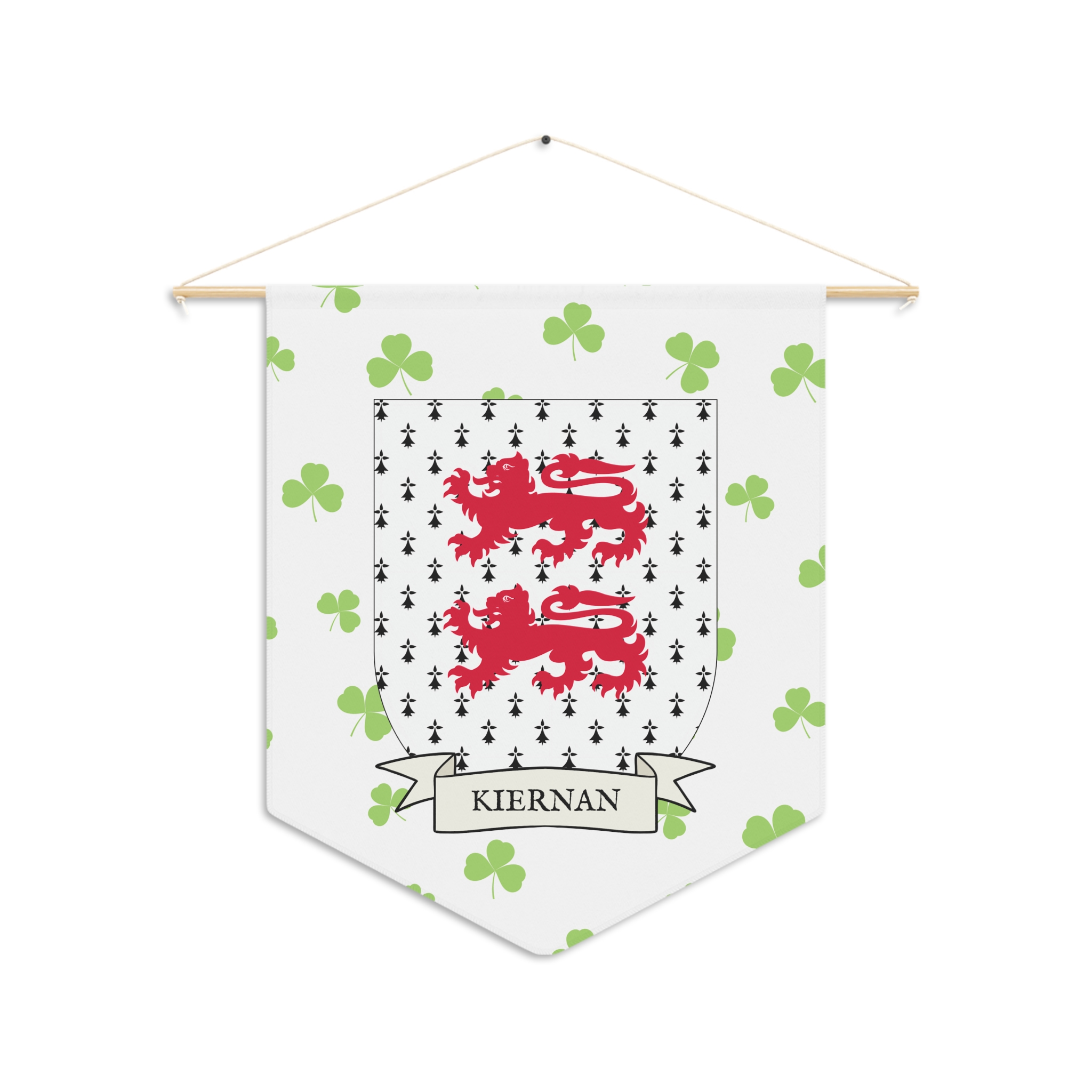 Uplift any room and show off your Irish American roots with this Kiernan Family Coat of Arms Indoor Pennant. Pennant is printed on durable poly twill and comes with a wooden dowel/twine frame for easy hanging. Features your family Coat of Arms printed over a restrained shamrock patterned background.