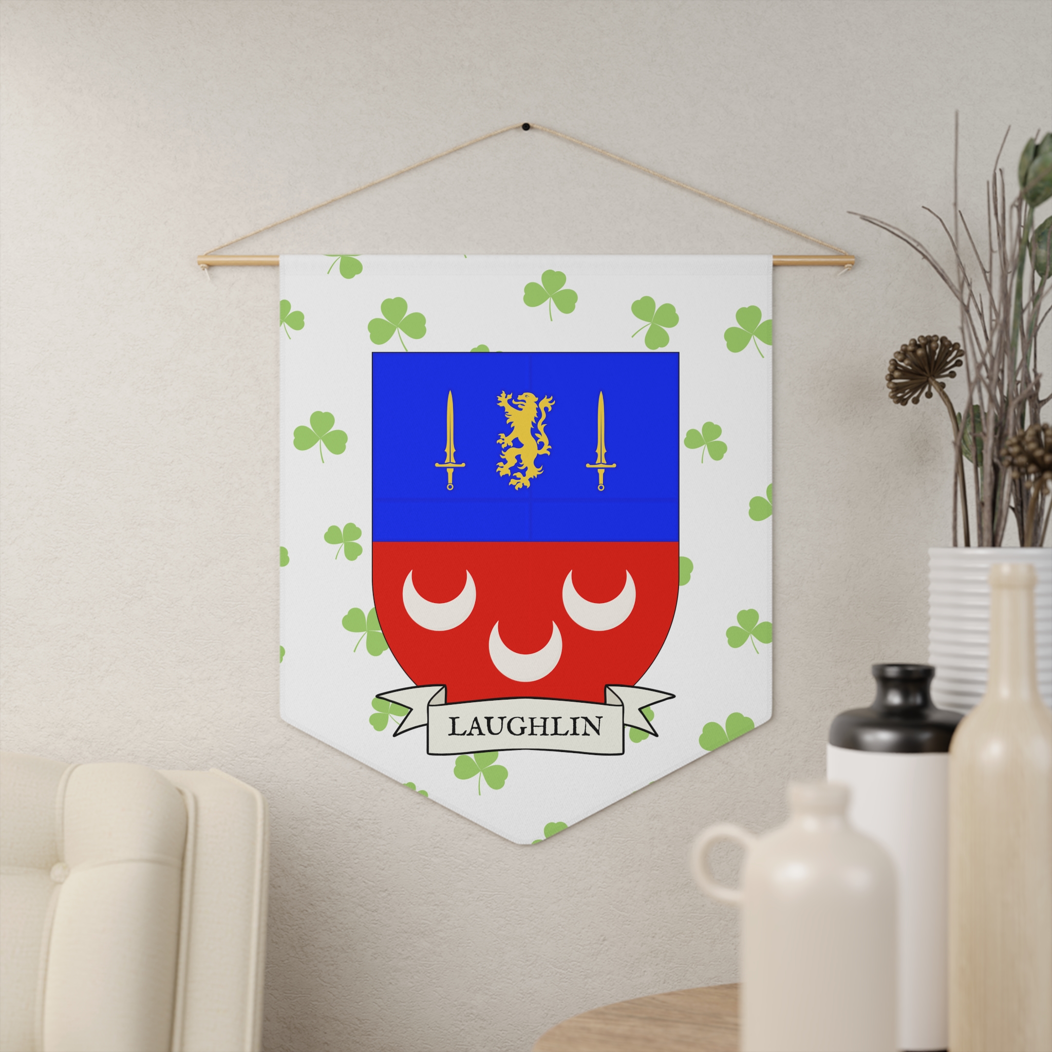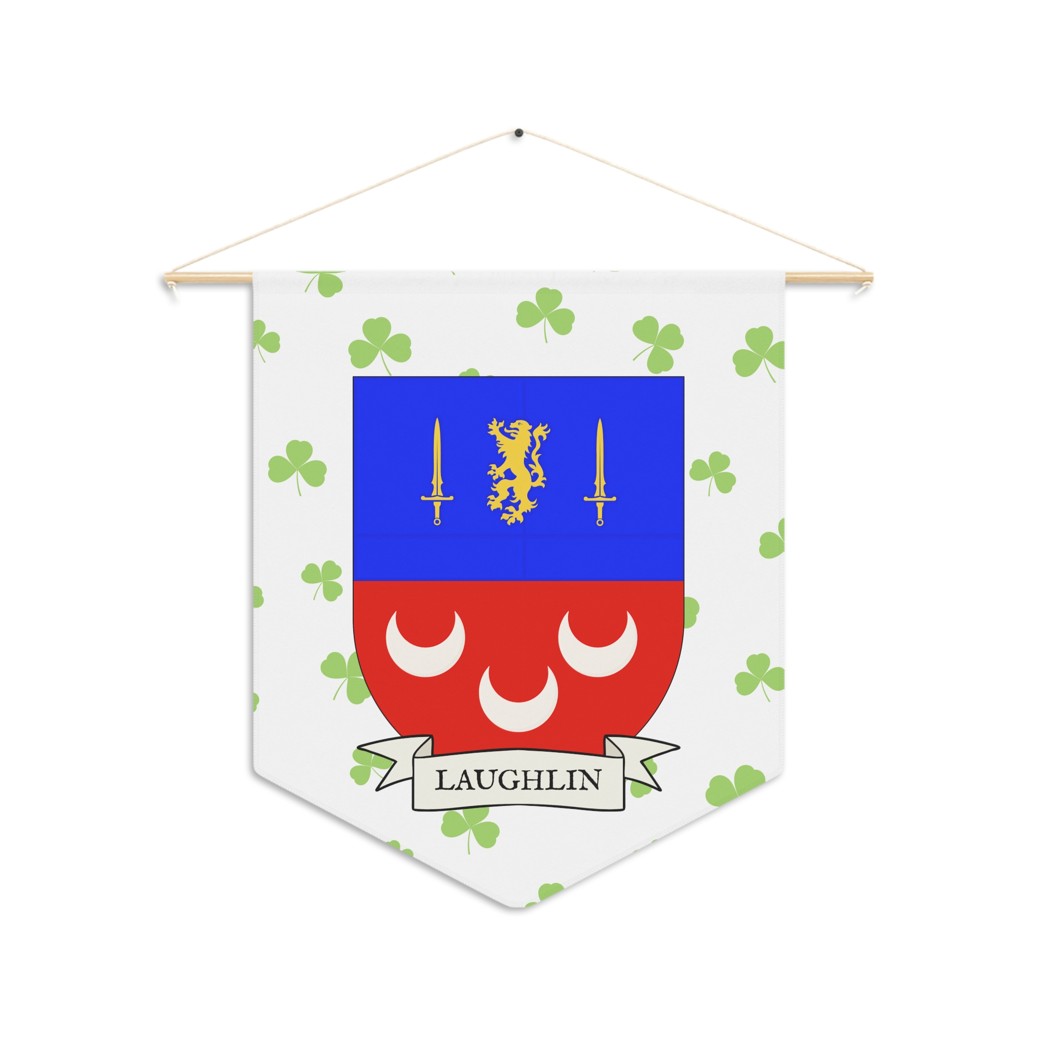 Uplift any room and show off your Irish American roots with this Laughlin Family Coat of Arms Indoor Pennant. Pennant is printed on durable poly twill and comes with a wooden dowel/twine frame for easy hanging. Features your family Coat of Arms printed over a restrained shamrock patterned background.