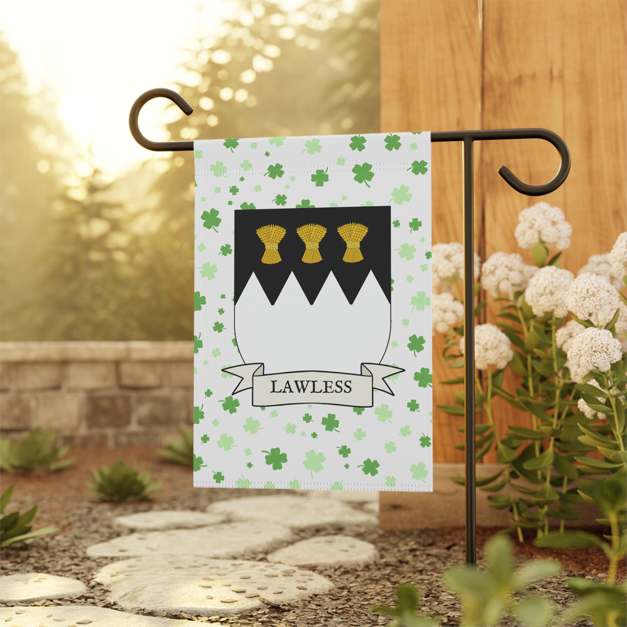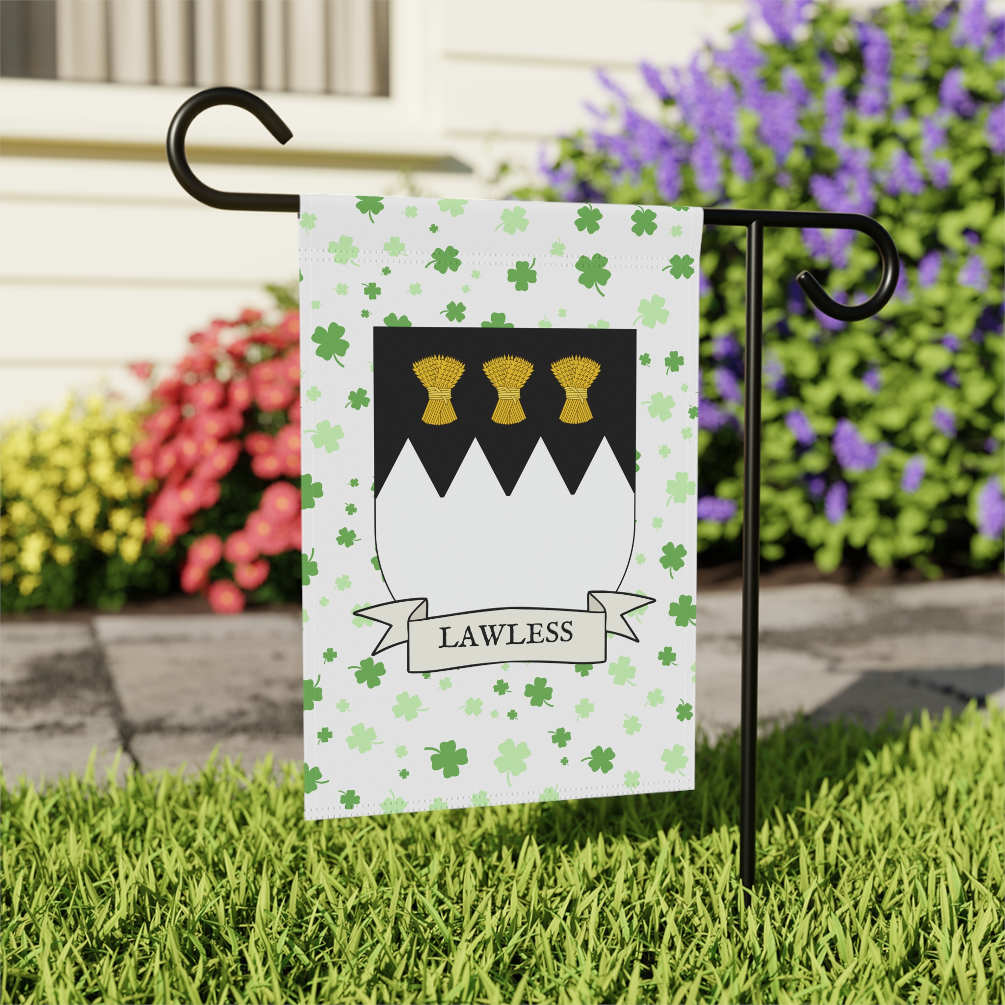 This welcoming Garden Banner will be a great addition to your garden or yard. It displays the Lawless Family Coat of Arms over a subtle background showing a field of four-leaf shamrocks. Both sides show identical images.