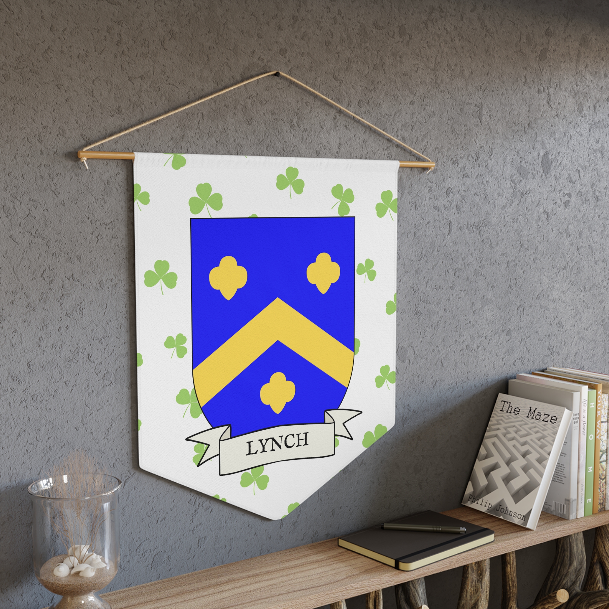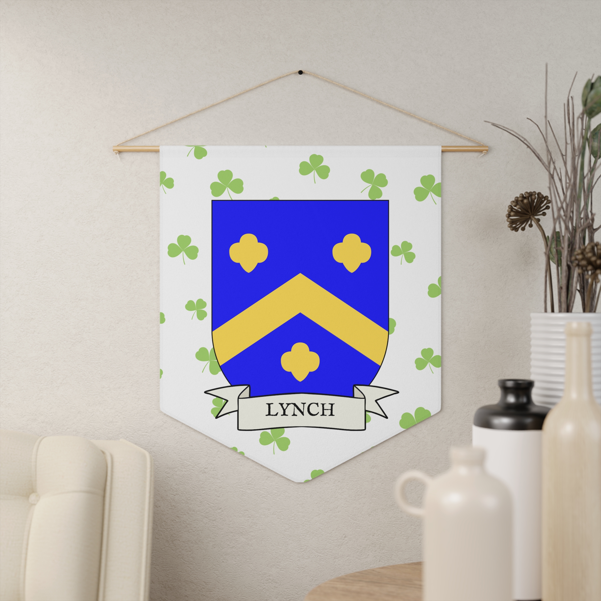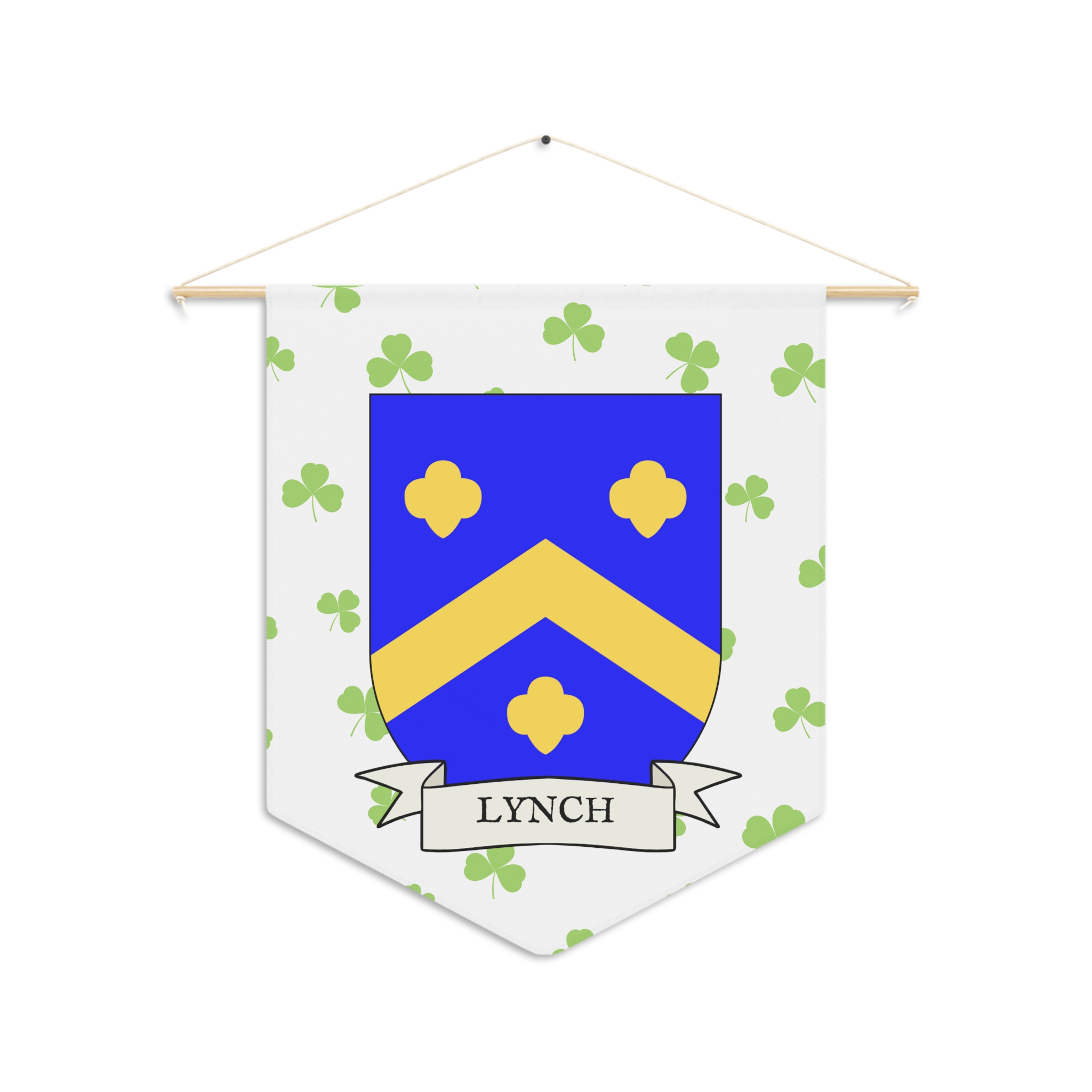 Uplift any room and show off your Irish American roots with this Lynch Family Coat of Arms Indoor Pennant. Pennant is printed on durable poly twill and comes with a wooden dowel/twine frame for easy hanging. Features your family Coat of Arms printed over a restrained shamrock patterned background.