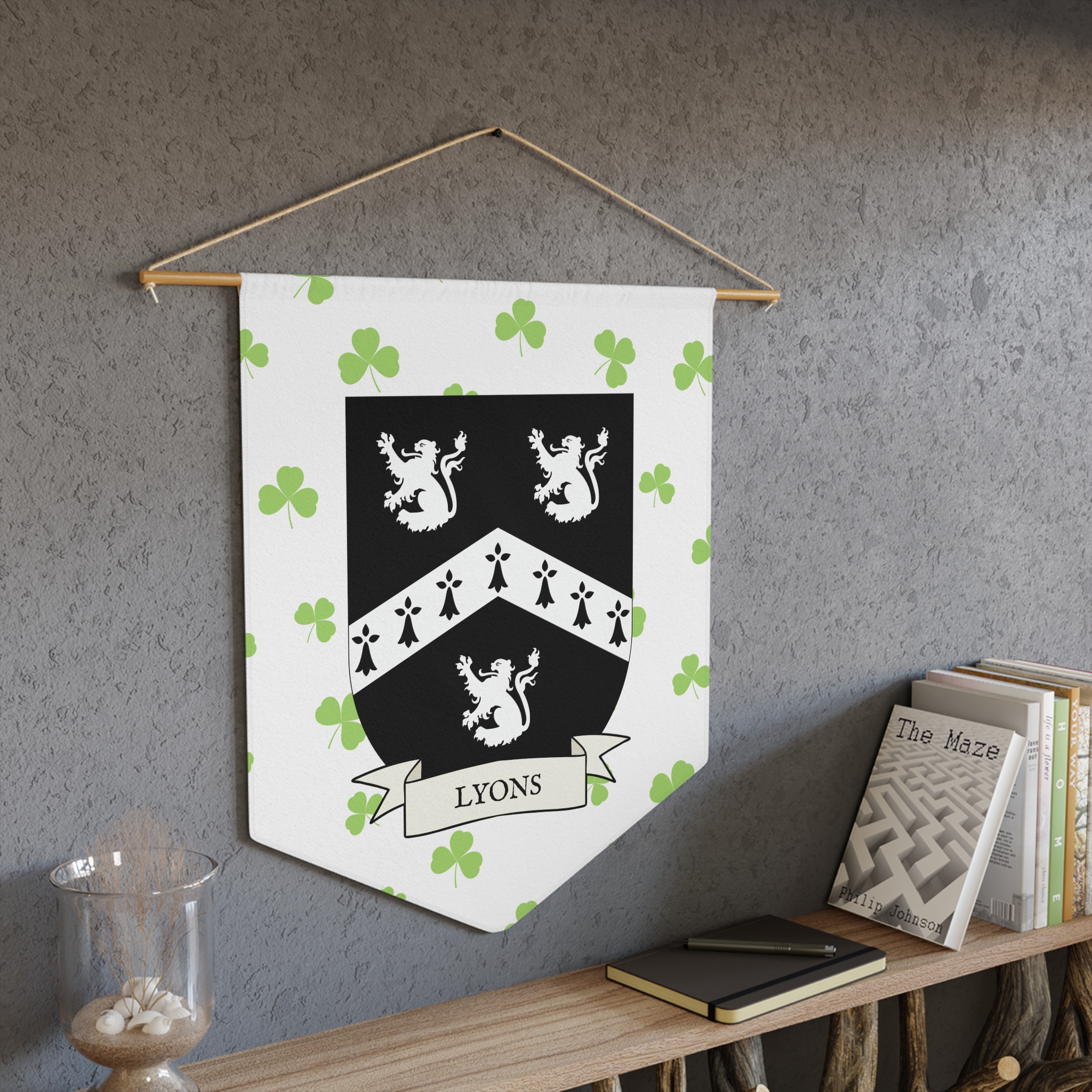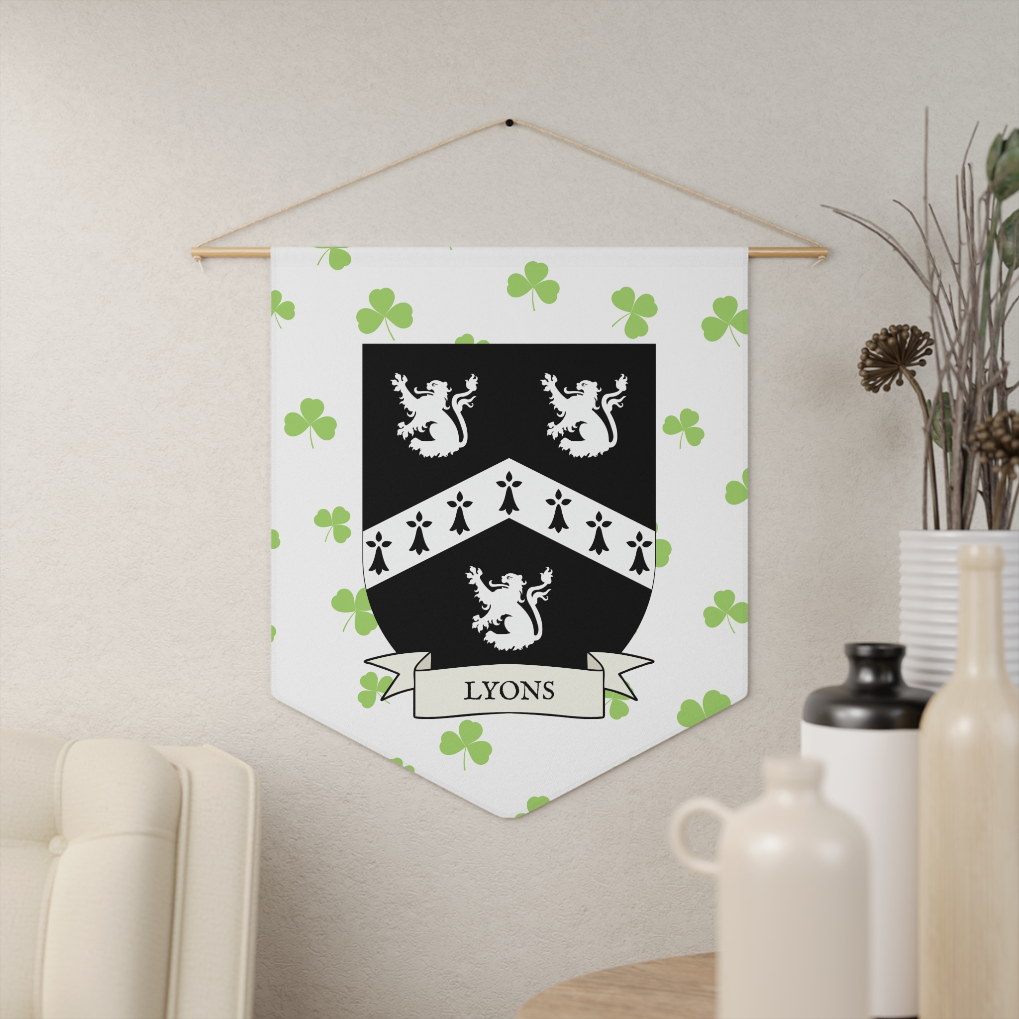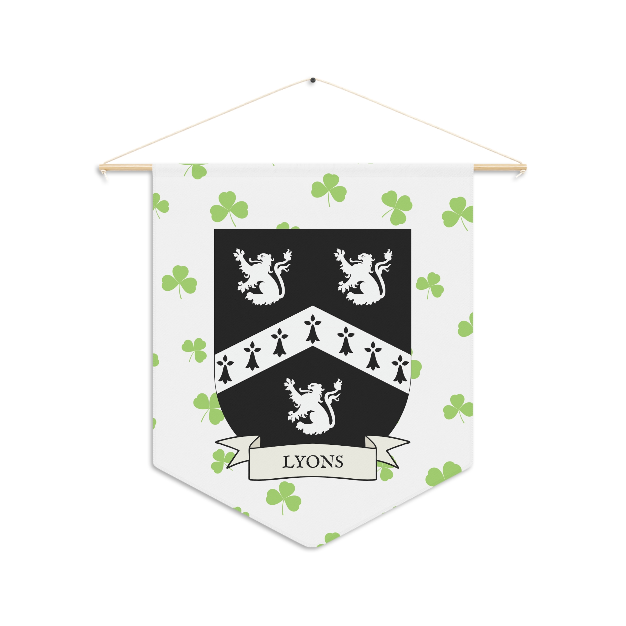 Uplift any room and show off your Irish American roots with this Lyons Family Coat of Arms Indoor Pennant. Pennant is printed on durable poly twill and comes with a wooden dowel/twine frame for easy hanging. Features your family Coat of Arms printed over a restrained shamrock patterned background.