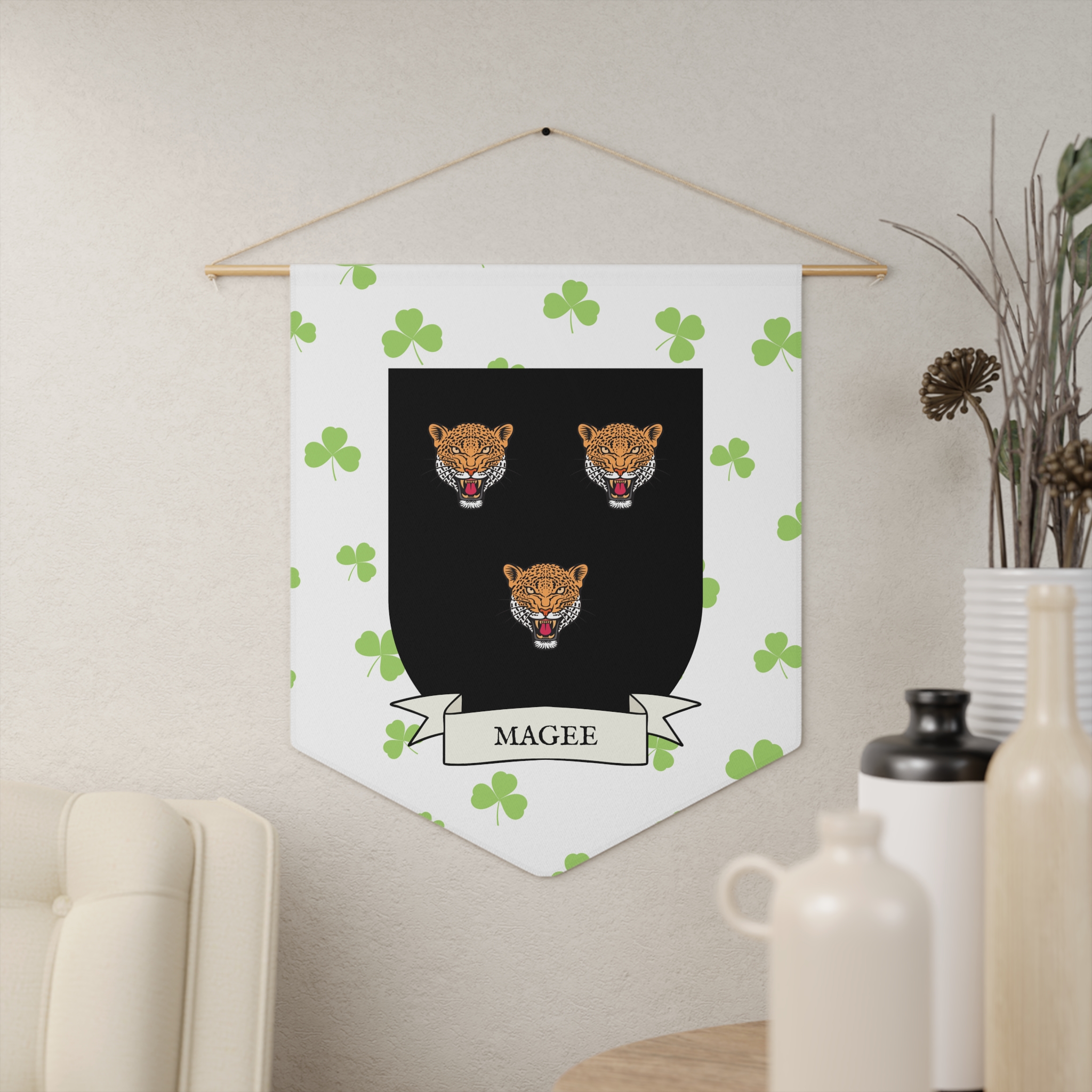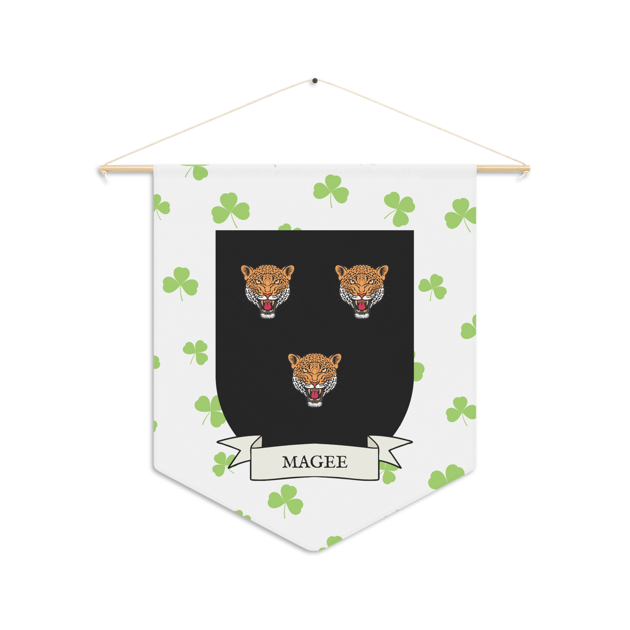Uplift any room and show off your Irish American roots with this Magee Family Coat of Arms Indoor Pennant. Pennant is printed on durable poly twill and comes with a wooden dowel/twine frame for easy hanging. Features your family Coat of Arms printed over a restrained shamrock patterned background.