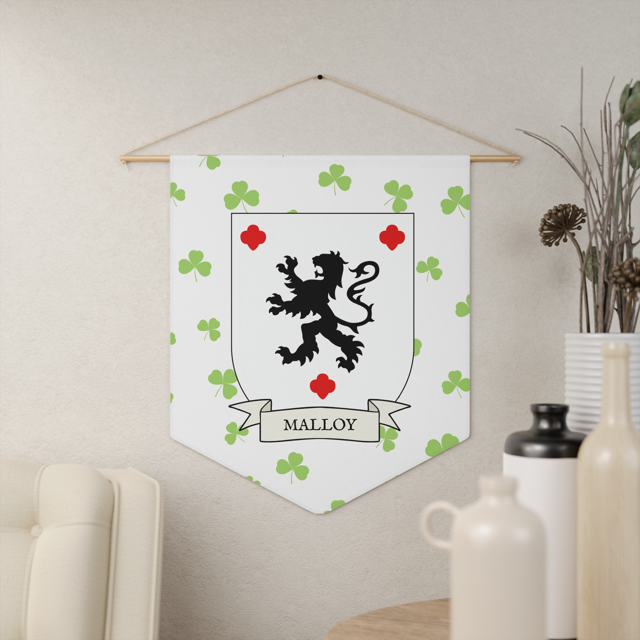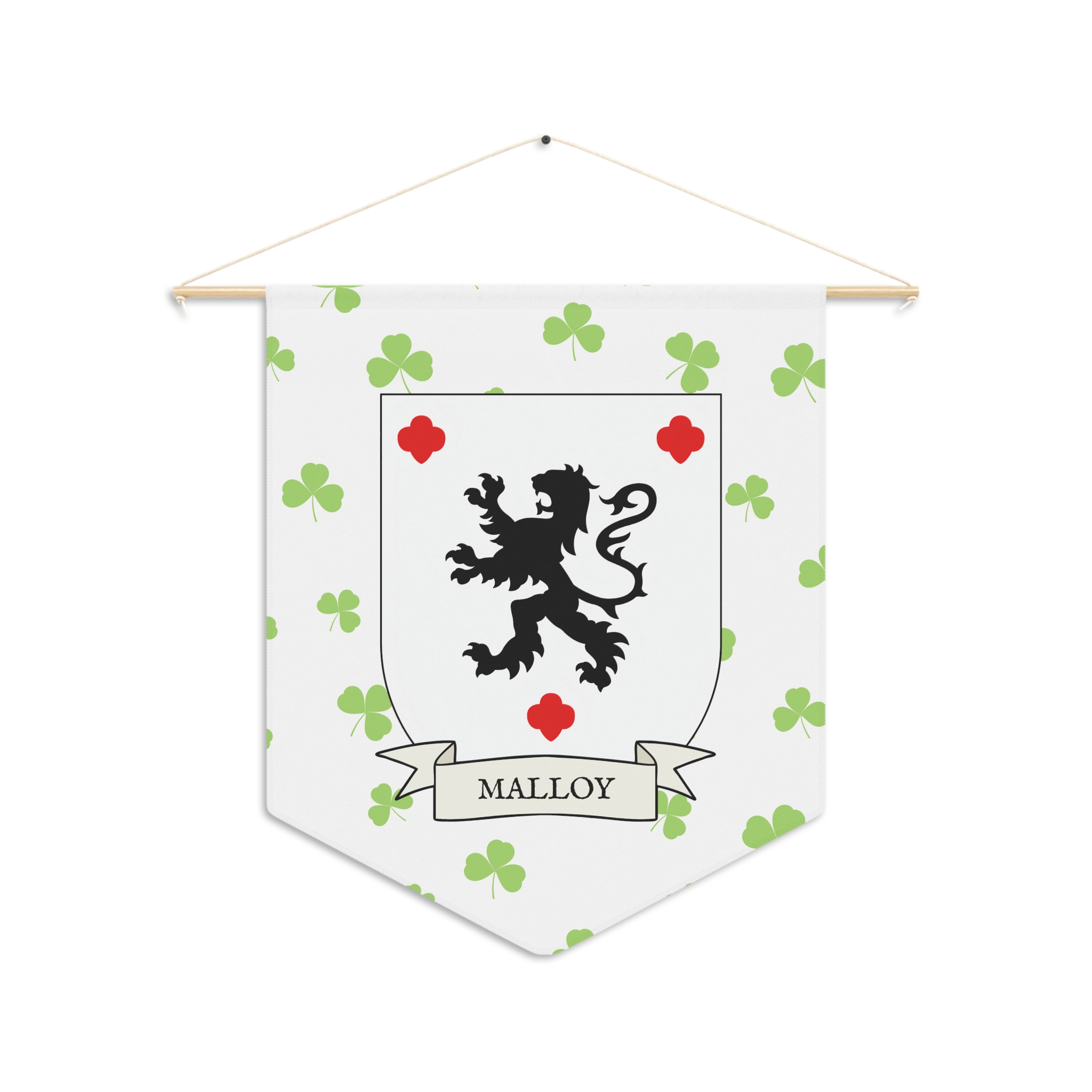 Uplift any room and show off your Irish American roots with this Malloy Family Coat of Arms Indoor Pennant. Pennant is printed on durable poly twill and comes with a wooden dowel/twine frame for easy hanging. Features your family Coat of Arms printed over a restrained shamrock patterned background.