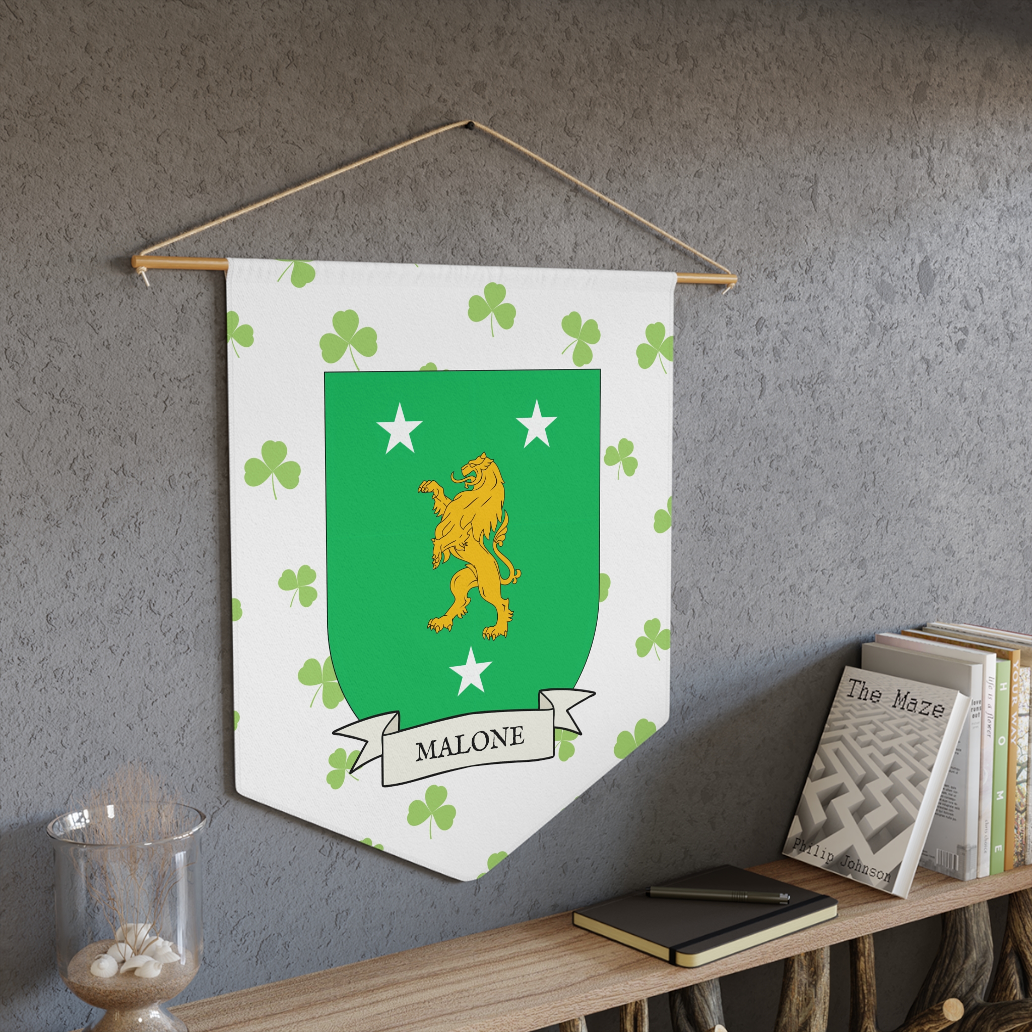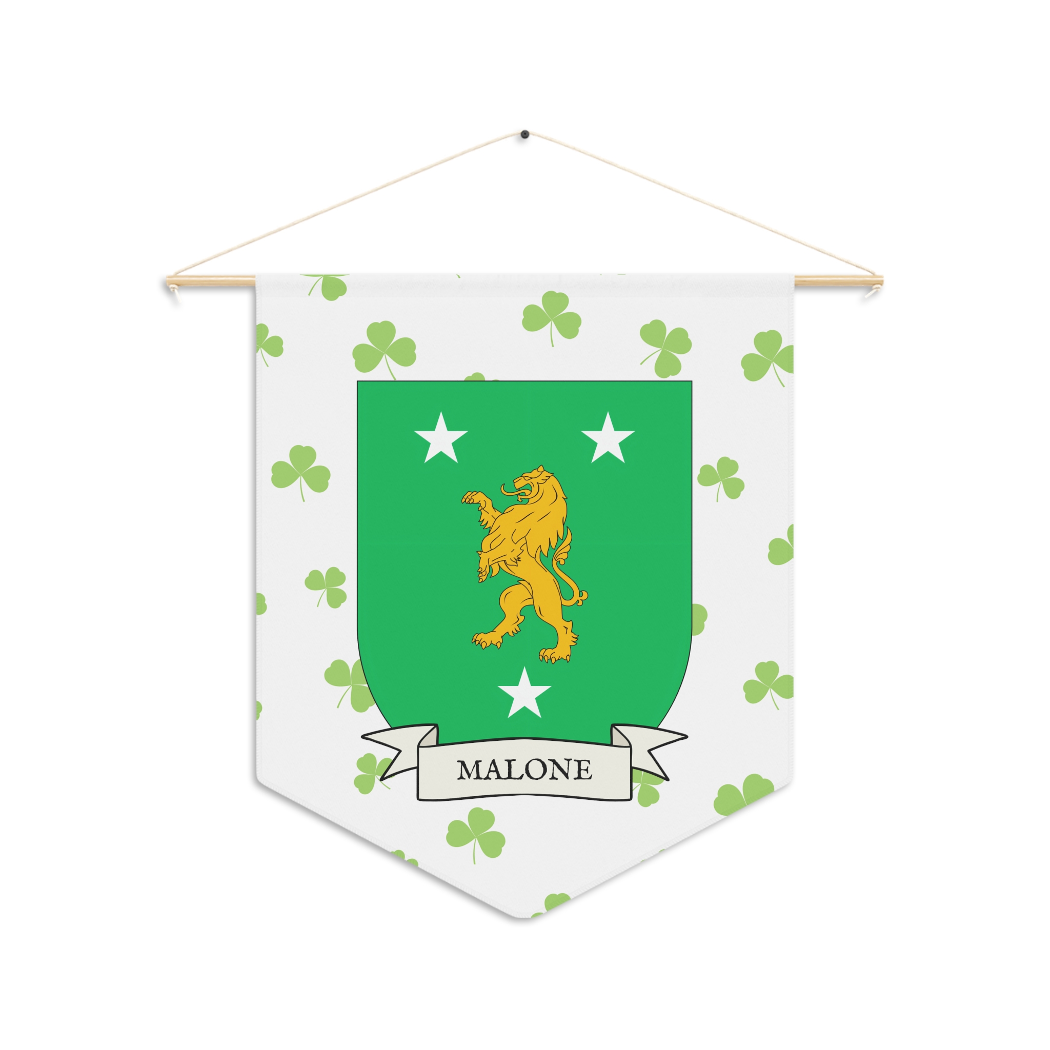 Uplift any room and show off your Irish American roots with this Malone Family Coat of Arms Indoor Pennant. Pennant is printed on durable poly twill and comes with a wooden dowel/twine frame for easy hanging. Features your family Coat of Arms printed over a restrained shamrock patterned background.