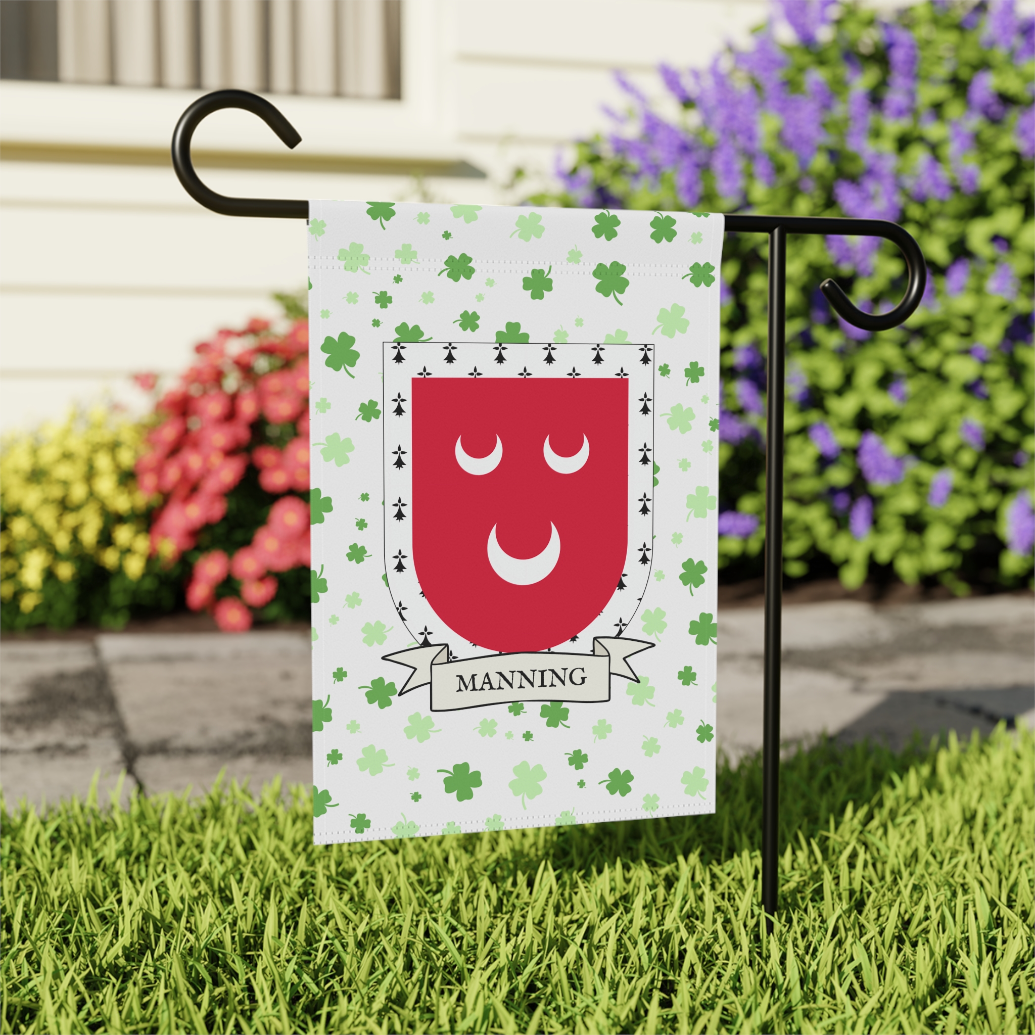 This welcoming Garden Banner will be a great addition to your garden or yard. It displays the Manning Family Coat of Arms over a subtle background showing a field of four-leaf shamrocks. Both sides show identical images.
