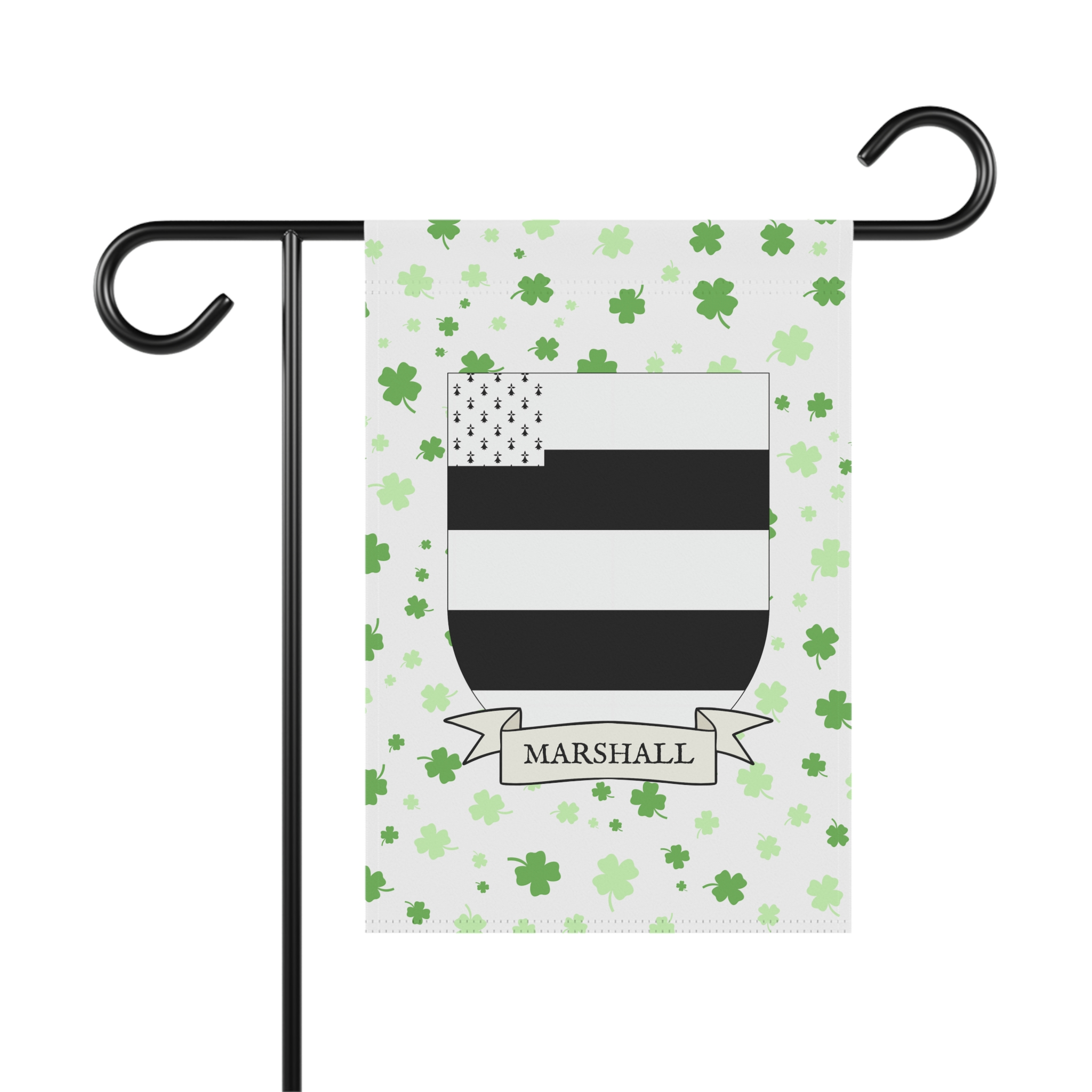 This welcoming Garden Banner will be a great addition to your garden or yard. It displays the Marshall Family Coat of Arms over a subtle background showing a field of four-leaf shamrocks. Both sides show identical images.