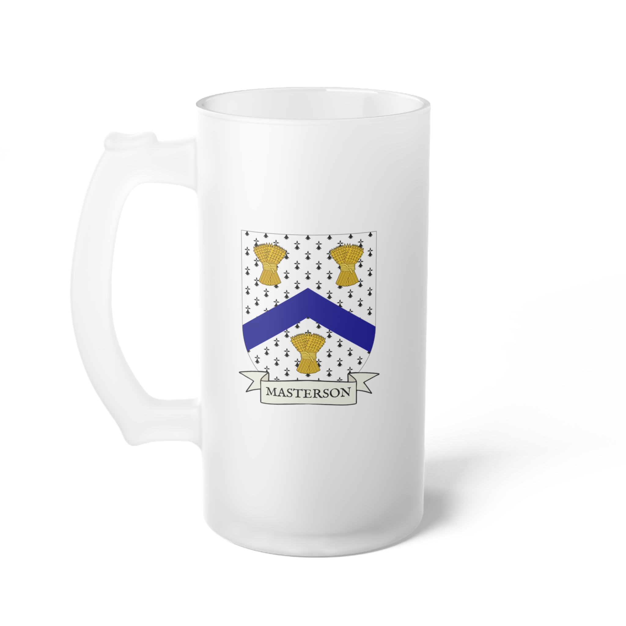 Masterson Family Coat of Arms Frosted Glass 16 oz. Beer Mug