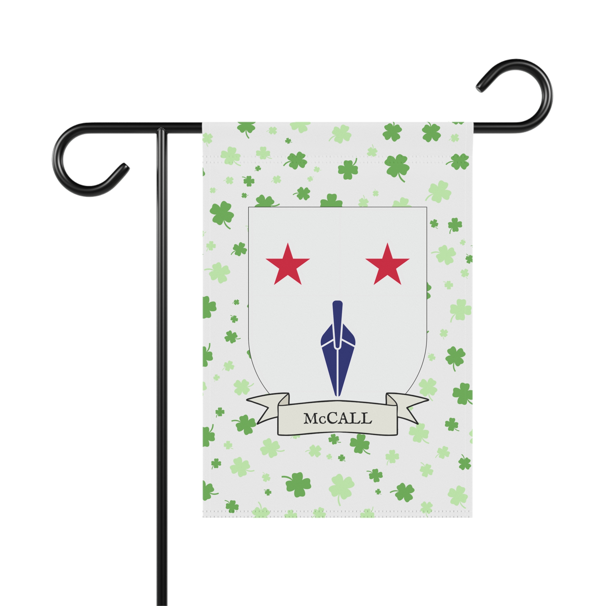 This welcoming Garden Banner will be a great addition to your garden or yard. It displays the McCall Family Coat of Arms over a subtle background showing a field of four-leaf shamrocks. Both sides show identical images.