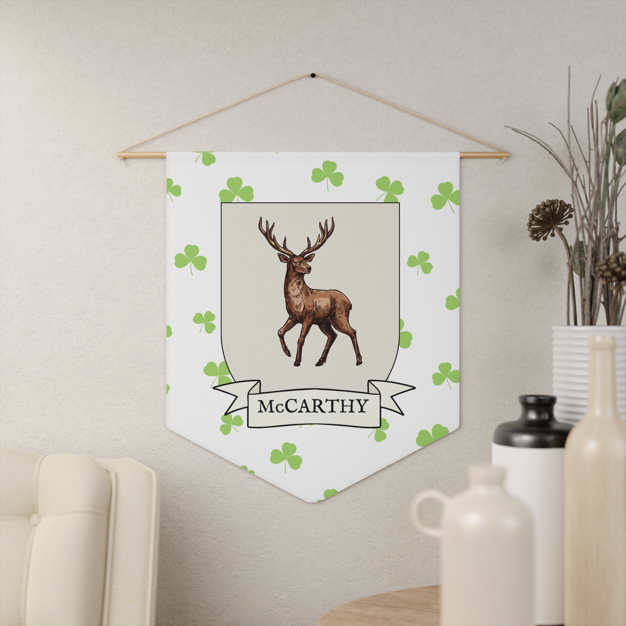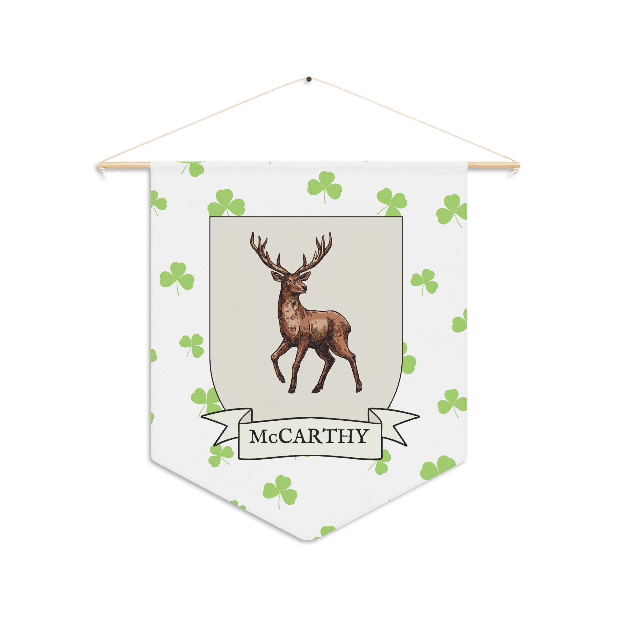 Uplift any room and show off your Irish American roots with this McCarthy Family Coat of Arms Indoor Pennant. Pennant is printed on durable poly twill and comes with a wooden dowel/twine frame for easy hanging. Features your family Coat of Arms printed over a restrained shamrock patterned background.