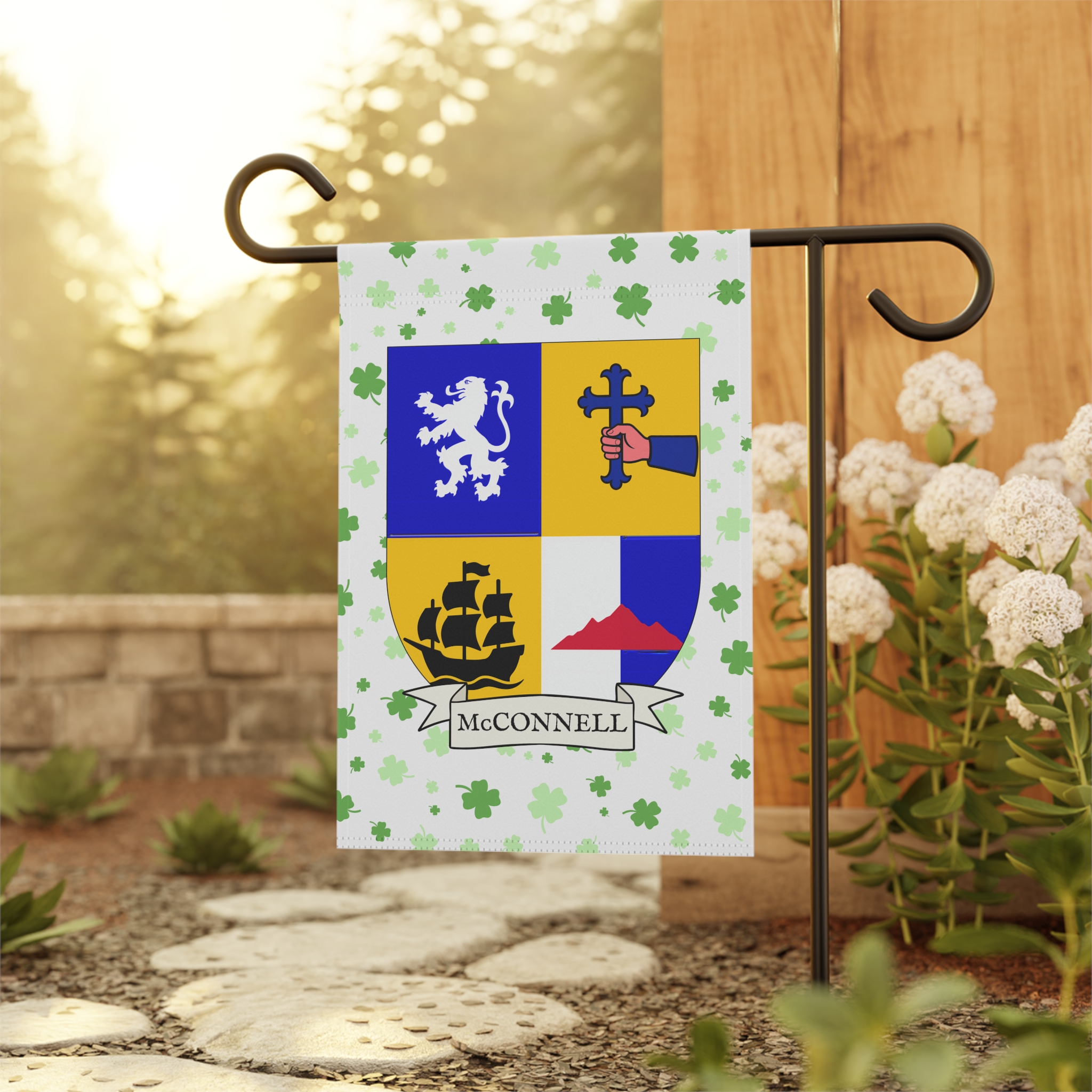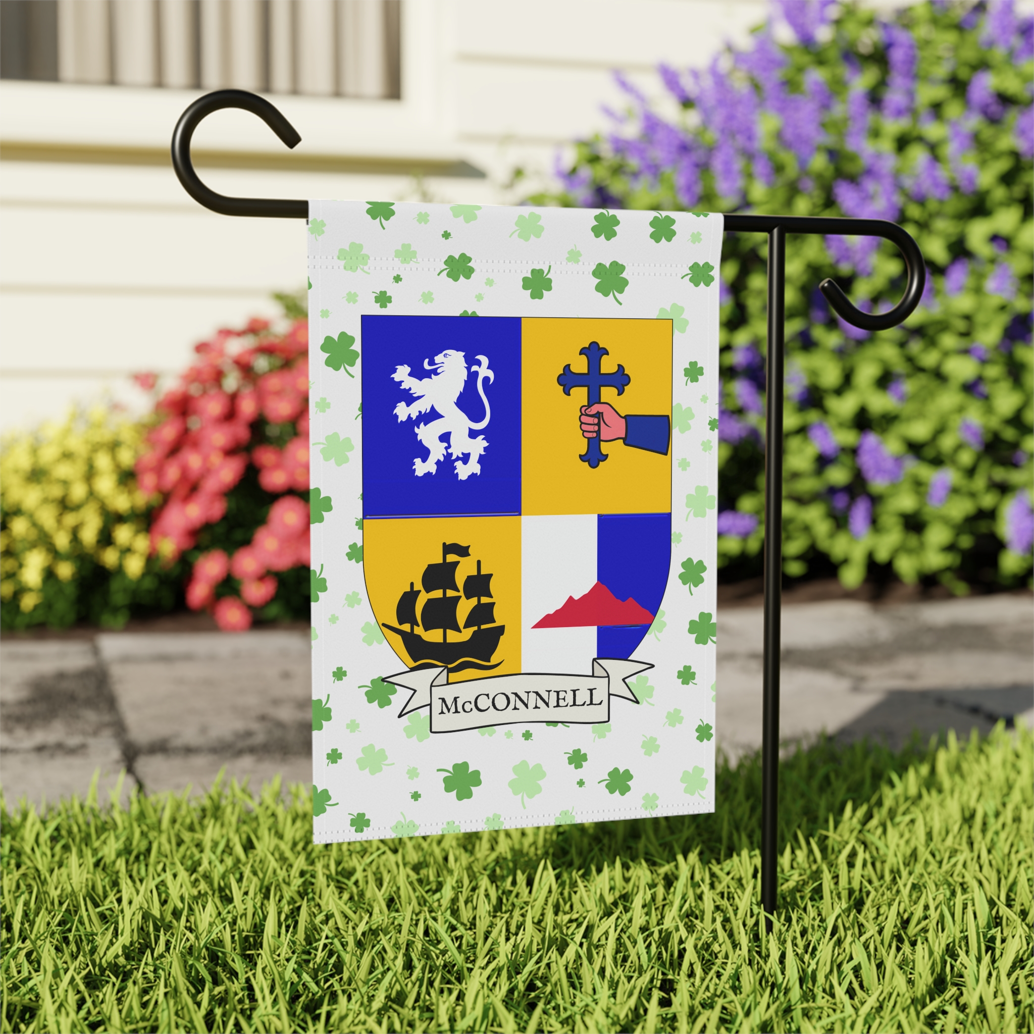 This welcoming Garden Banner will be a great addition to your garden or yard. It displays the McConnell Family Coat of Arms over a subtle background showing a field of four-leaf shamrocks. Both sides show identical images.