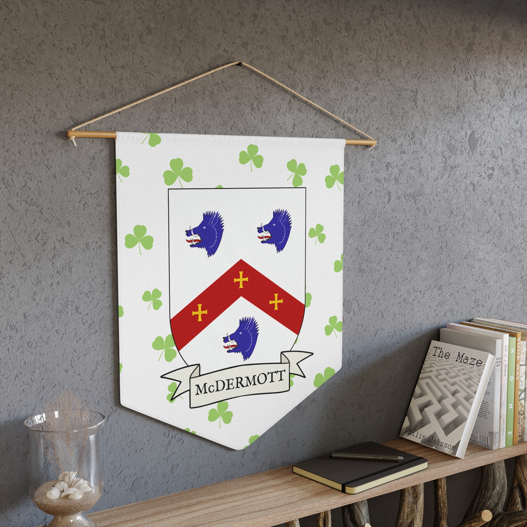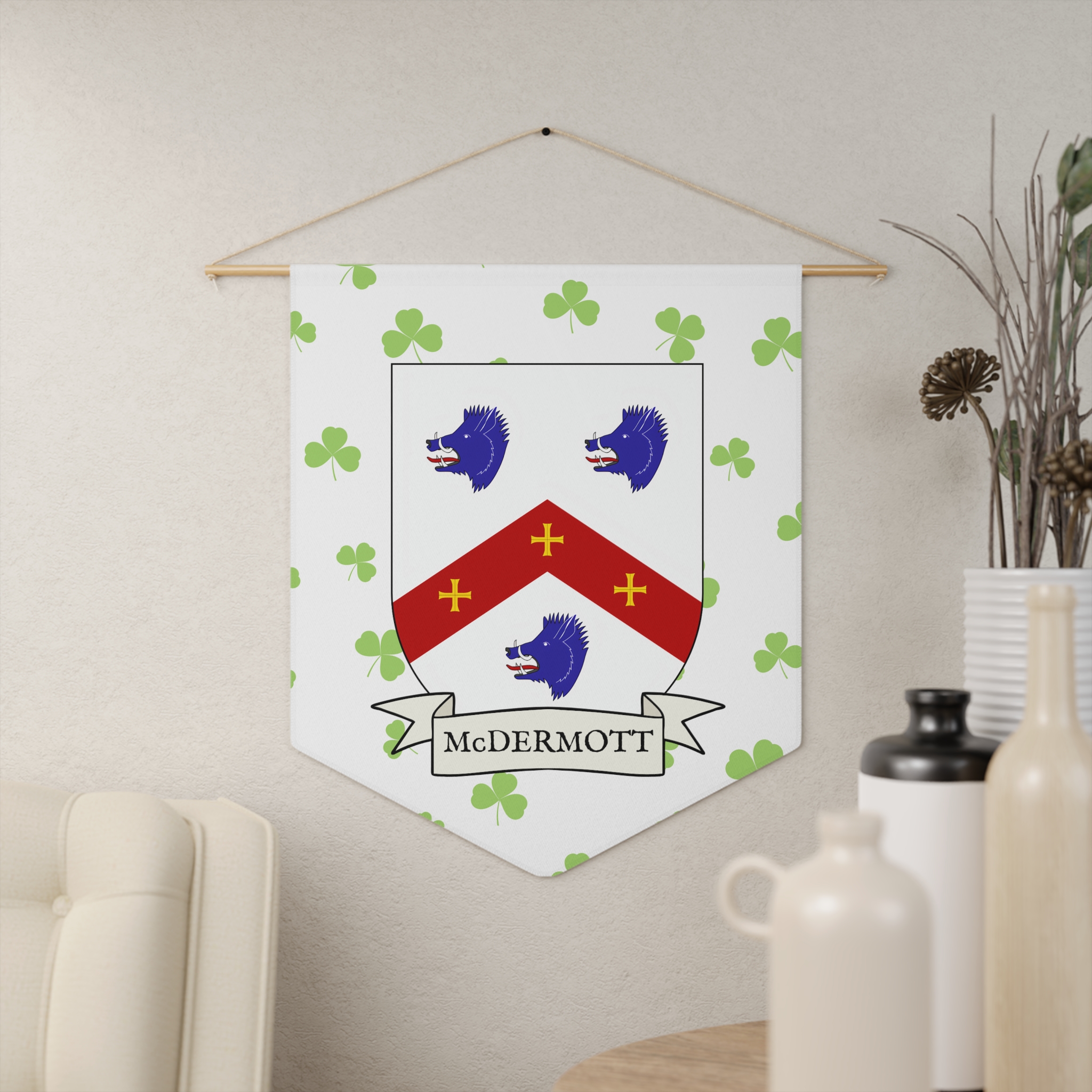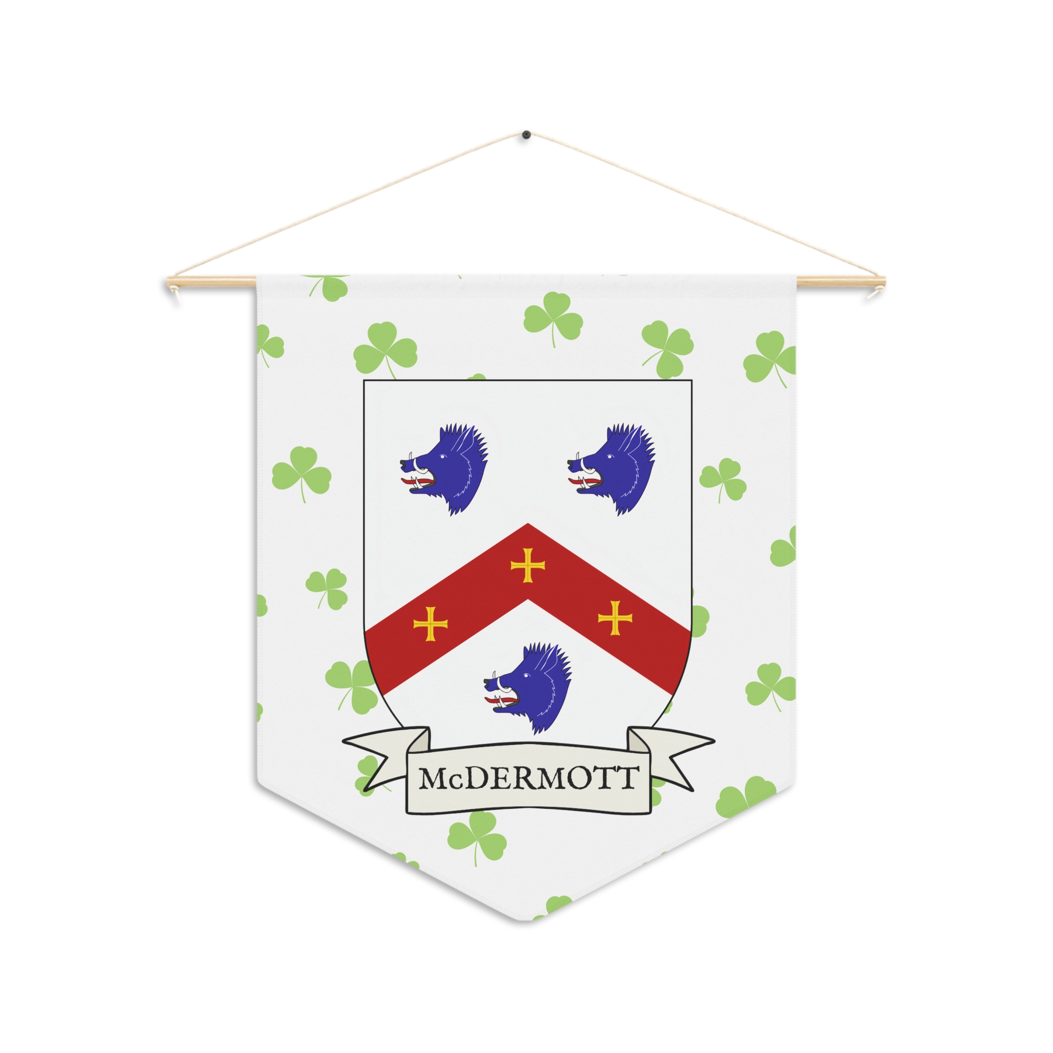 Uplift any room and show off your Irish American roots with this McDermott Family Coat of Arms Indoor Pennant. Pennant is printed on durable poly twill and comes with a wooden dowel/twine frame for easy hanging. Features your family Coat of Arms printed over a restrained shamrock patterned background.