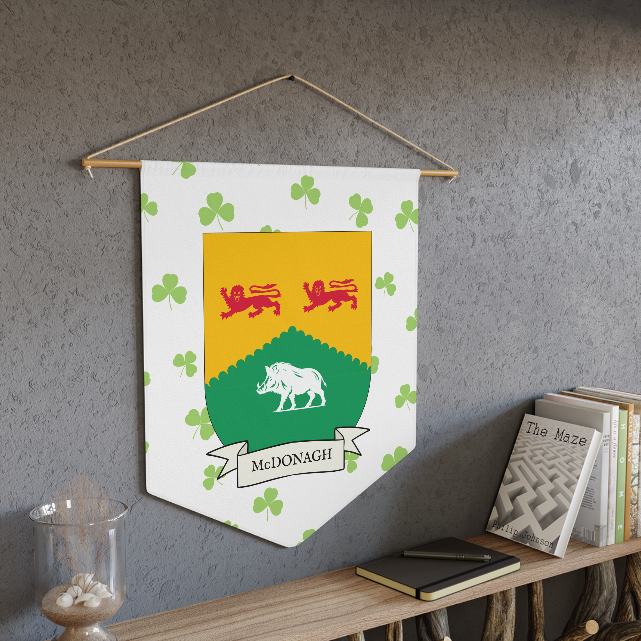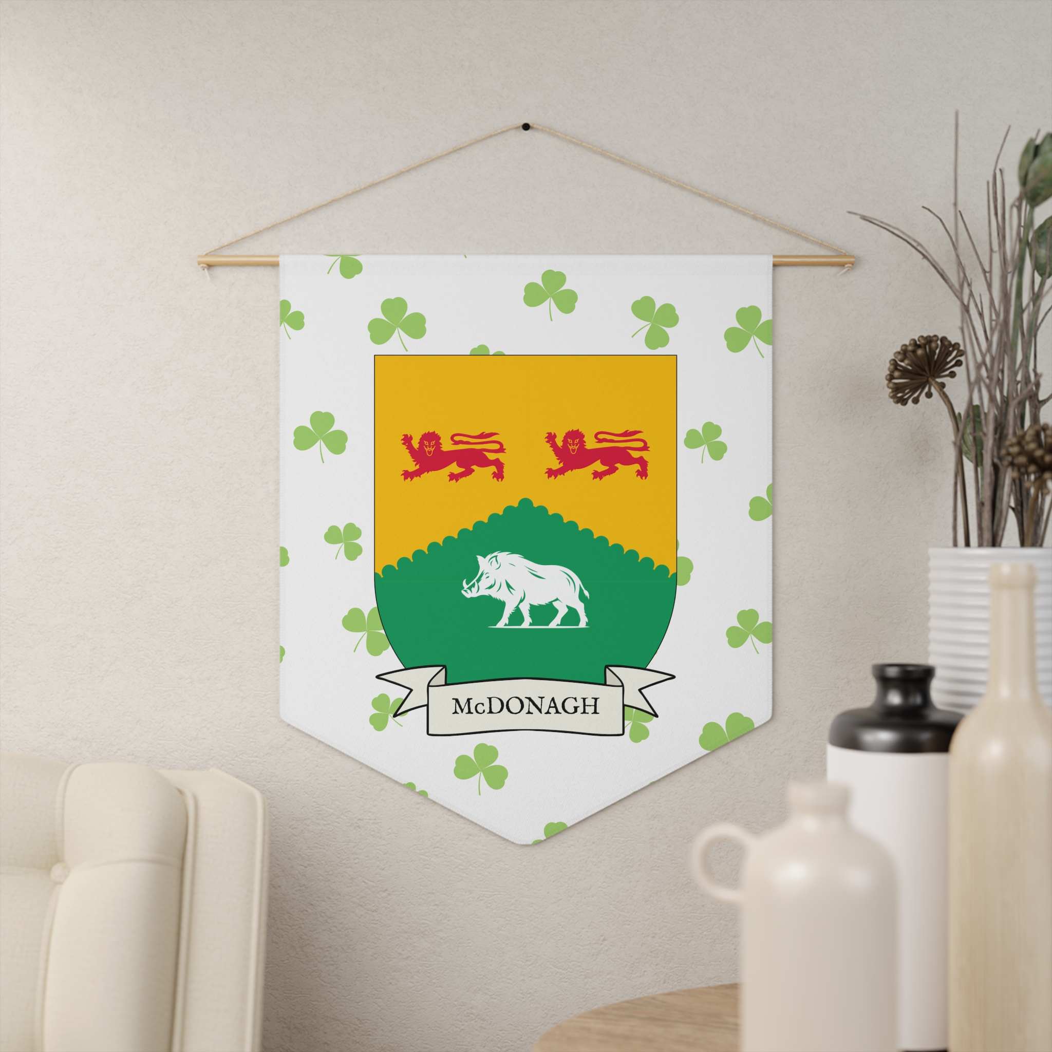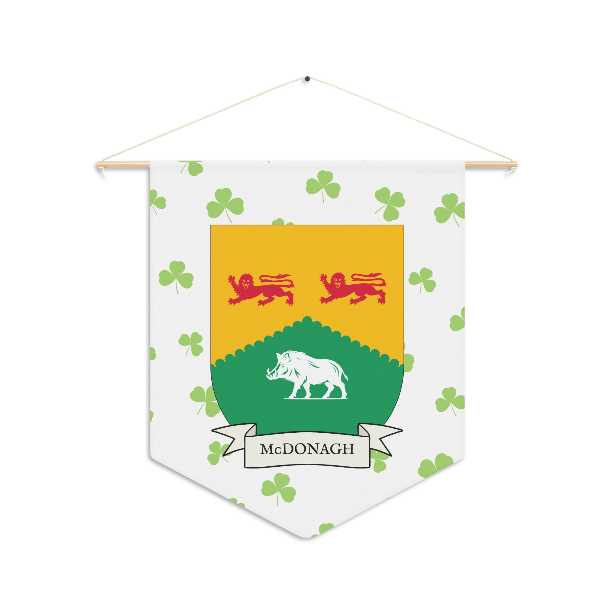 Uplift any room and show off your Irish American roots with this McDonagh Family Coat of Arms Indoor Pennant. Pennant is printed on durable poly twill and comes with a wooden dowel/twine frame for easy hanging. Features your family Coat of Arms printed over a restrained shamrock patterned background.
