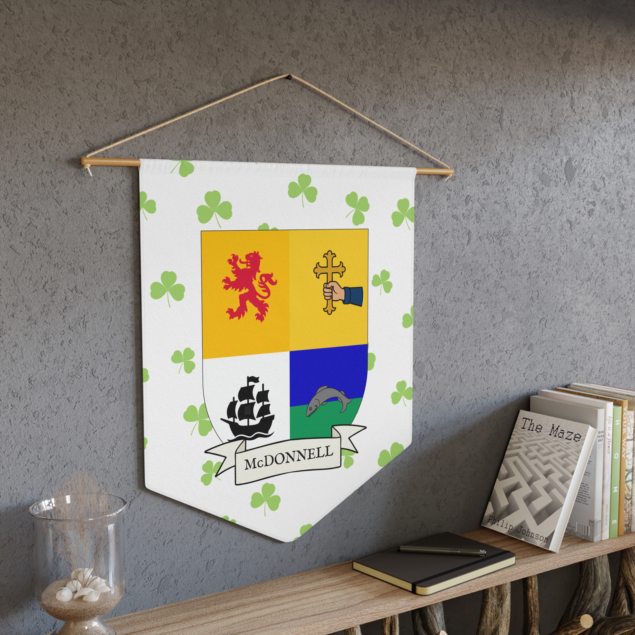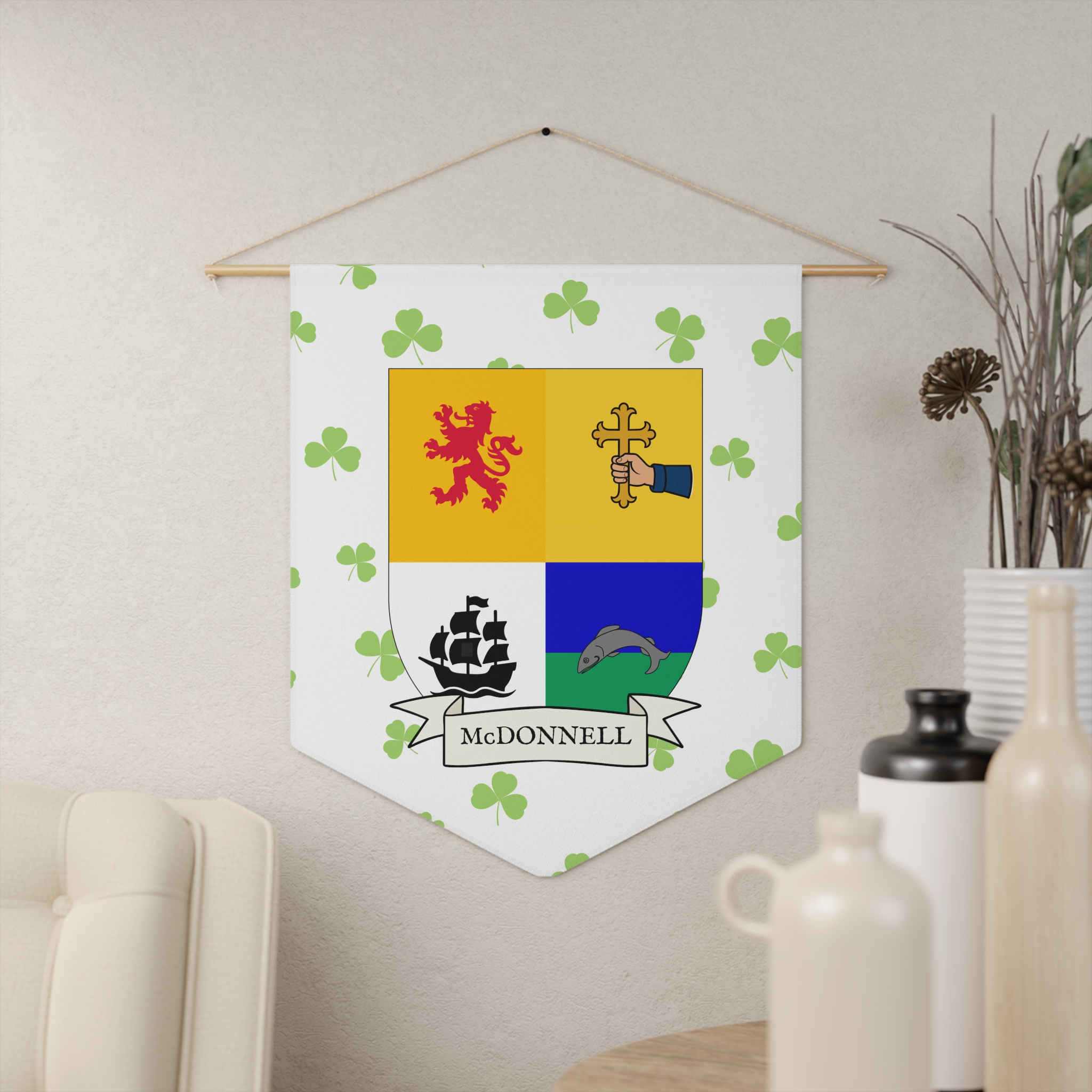 Uplift any room and show off your Irish American roots with this McDonnell Family Coat of Arms Indoor Pennant. Pennant is printed on durable poly twill and comes with a wooden dowel/twine frame for easy hanging. Features your family Coat of Arms printed over a restrained shamrock patterned background.