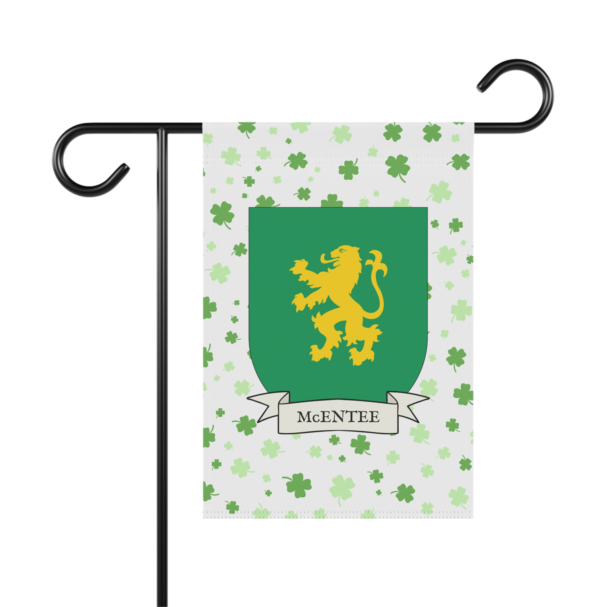 This welcoming Garden Banner will be a great addition to your garden or yard. It displays the McEntee Family Coat of Arms over a subtle background showing a field of four-leaf shamrocks. Both sides show identical images.