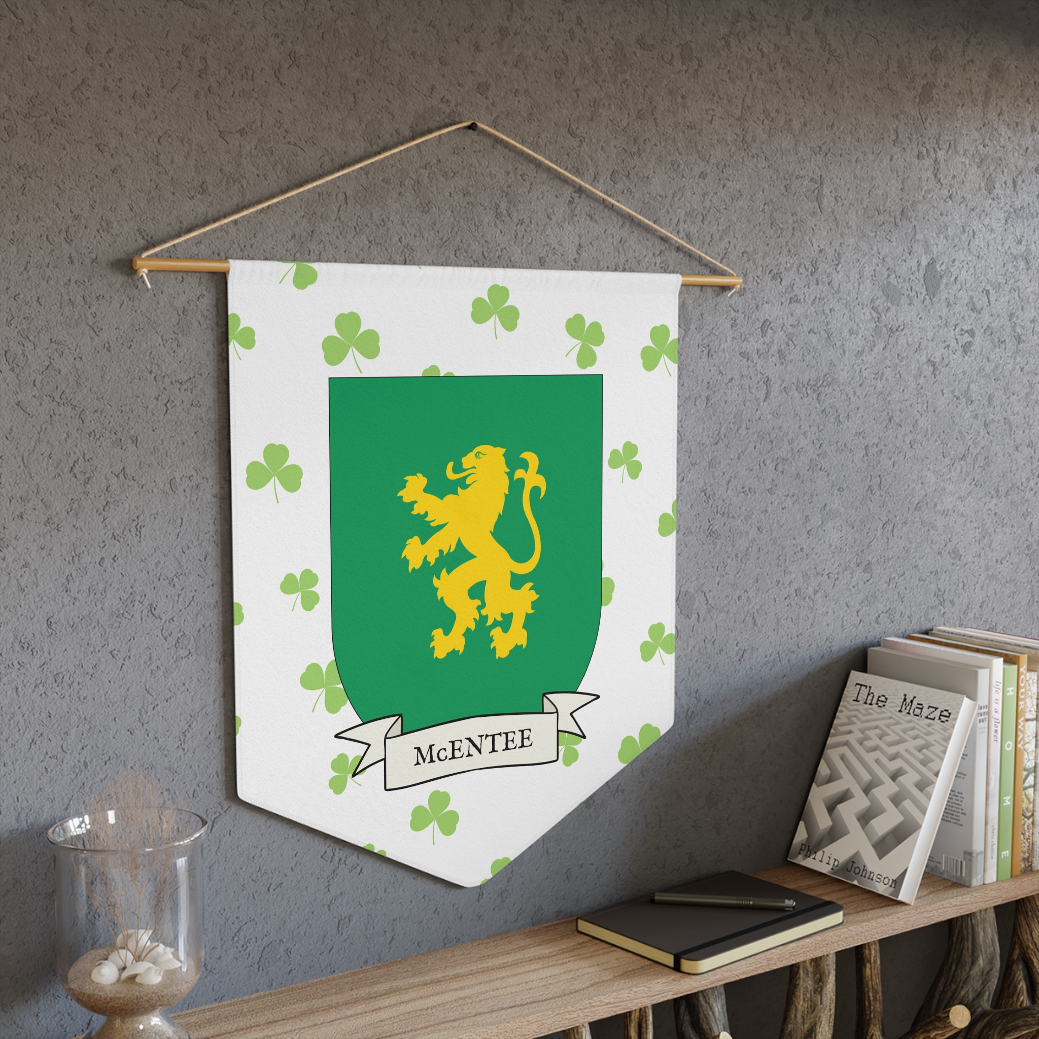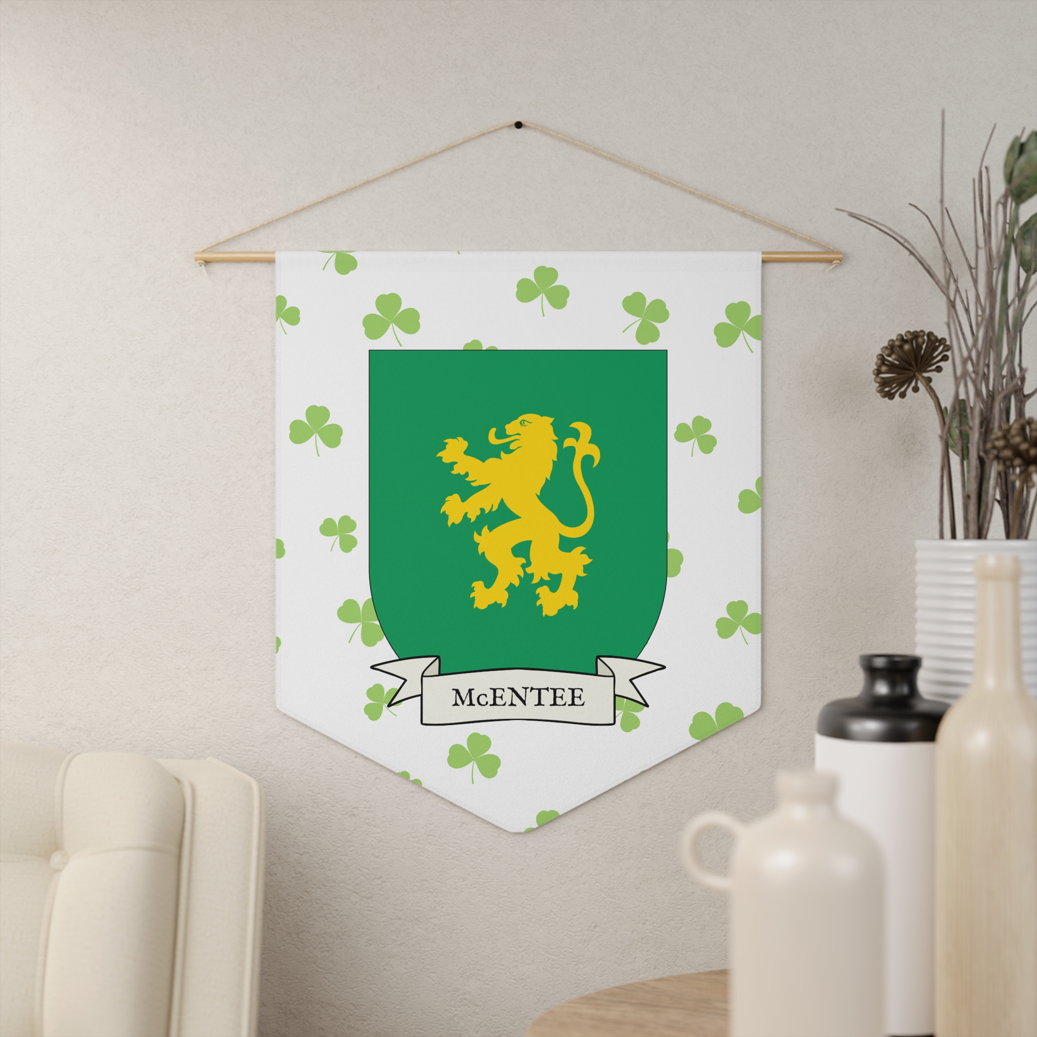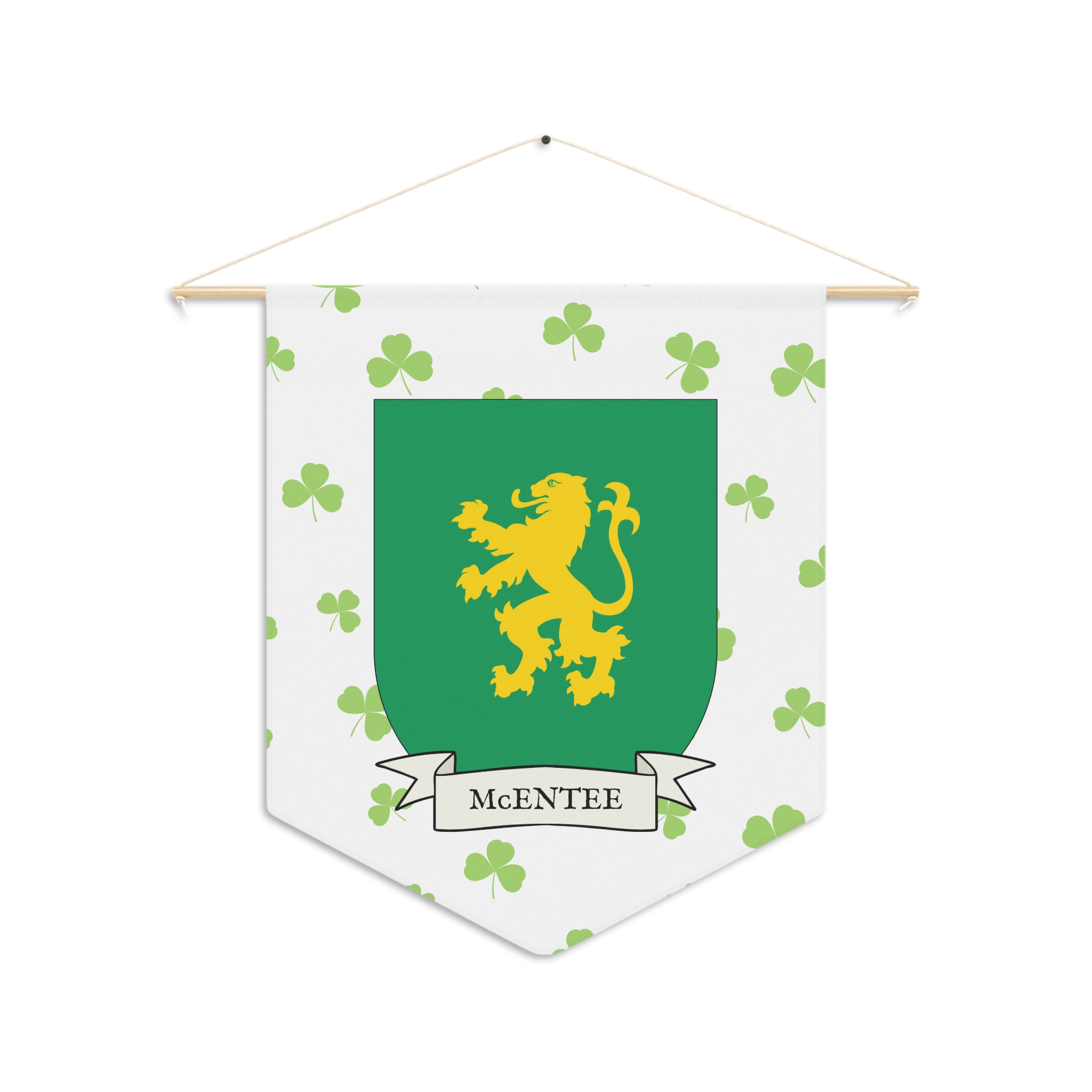 Uplift any room and show off your Irish American roots with this McEntee Family Coat of Arms Indoor Pennant. Pennant is printed on durable poly twill and comes with a wooden dowel/twine frame for easy hanging. Features your family Coat of Arms printed over a restrained shamrock patterned background.