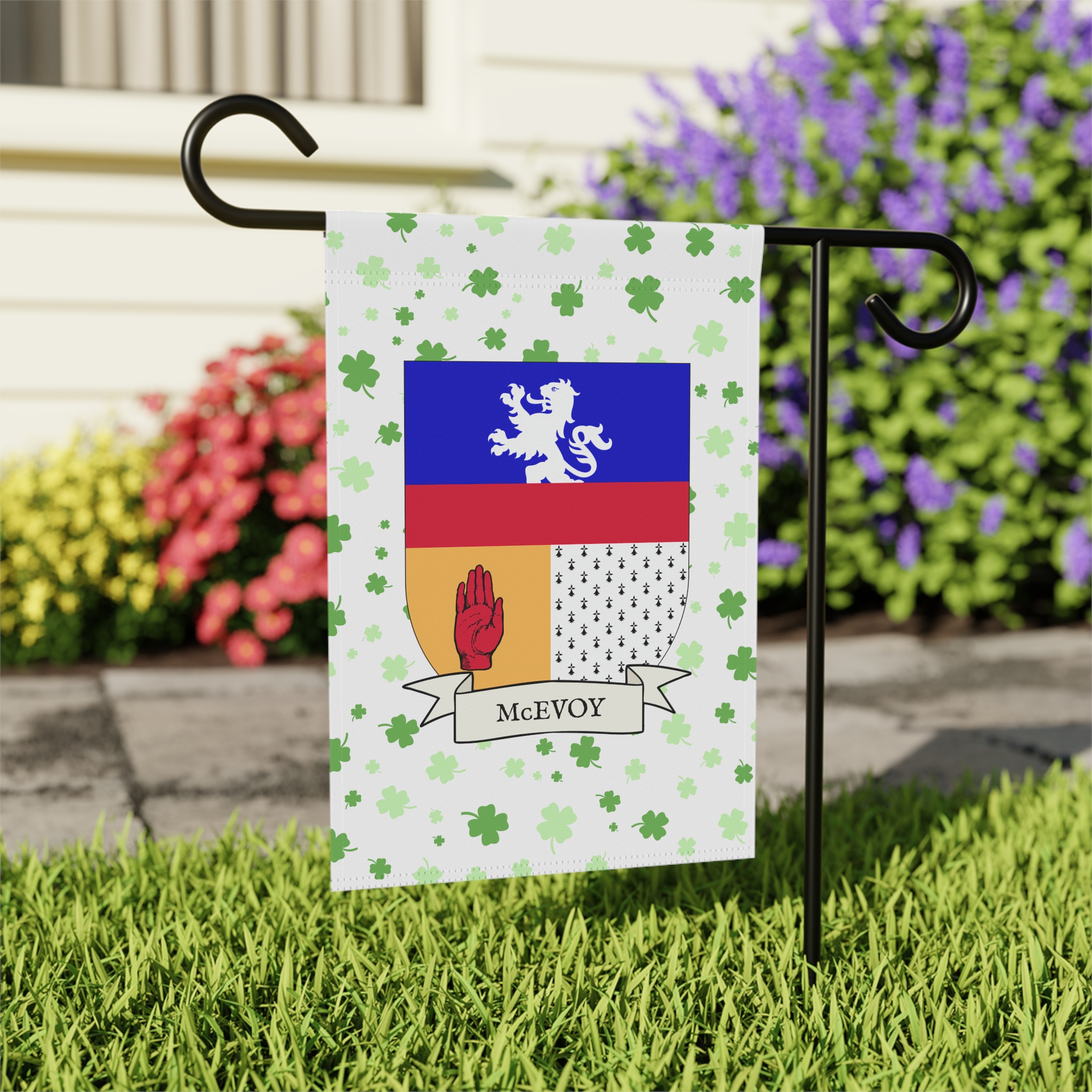 This welcoming Garden Banner will be a great addition to your garden or yard. It displays the McEvoy Family Coat of Arms over a subtle background showing a field of four-leaf shamrocks. Both sides show identical images.