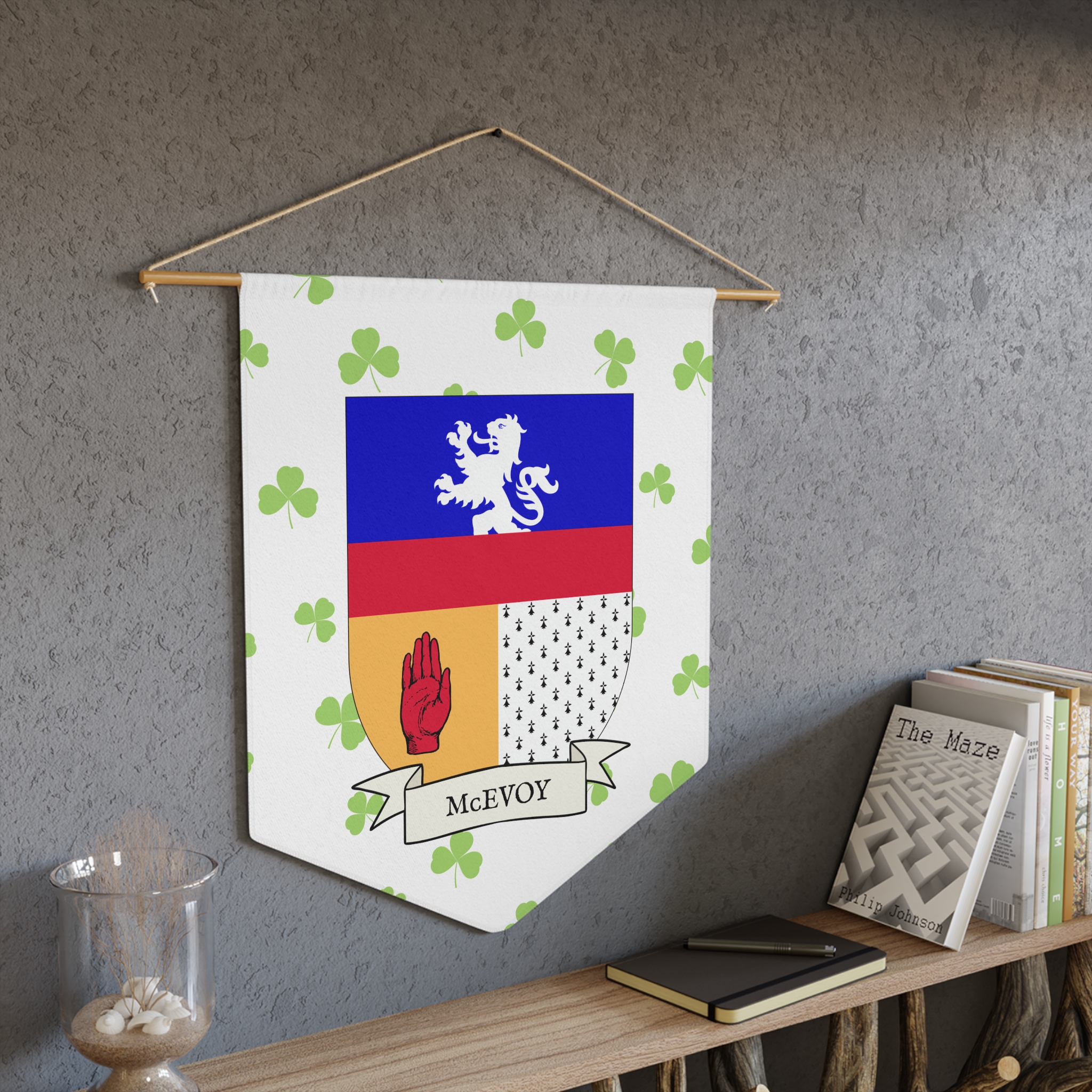 Uplift any room and show off your Irish American roots with this McEvoy Family Coat of Arms Indoor Pennant. Pennant is printed on durable poly twill and comes with a wooden dowel/twine frame for easy hanging. Features your family Coat of Arms printed over a restrained shamrock patterned background.