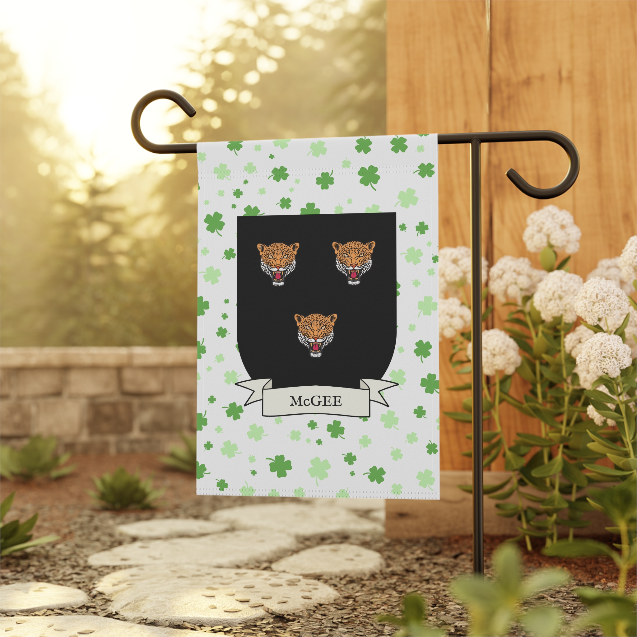 This welcoming Garden Banner will be a great addition to your garden or yard. It displays the McGee Family Coat of Arms over a subtle background showing a field of four-leaf shamrocks. Both sides show identical images.