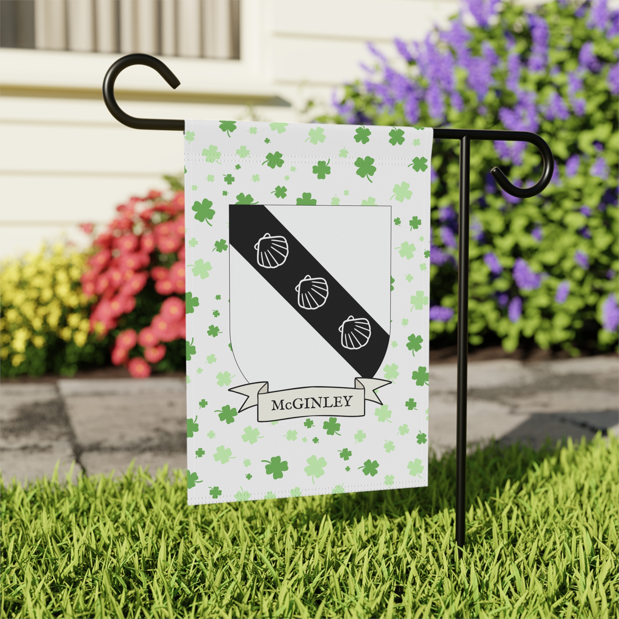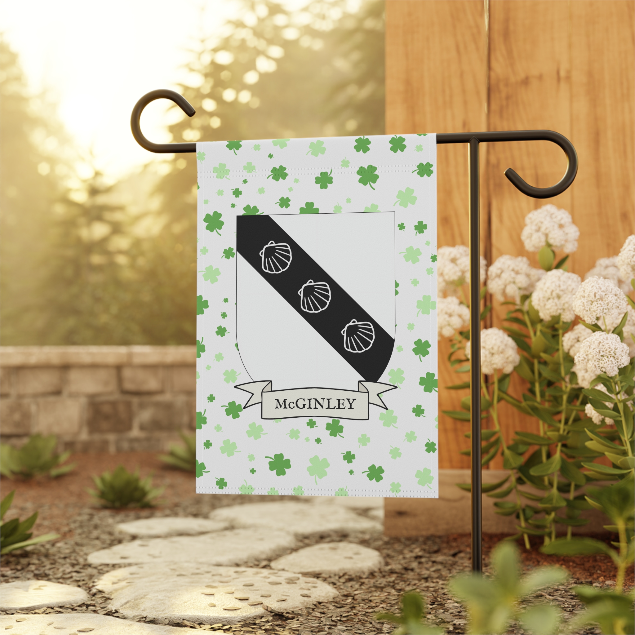 This welcoming Garden Banner will be a great addition to your garden or yard. It displays the McGinley Family Coat of Arms over a subtle background showing a field of four-leaf shamrocks. Both sides show identical images.