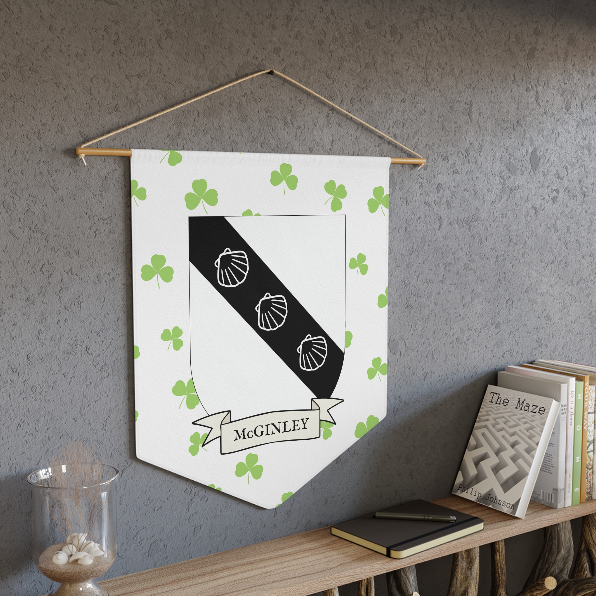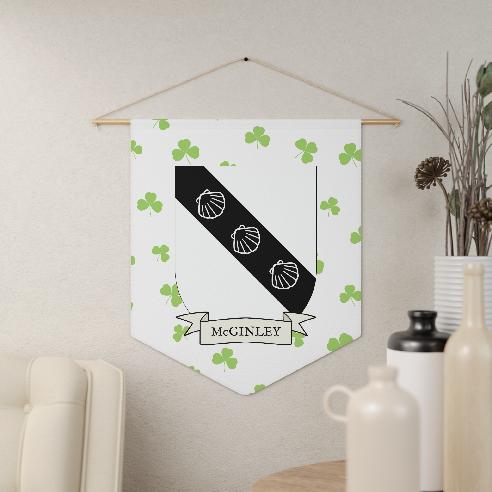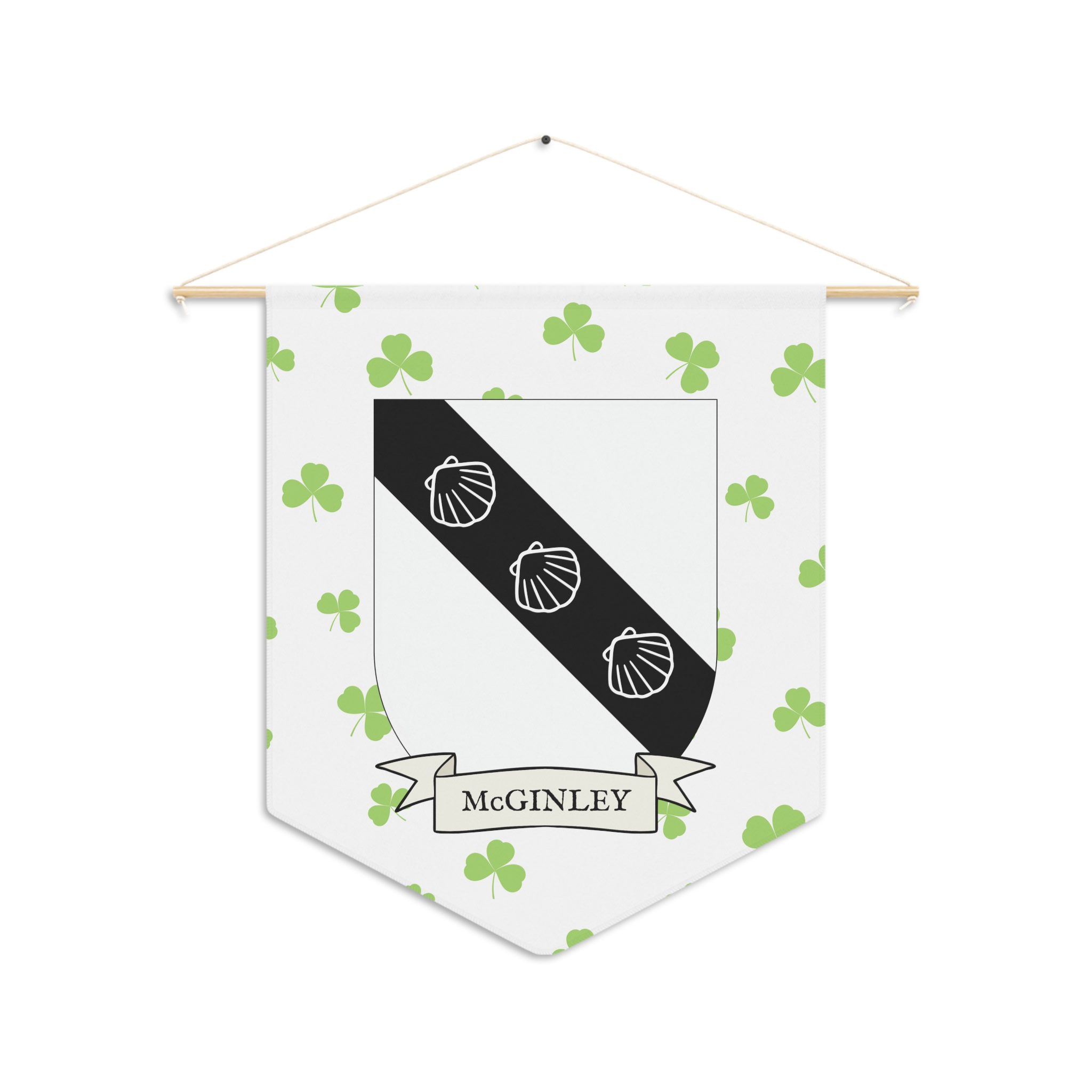 Uplift any room and show off your Irish American roots with this McGinley Family Coat of Arms Indoor Pennant. Pennant is printed on durable poly twill and comes with a wooden dowel/twine frame for easy hanging. Features your family Coat of Arms printed over a restrained shamrock patterned background.