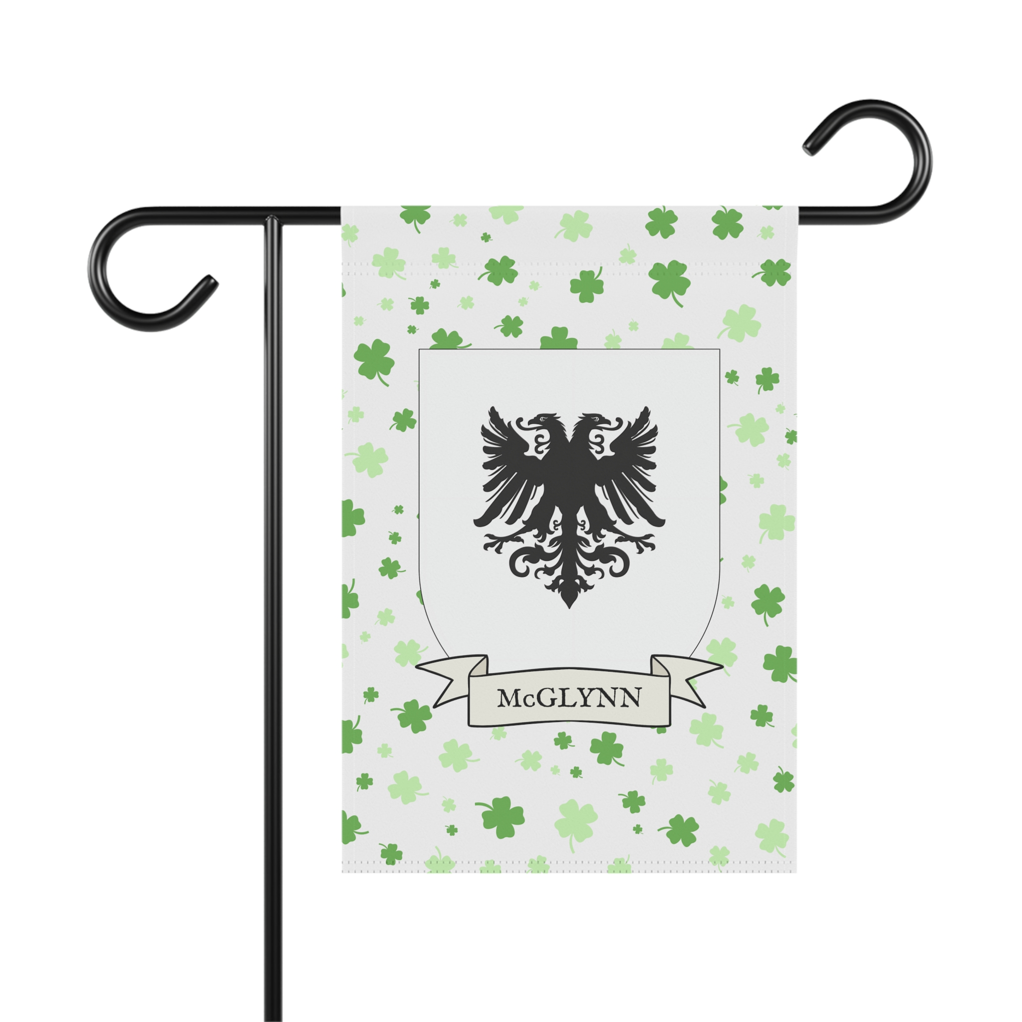 This welcoming Garden Banner will be a great addition to your garden or yard. It displays the McGlynn Family Coat of Arms over a subtle background showing a field of four-leaf shamrocks. Both sides show identical images.