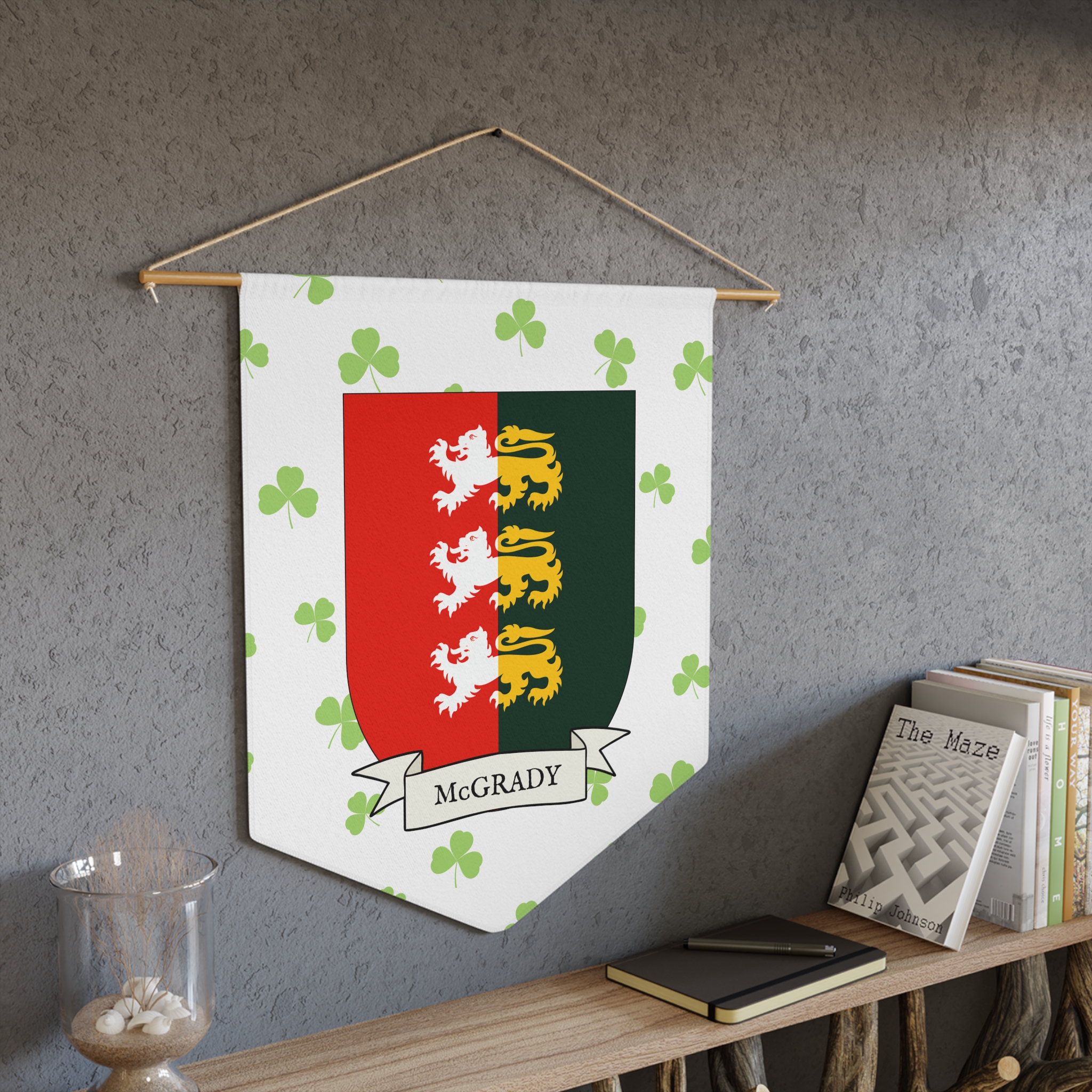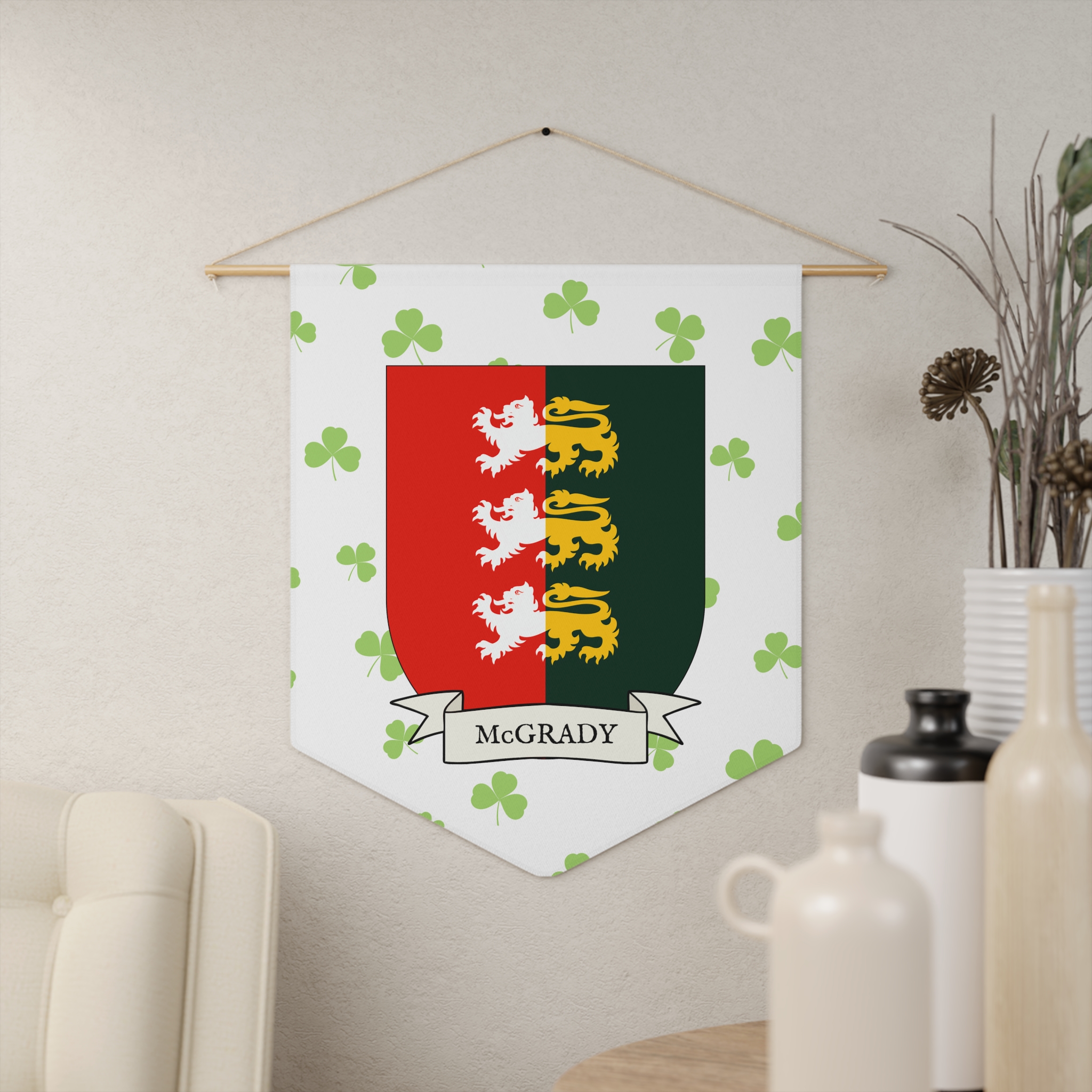 Uplift any room and show off your Irish American roots with this McGrady Family Coat of Arms Indoor Pennant. Pennant is printed on durable poly twill and comes with a wooden dowel/twine frame for easy hanging. Features your family Coat of Arms printed over a restrained shamrock patterned background.