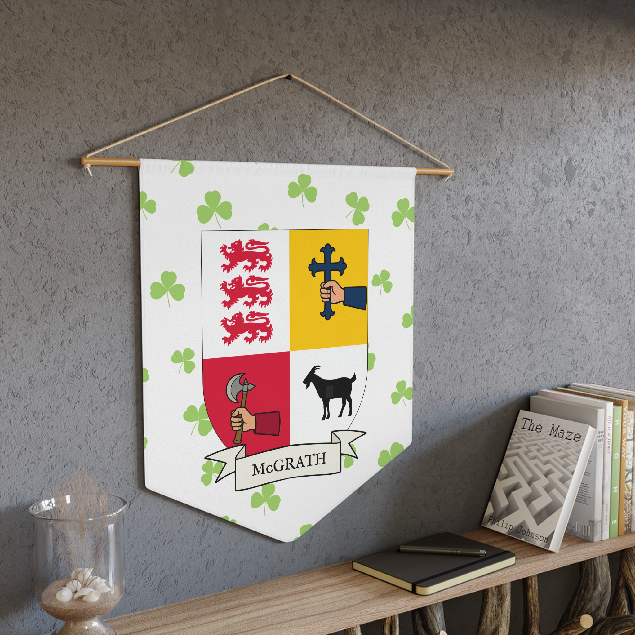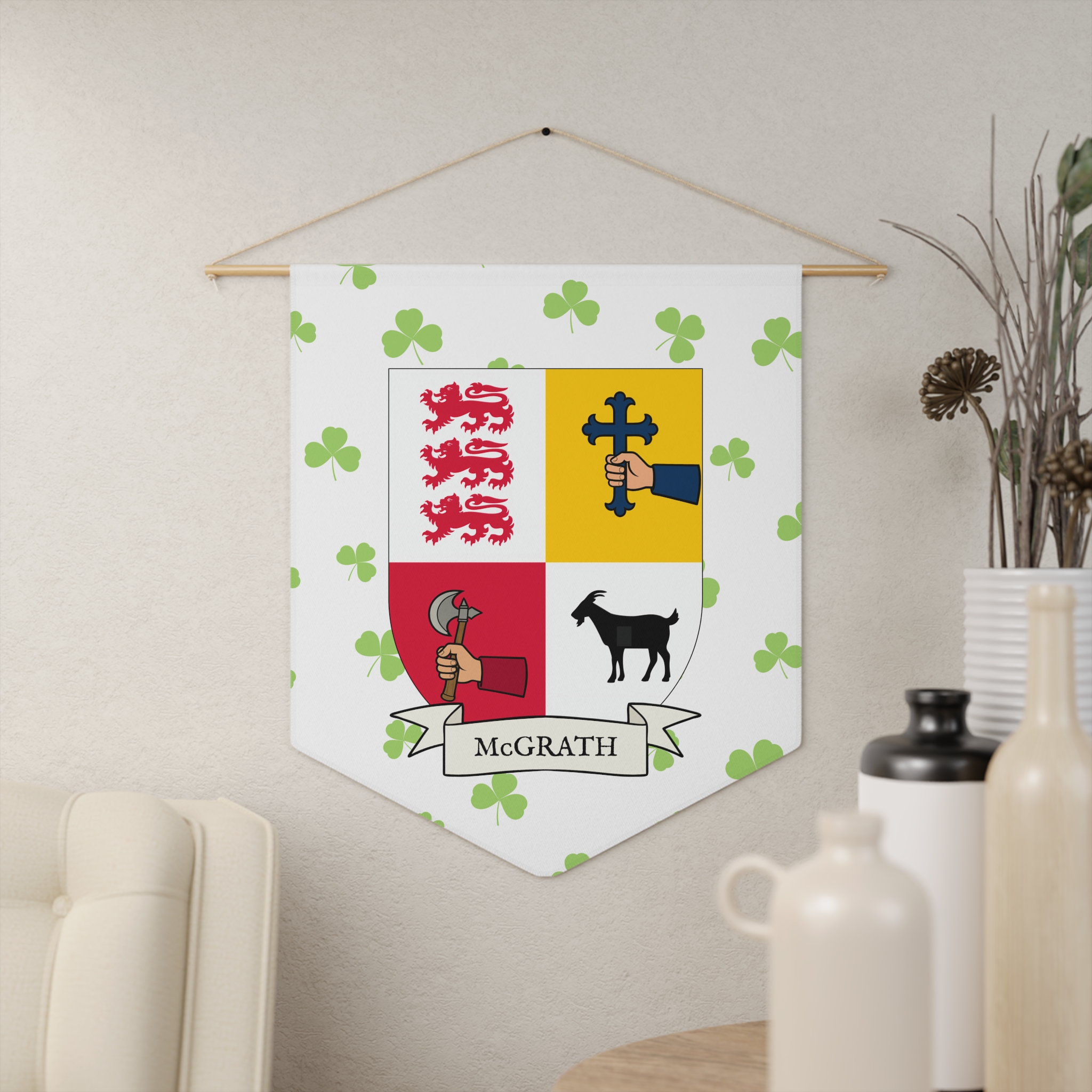 Uplift any room and show off your Irish American roots with this McGrath Family Coat of Arms Indoor Pennant. Pennant is printed on durable poly twill and comes with a wooden dowel/twine frame for easy hanging. Features your family Coat of Arms printed over a restrained shamrock patterned background.