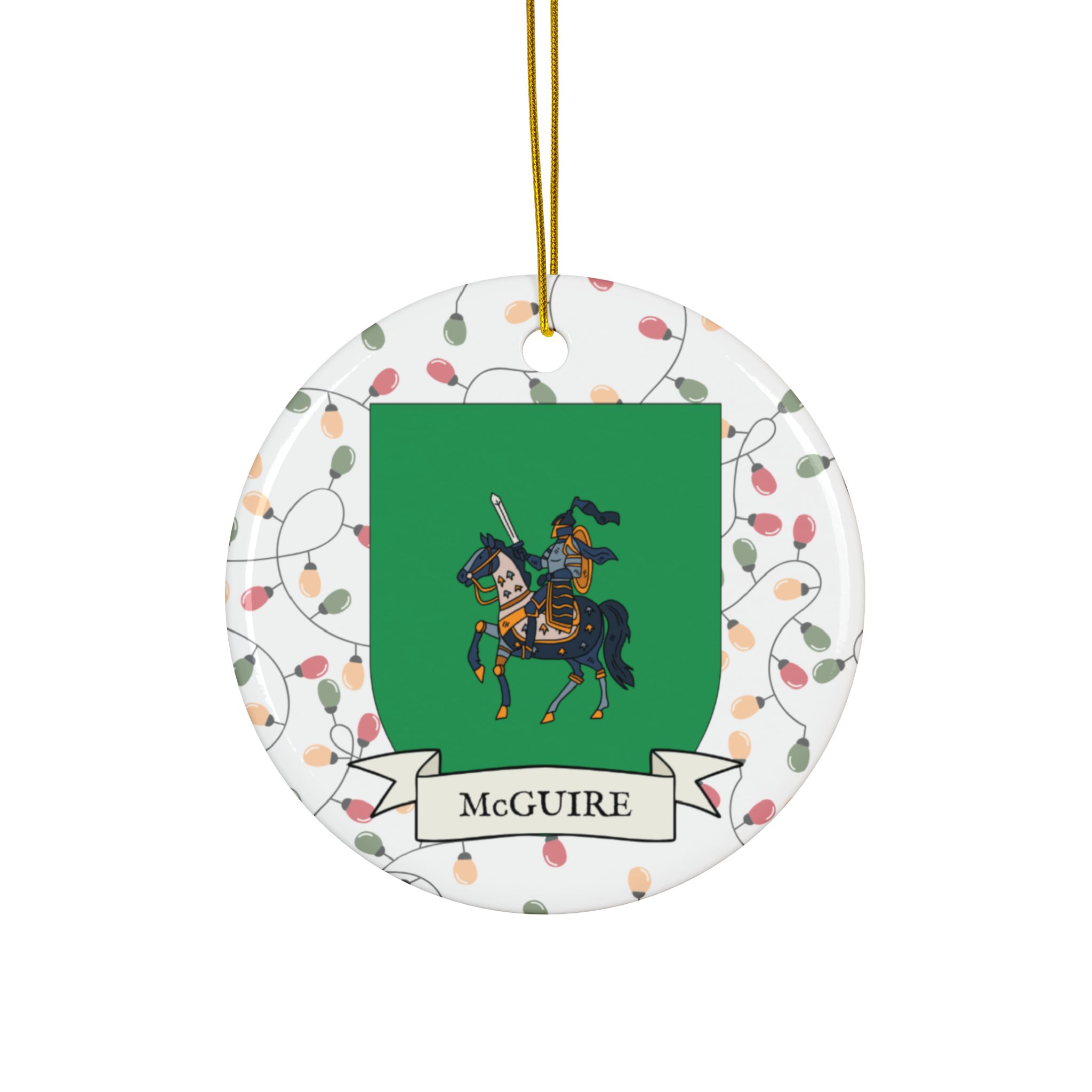 Celebrate the Holidays (and your Irish Heritage) with Irish Family Coat of Arms Christmas Tree Ornaments! Your family’s coat of arms printed on a 100% ceramic ornament with a festive Christmas Tree lights background. Great gift idea for the Irish Americans in your life. It’s sure to become a Christmas tradition!