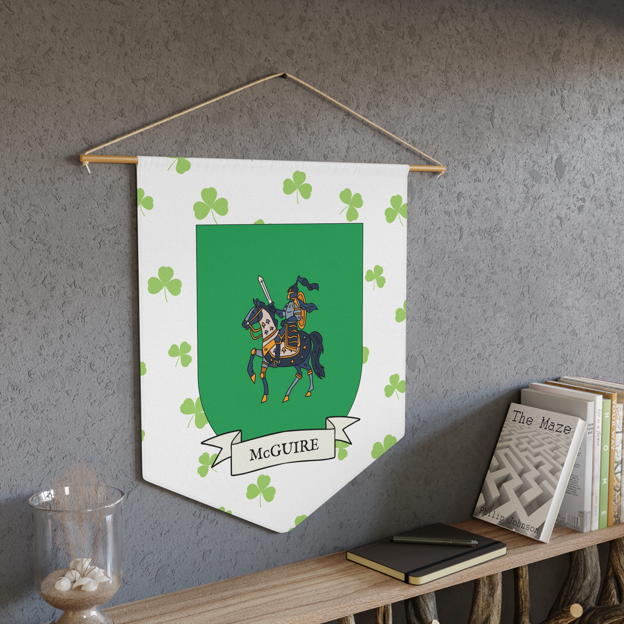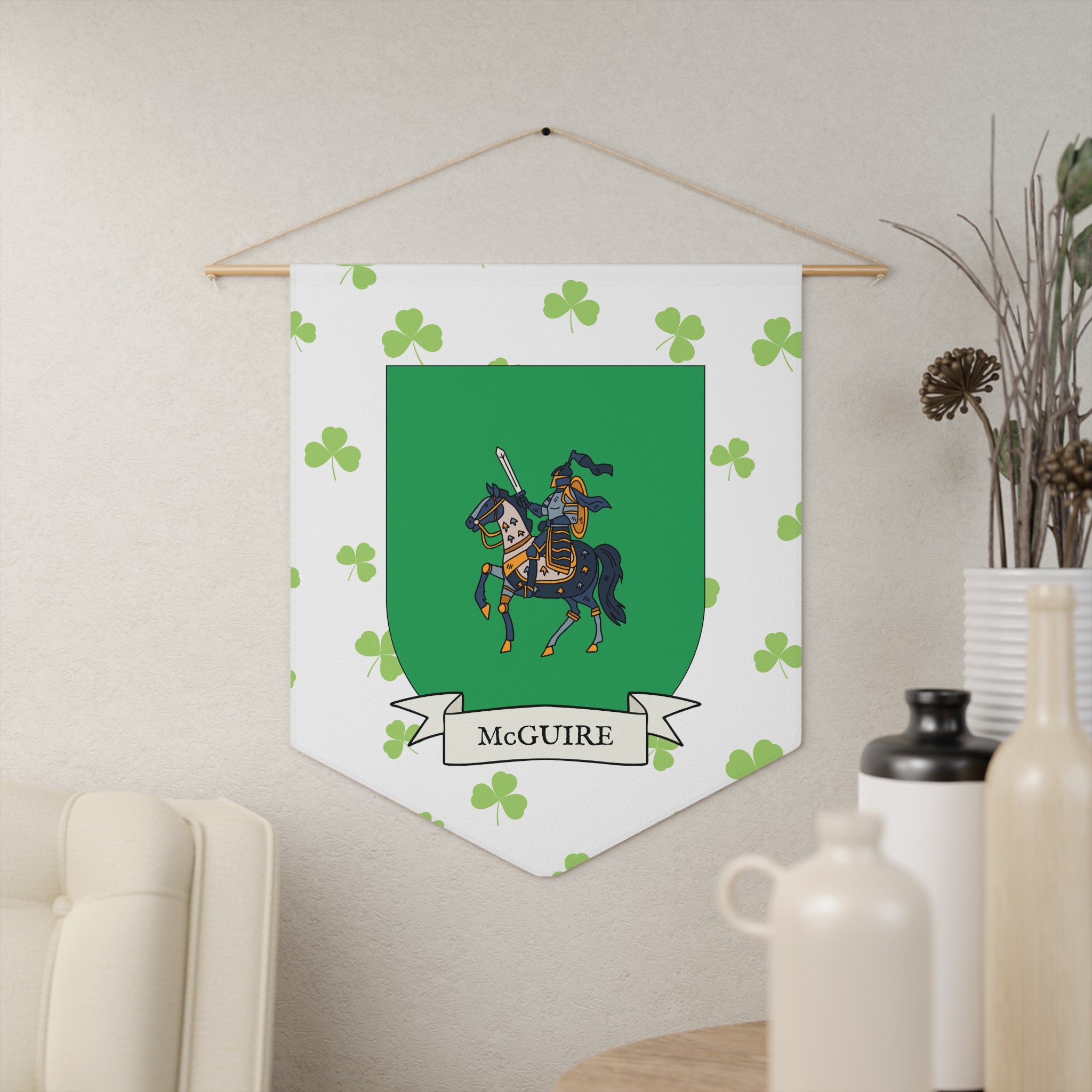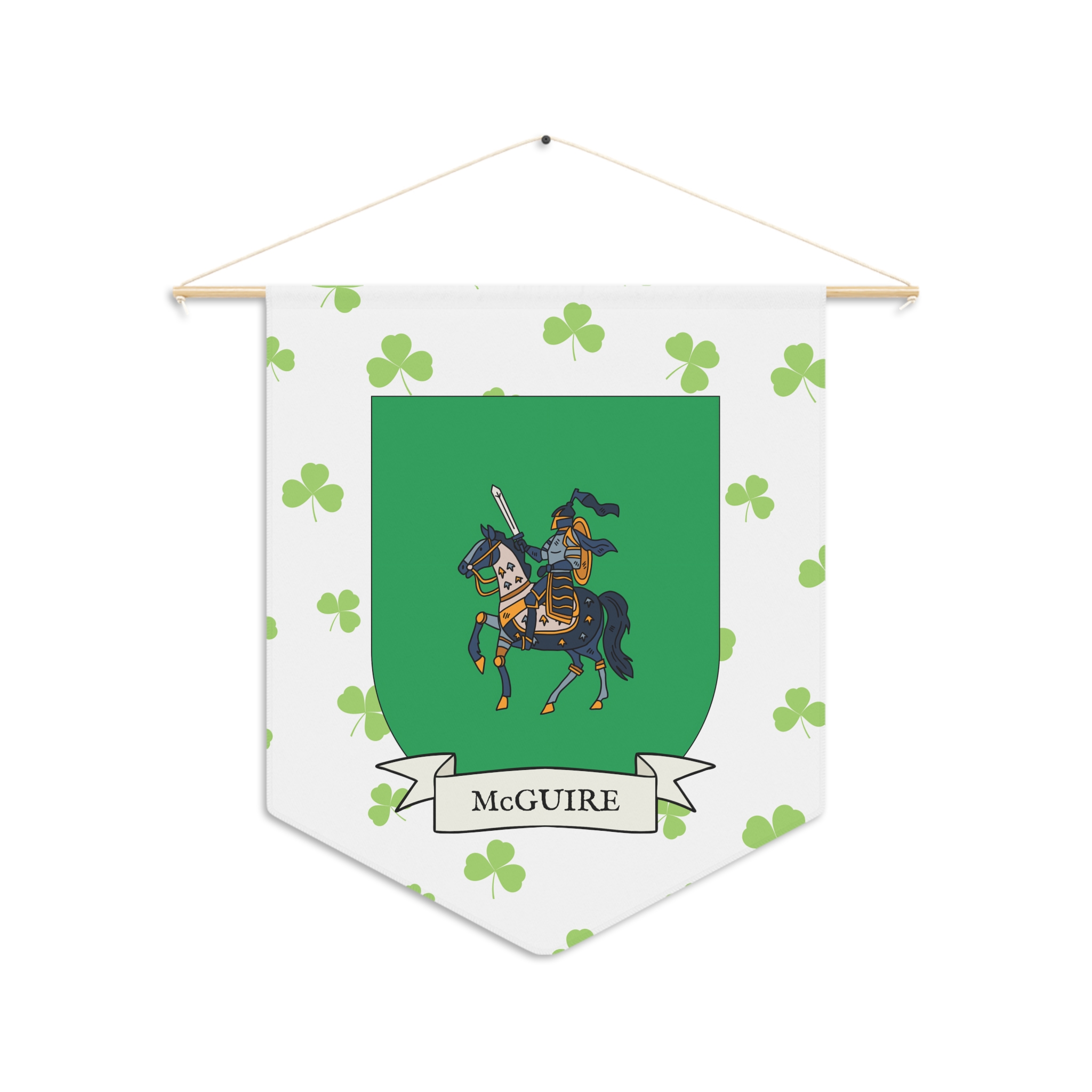 Uplift any room and show off your Irish American roots with this McGuire Family Coat of Arms Indoor Pennant. Pennant is printed on durable poly twill and comes with a wooden dowel/twine frame for easy hanging. Features your family Coat of Arms printed over a restrained shamrock patterned background.