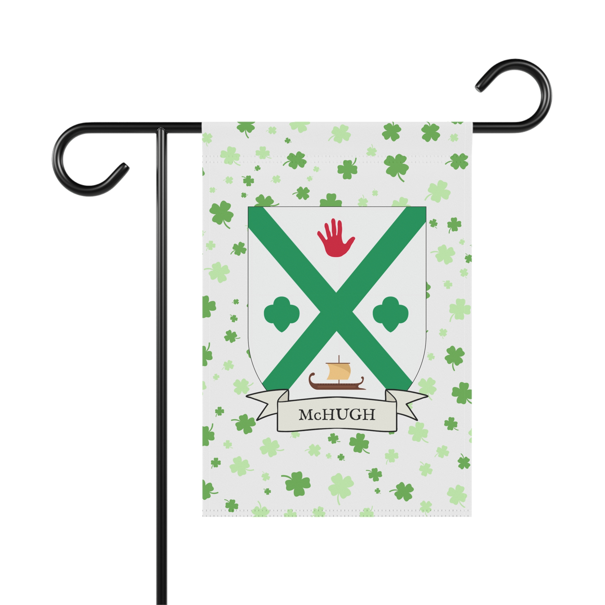 This welcoming Garden Banner will be a great addition to your garden or yard. It displays the McHugh Family Coat of Arms over a subtle background showing a field of four-leaf shamrocks. Both sides show identical images.