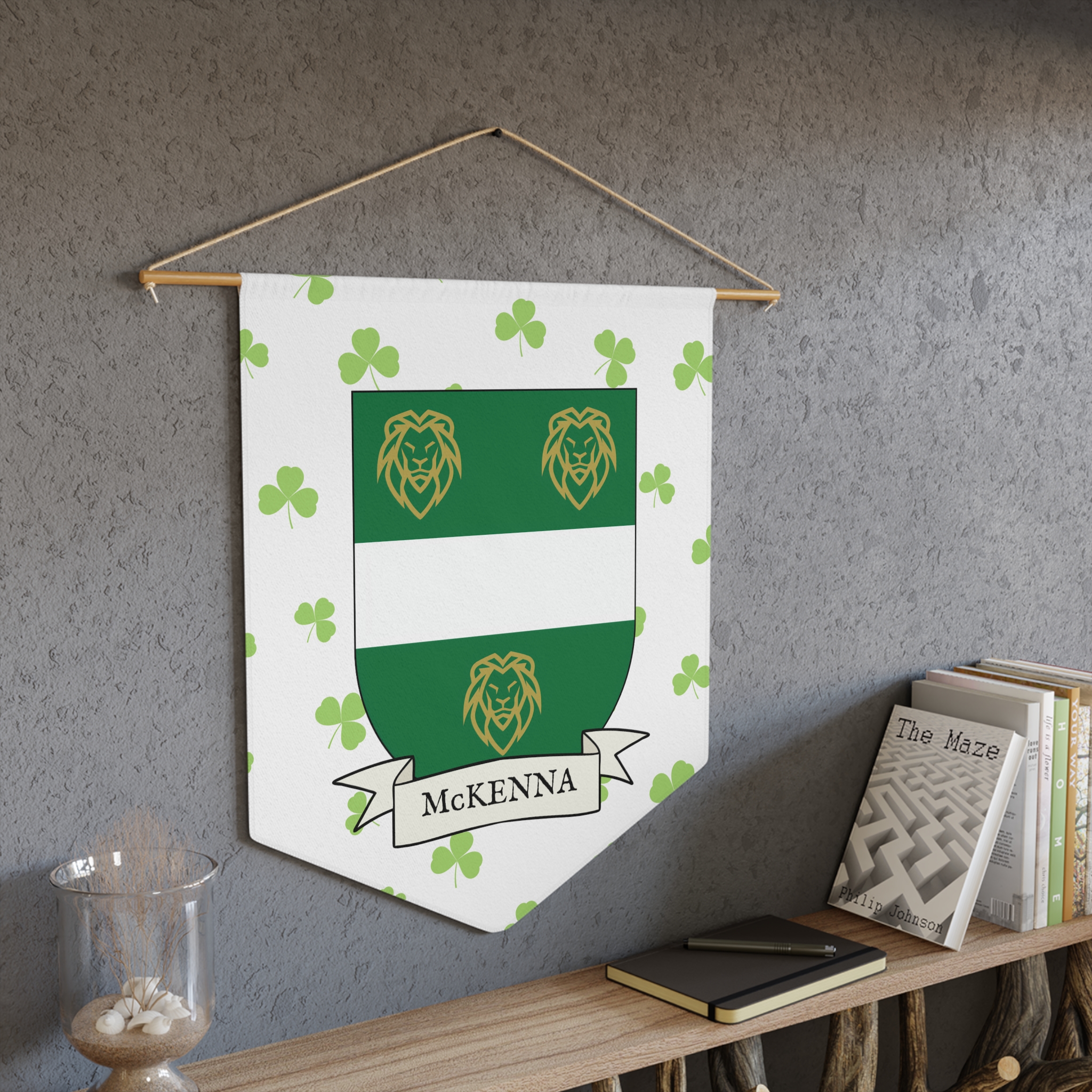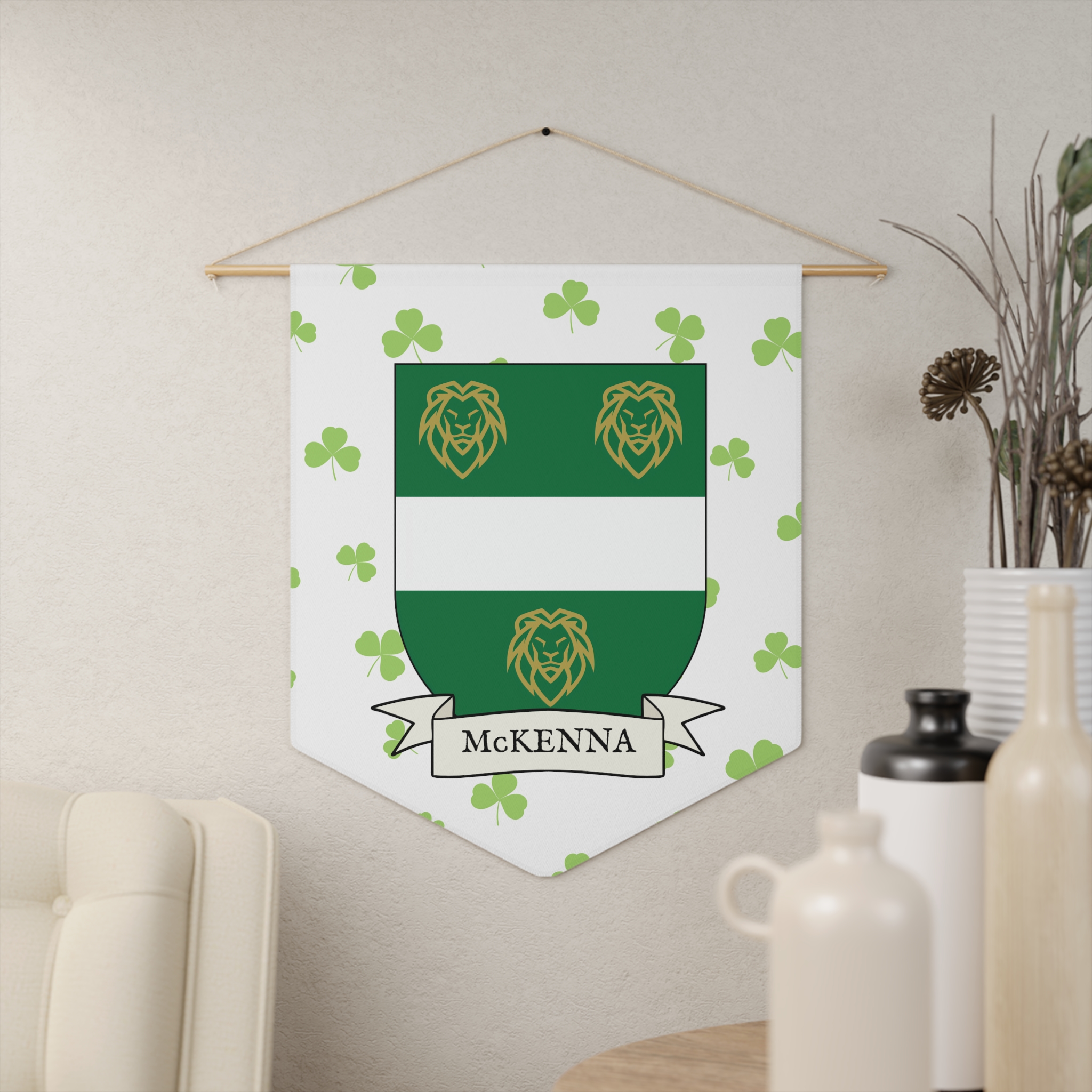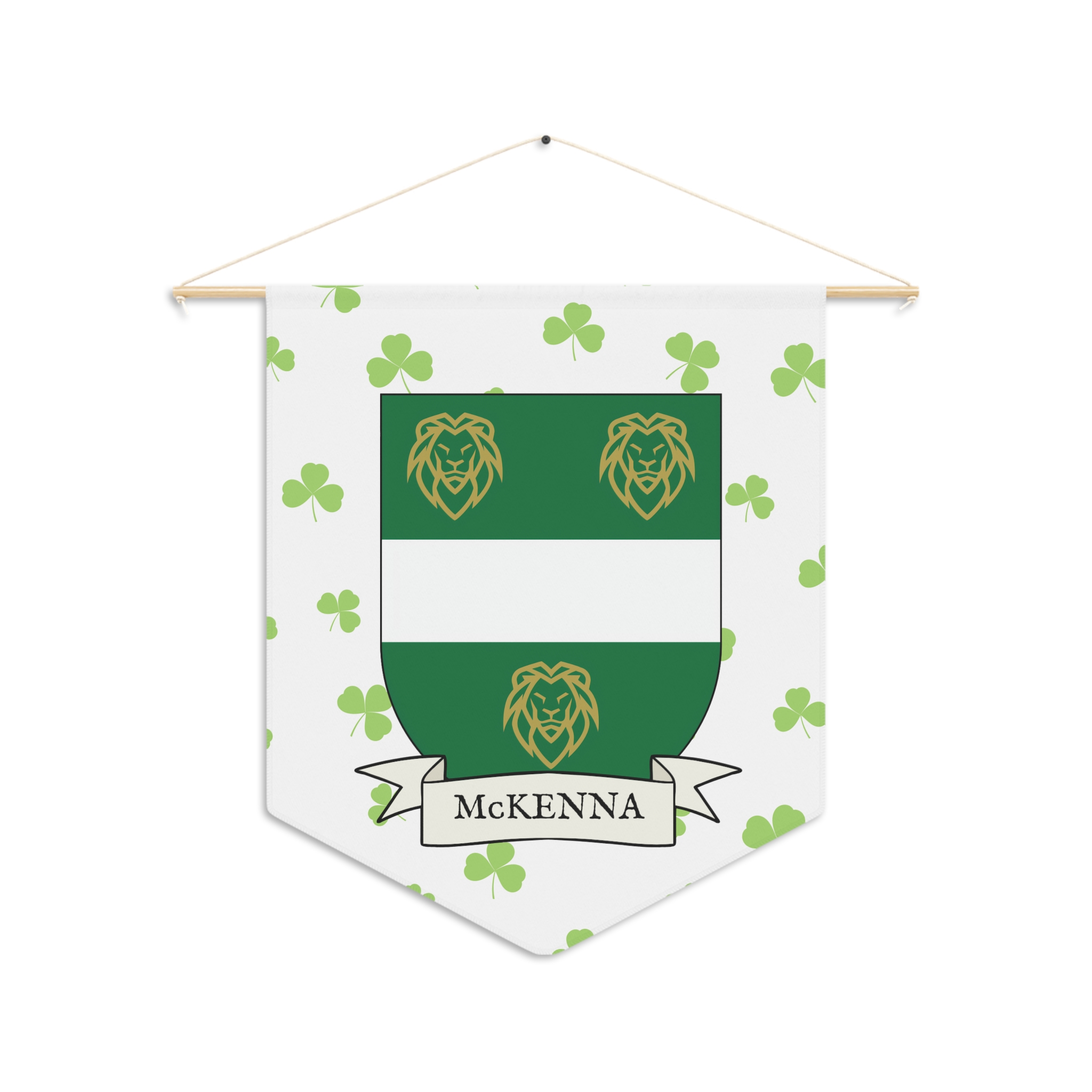 Uplift any room and show off your Irish American roots with this McKenna Family Coat of Arms Indoor Pennant. Pennant is printed on durable poly twill and comes with a wooden dowel/twine frame for easy hanging. Features your family Coat of Arms printed over a restrained shamrock patterned background.