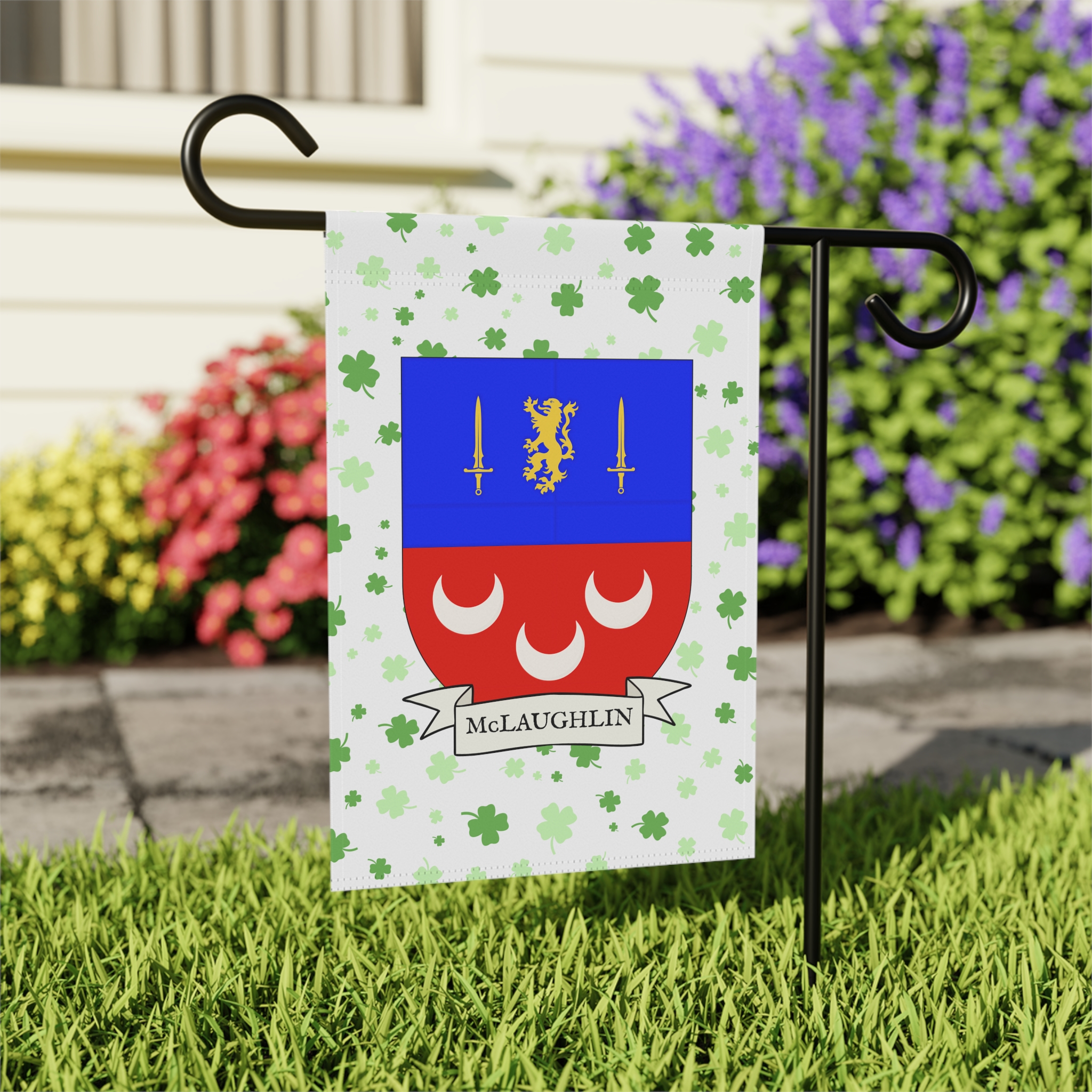 This welcoming Garden Banner will be a great addition to your garden or yard. It displays the McLaughlin Family Coat of Arms over a subtle background showing a field of four-leaf shamrocks. Both sides show identical images.