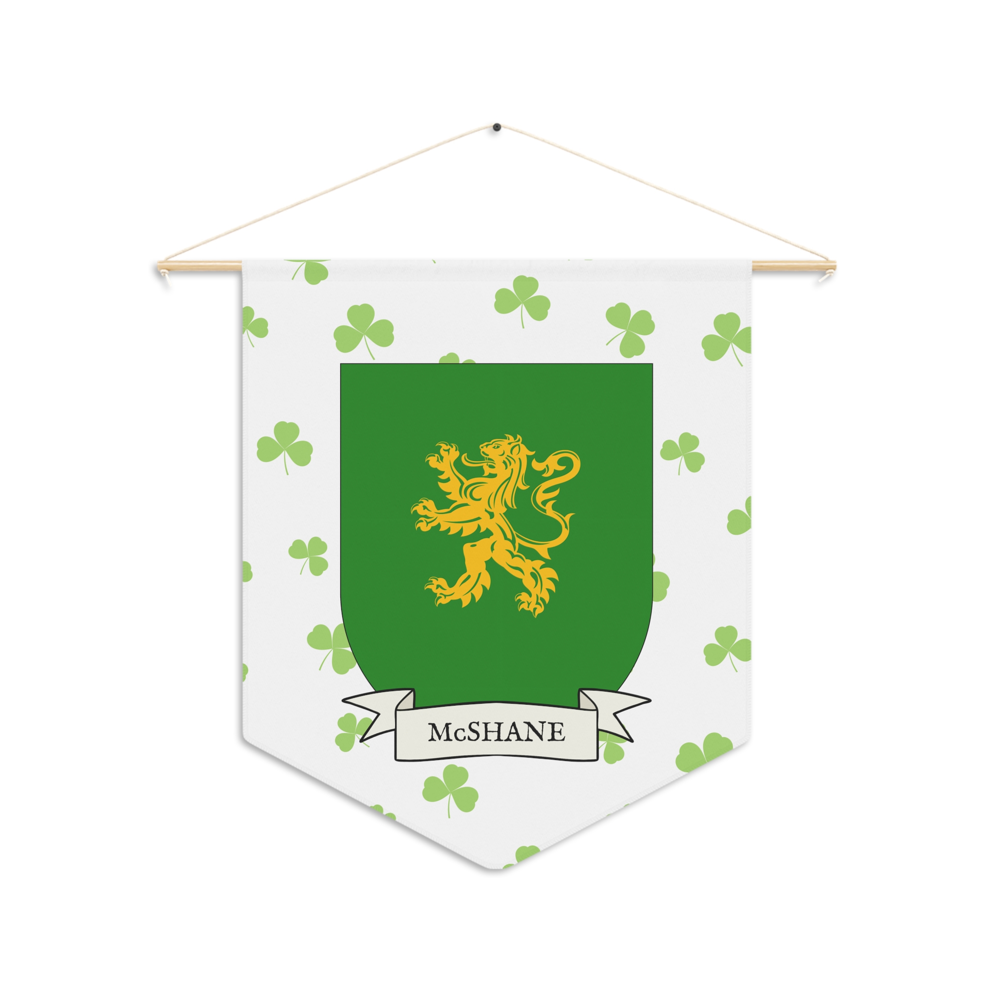 Uplift any room and show off your Irish American roots with this McShane Family Coat of Arms Indoor Pennant. Pennant is printed on durable poly twill and comes with a wooden dowel/twine frame for easy hanging. Features your family Coat of Arms printed over a restrained shamrock patterned background.
