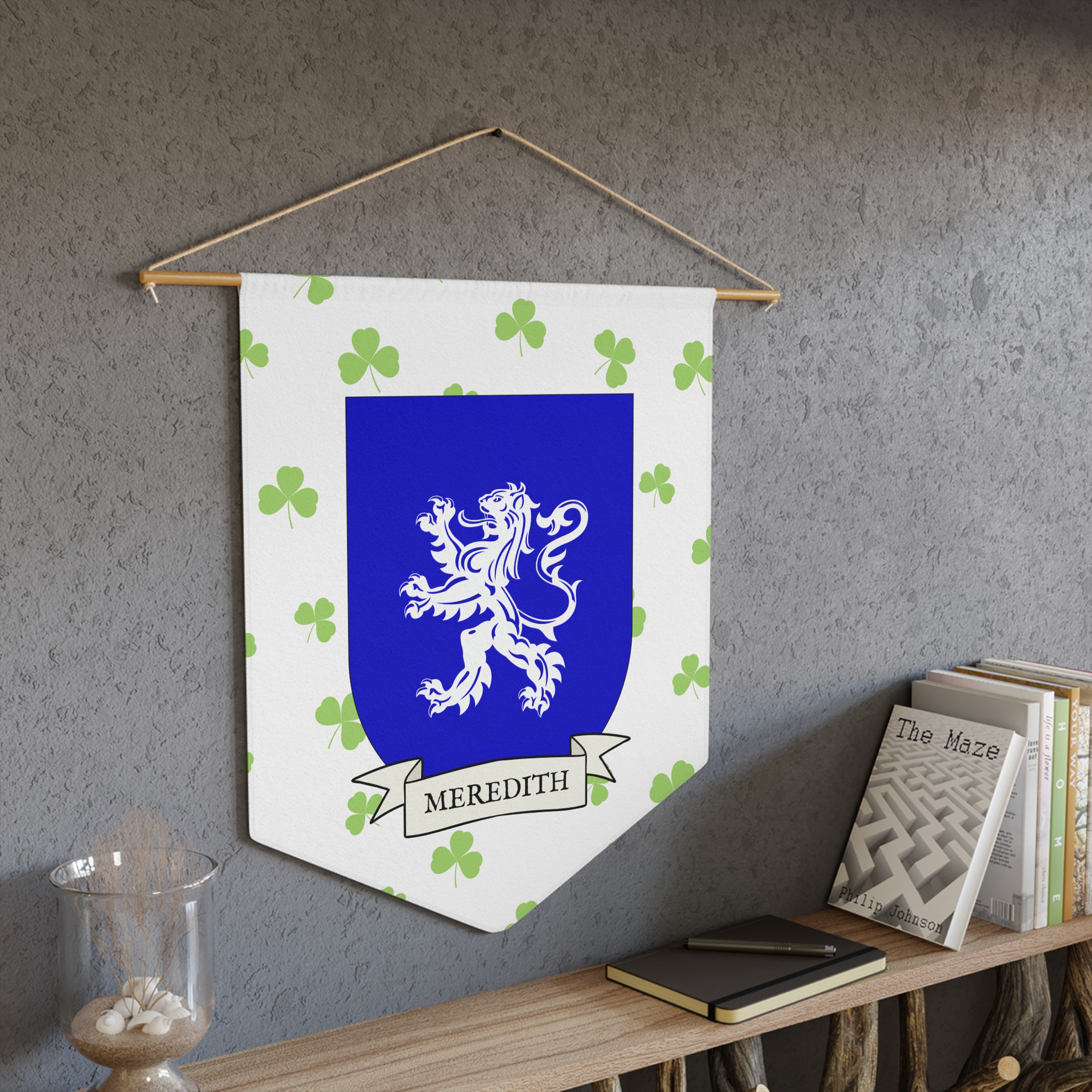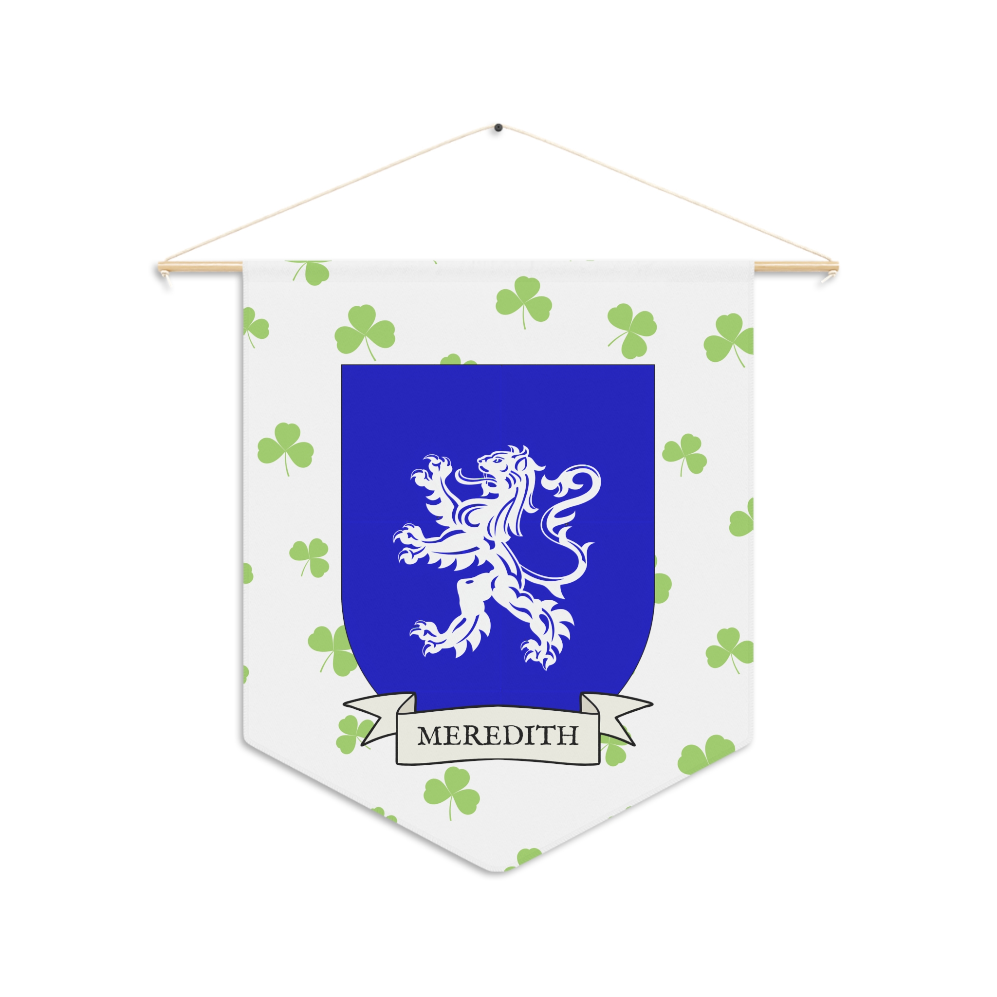 Uplift any room and show off your Irish American roots with this Meredith Family Coat of Arms Indoor Pennant. Pennant is printed on durable poly twill and comes with a wooden dowel/twine frame for easy hanging. Features your family Coat of Arms printed over a restrained shamrock patterned background.