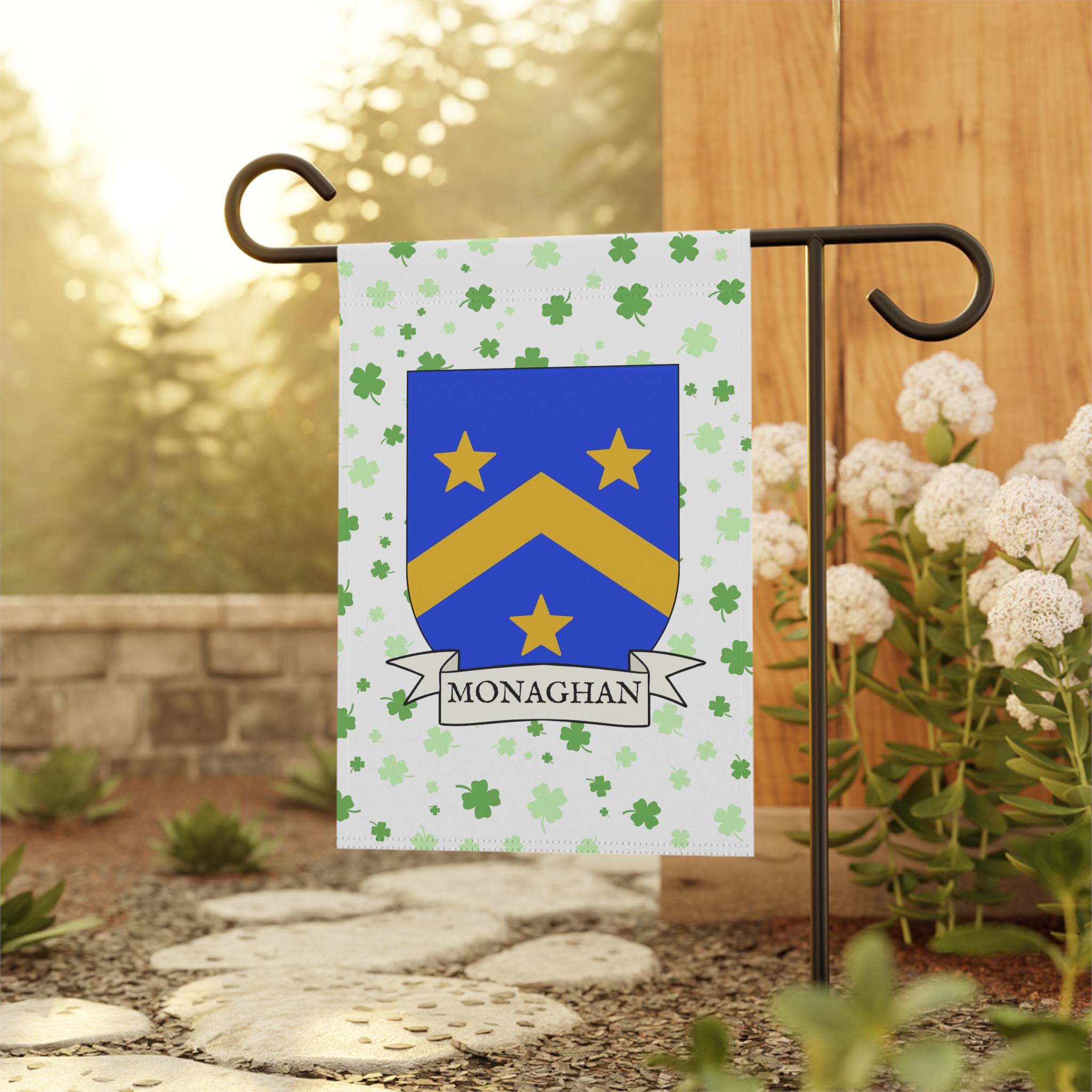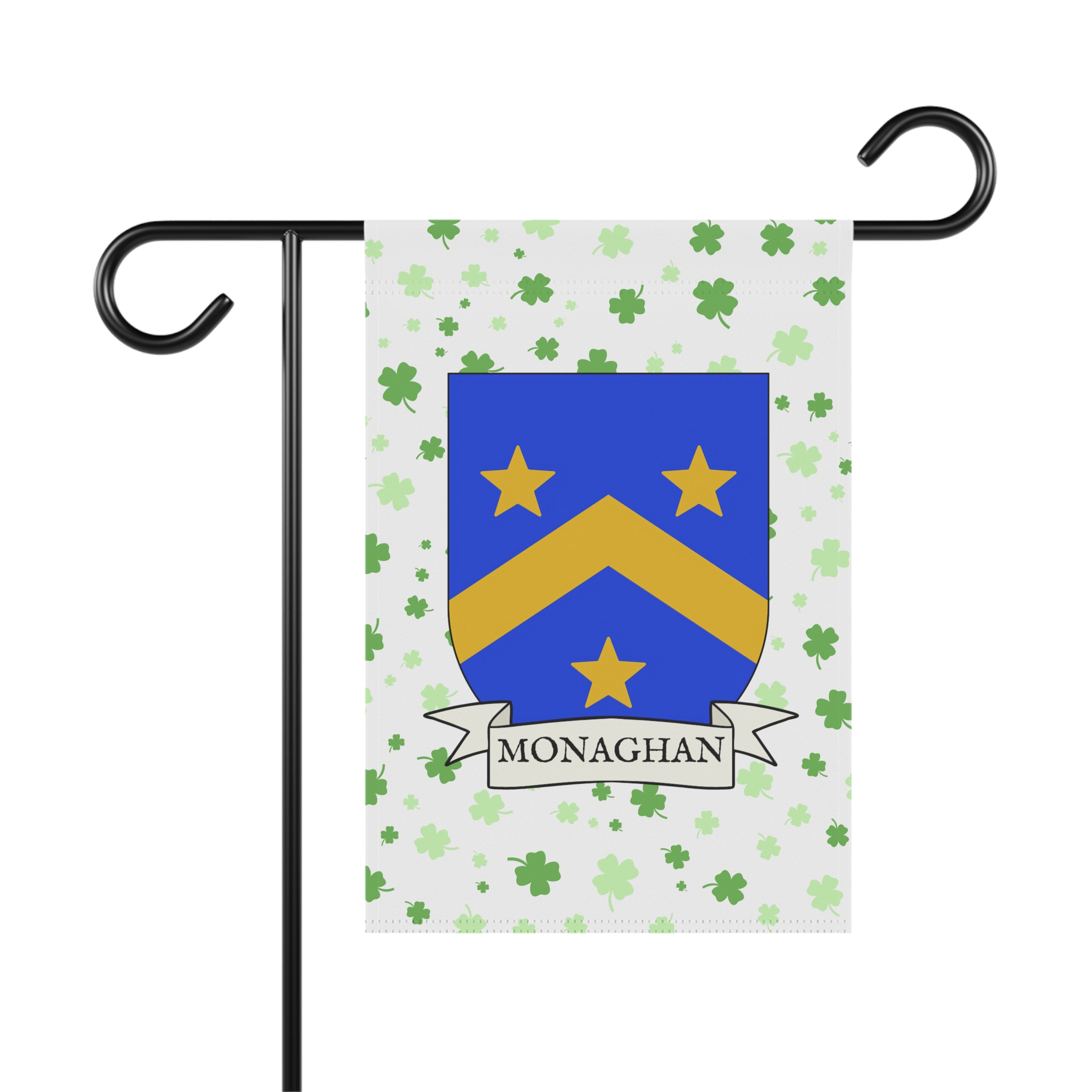 This welcoming Garden Banner will be a great addition to your garden or yard. It displays the Monaghan Family Coat of Arms over a subtle background showing a field of four-leaf shamrocks. Both sides show identical images.
