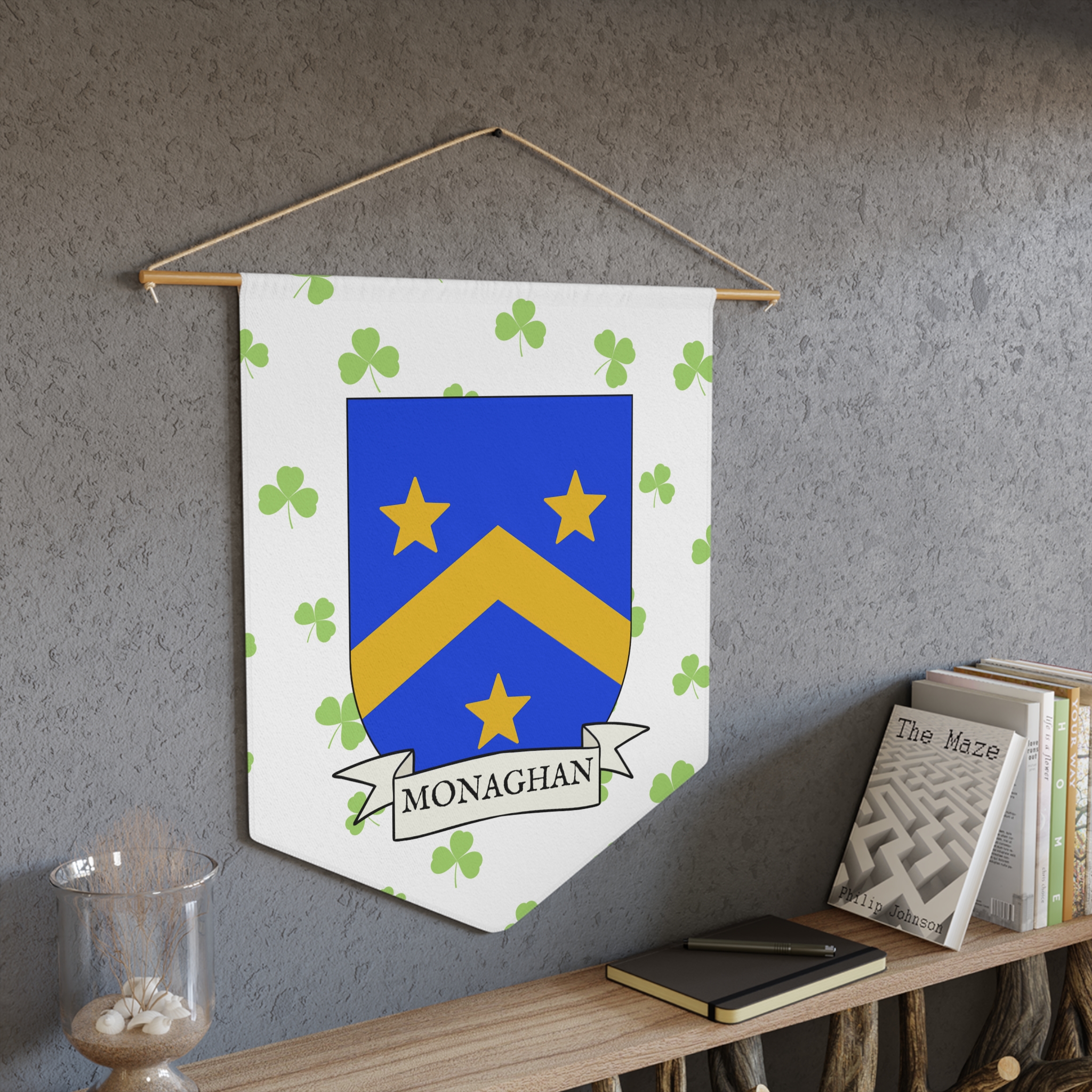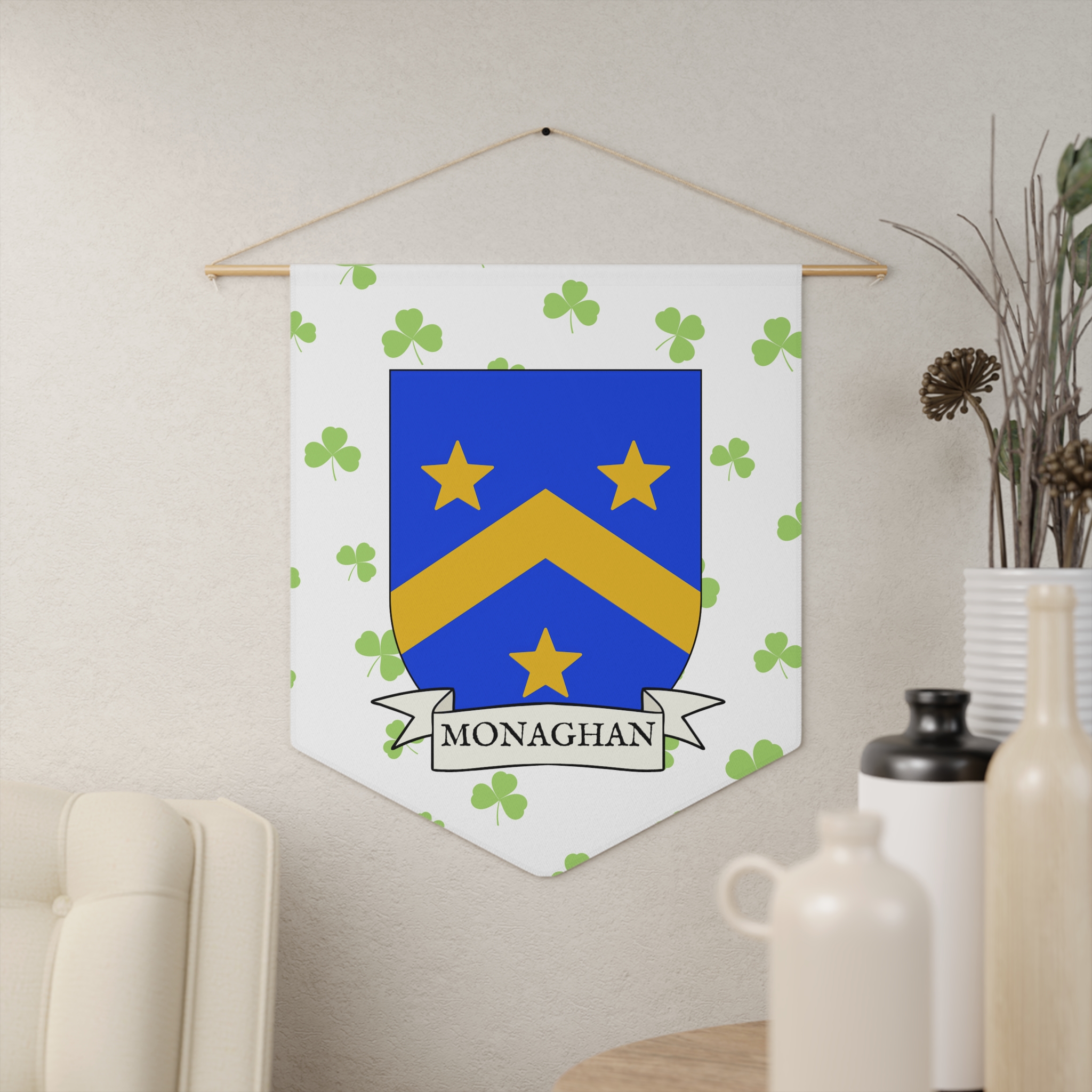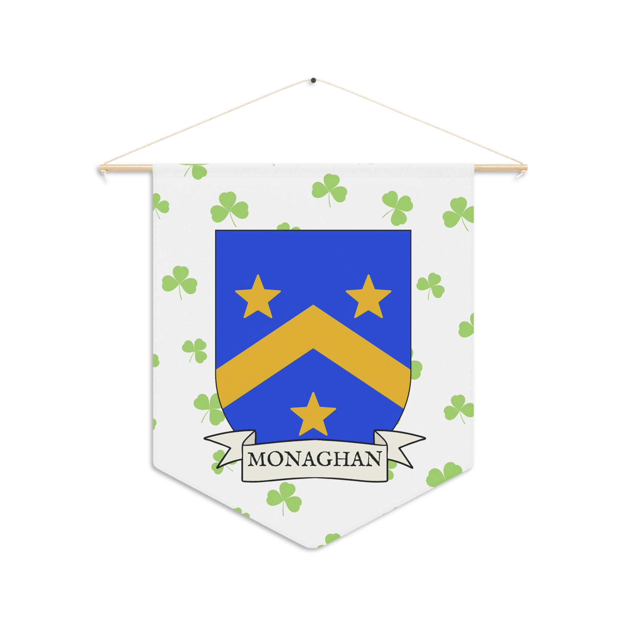 Uplift any room and show off your Irish American roots with this Monaghan Family Coat of Arms Indoor Pennant. Pennant is printed on durable poly twill and comes with a wooden dowel/twine frame for easy hanging. Features your family Coat of Arms printed over a restrained shamrock patterned background.