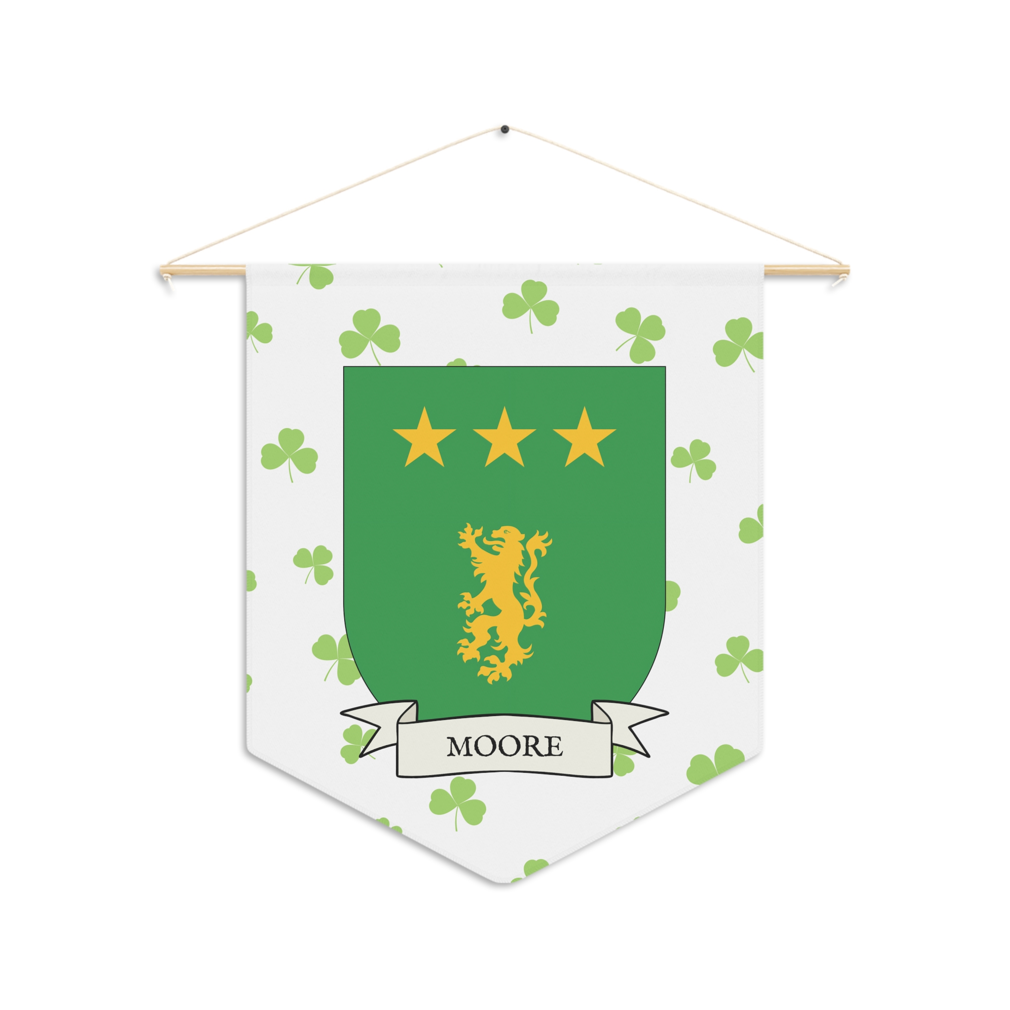 Uplift any room and show off your Irish American roots with this Moore Family Coat of Arms Indoor Pennant. Pennant is printed on durable poly twill and comes with a wooden dowel/twine frame for easy hanging. Features your family Coat of Arms printed over a restrained shamrock patterned background.