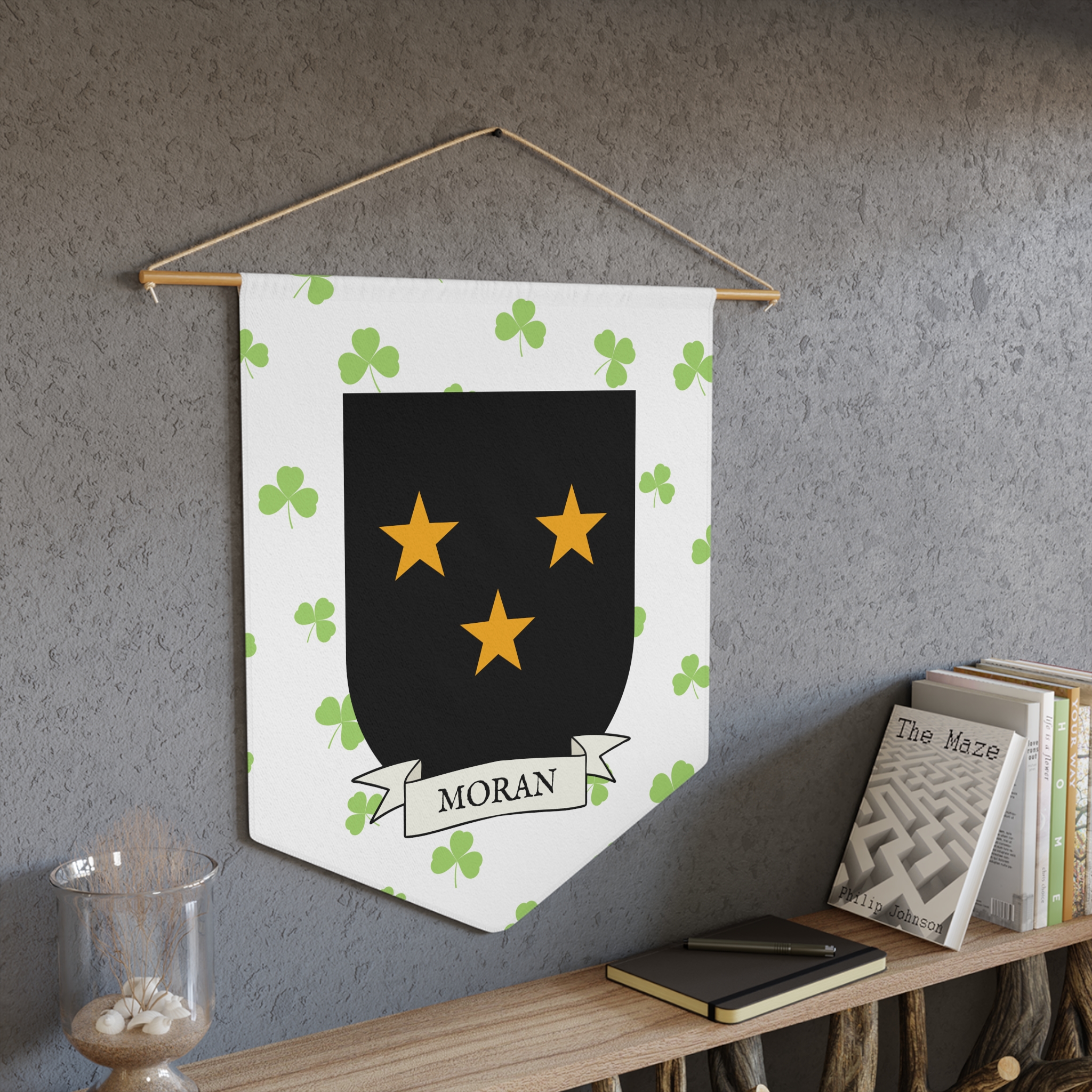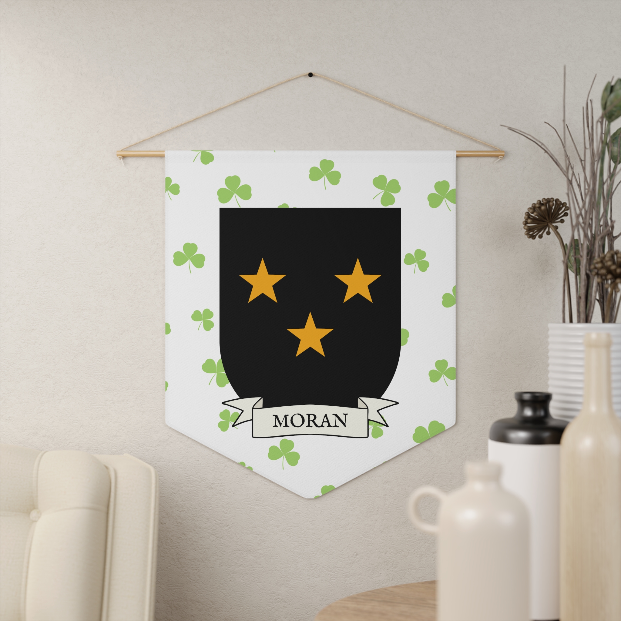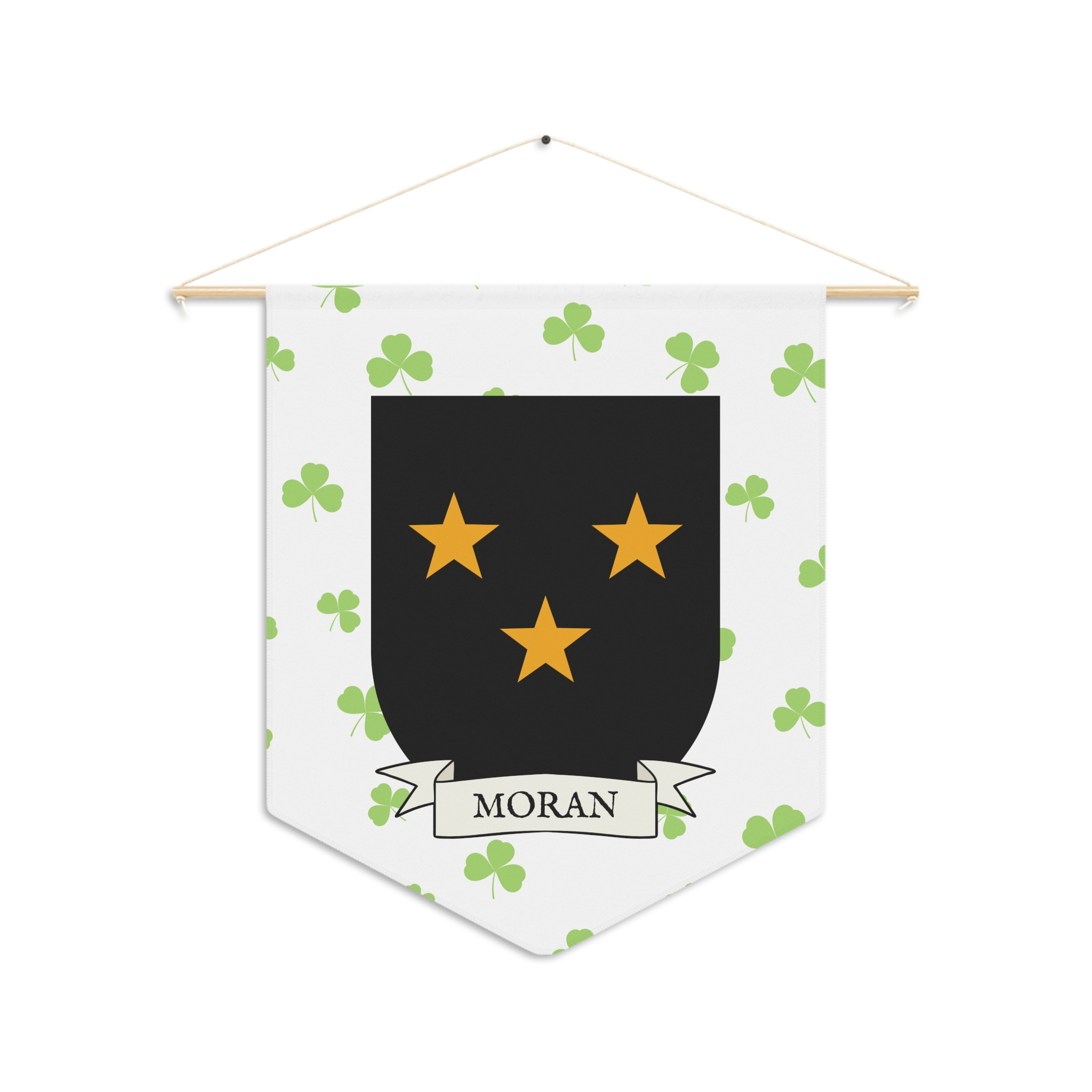 Uplift any room and show off your Irish American roots with this Moran Family Coat of Arms Indoor Pennant. Pennant is printed on durable poly twill and comes with a wooden dowel/twine frame for easy hanging. Features your family Coat of Arms printed over a restrained shamrock patterned background.