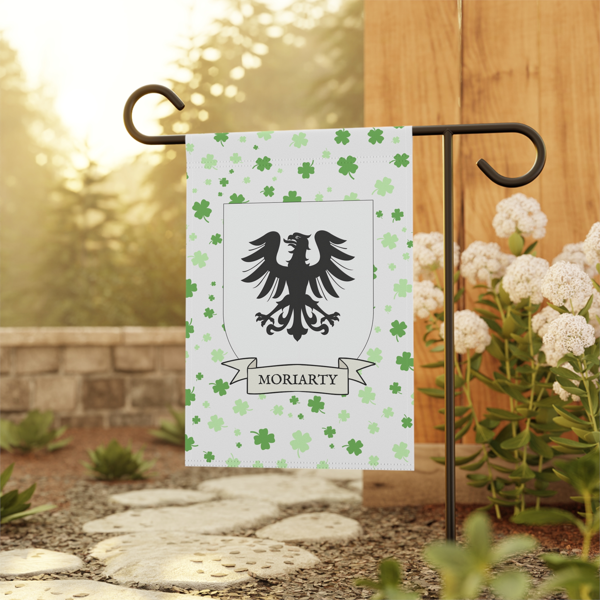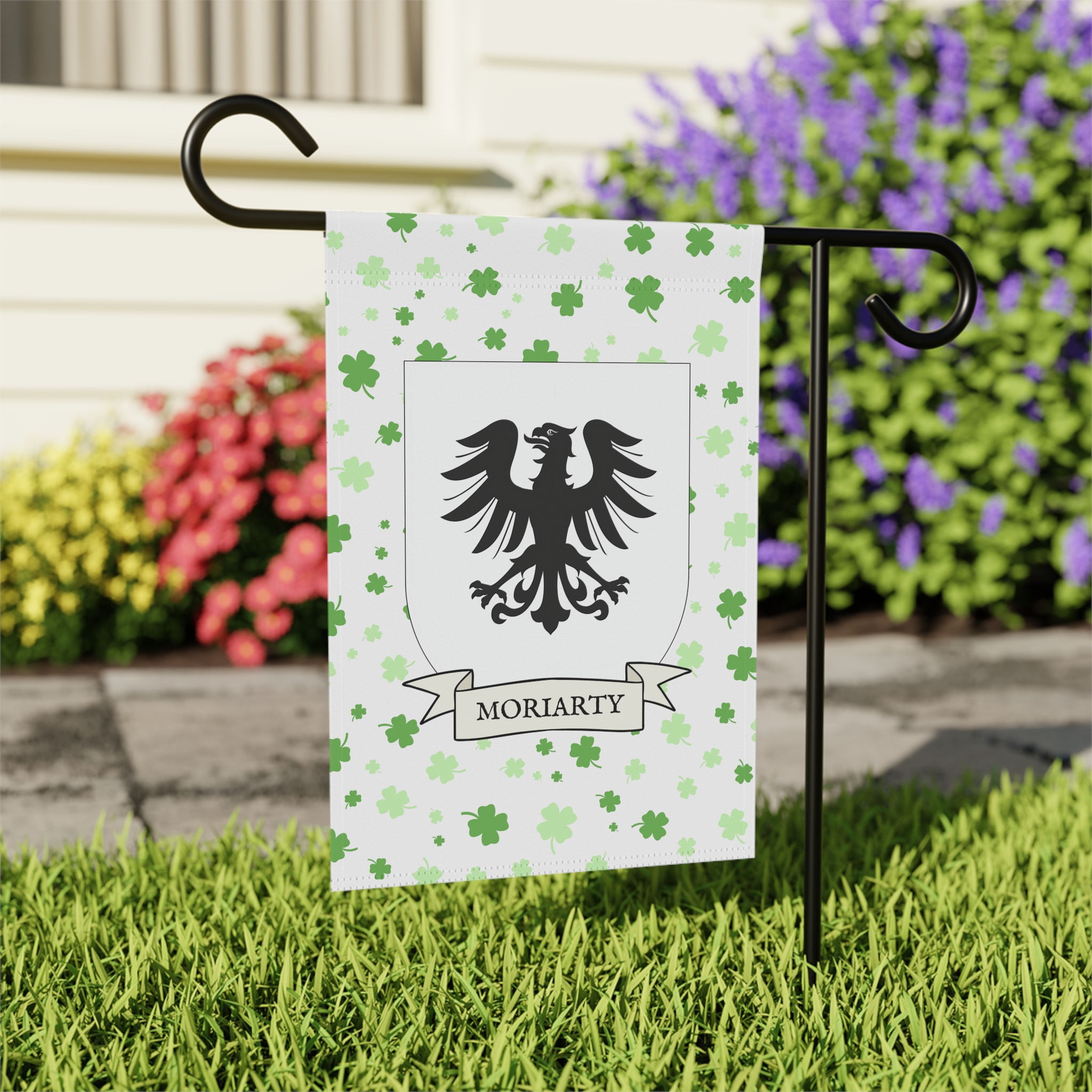 This welcoming Garden Banner will be a great addition to your garden or yard. It displays the Moriarty Family Coat of Arms over a subtle background showing a field of four-leaf shamrocks. Both sides show identical images.