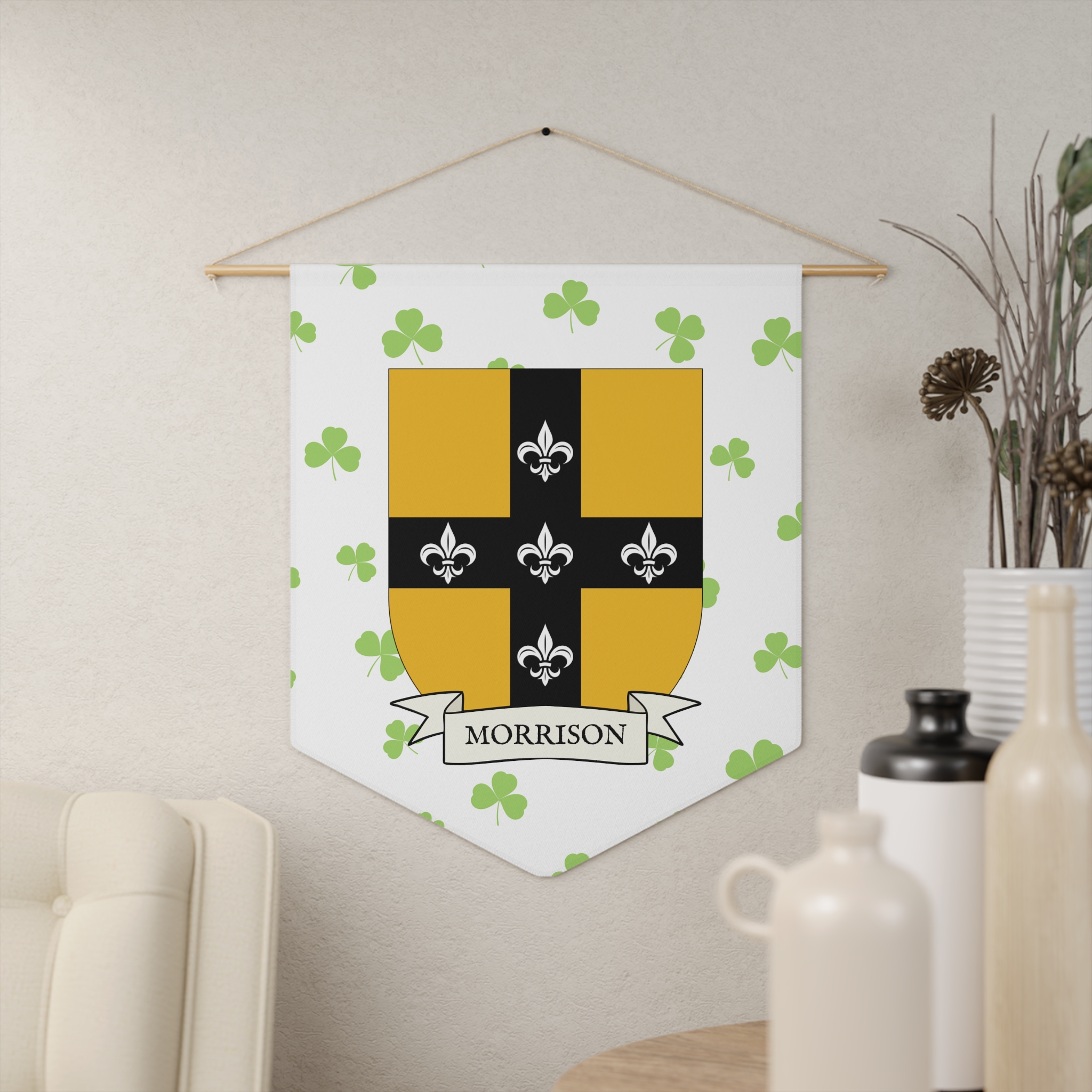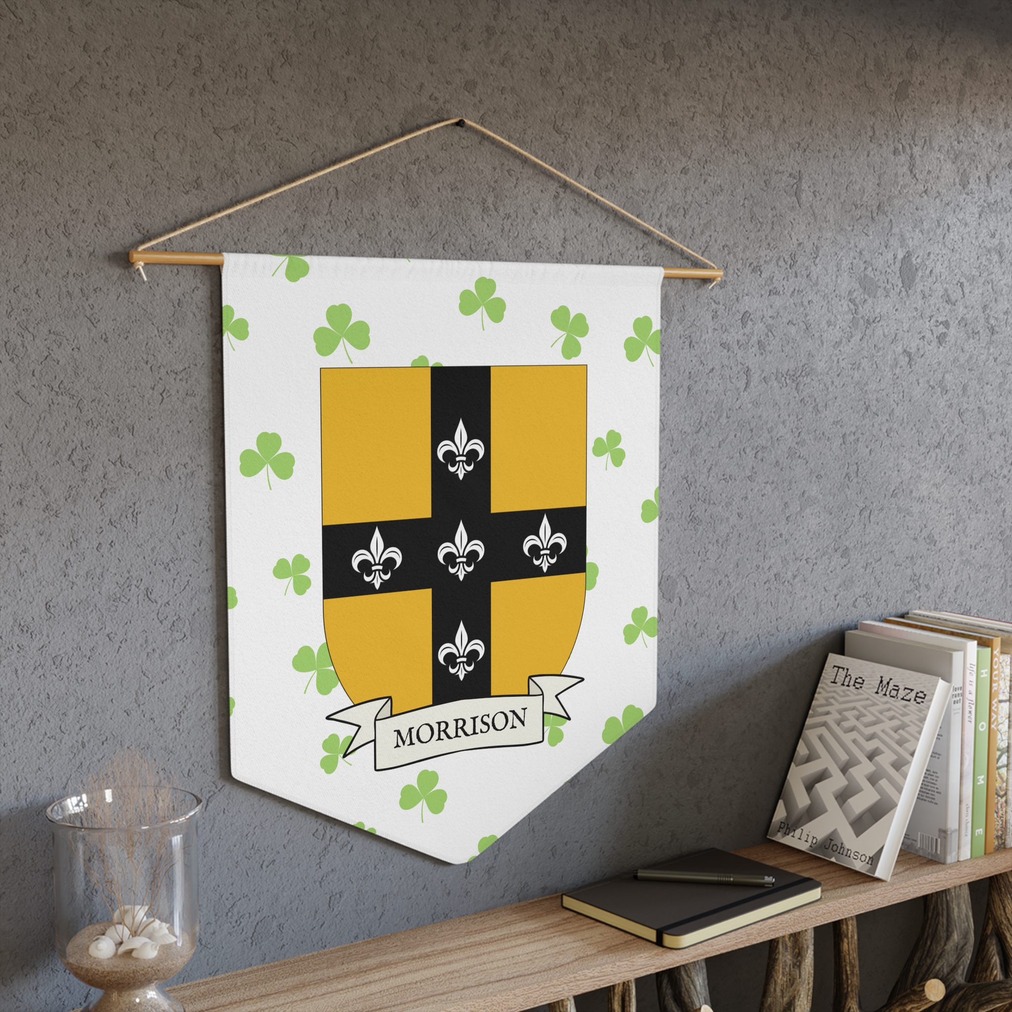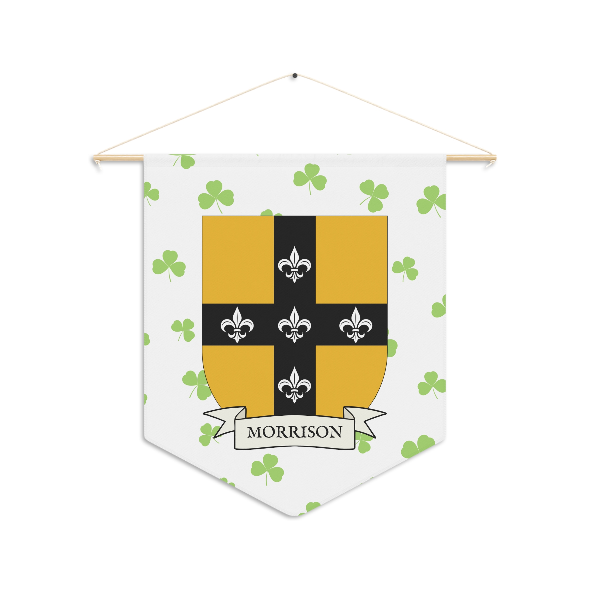 Uplift any room and show off your Irish American roots with this Morrison Family Coat of Arms Indoor Pennant. Pennant is printed on durable poly twill and comes with a wooden dowel/twine frame for easy hanging. Features your family Coat of Arms printed over a restrained shamrock patterned background.