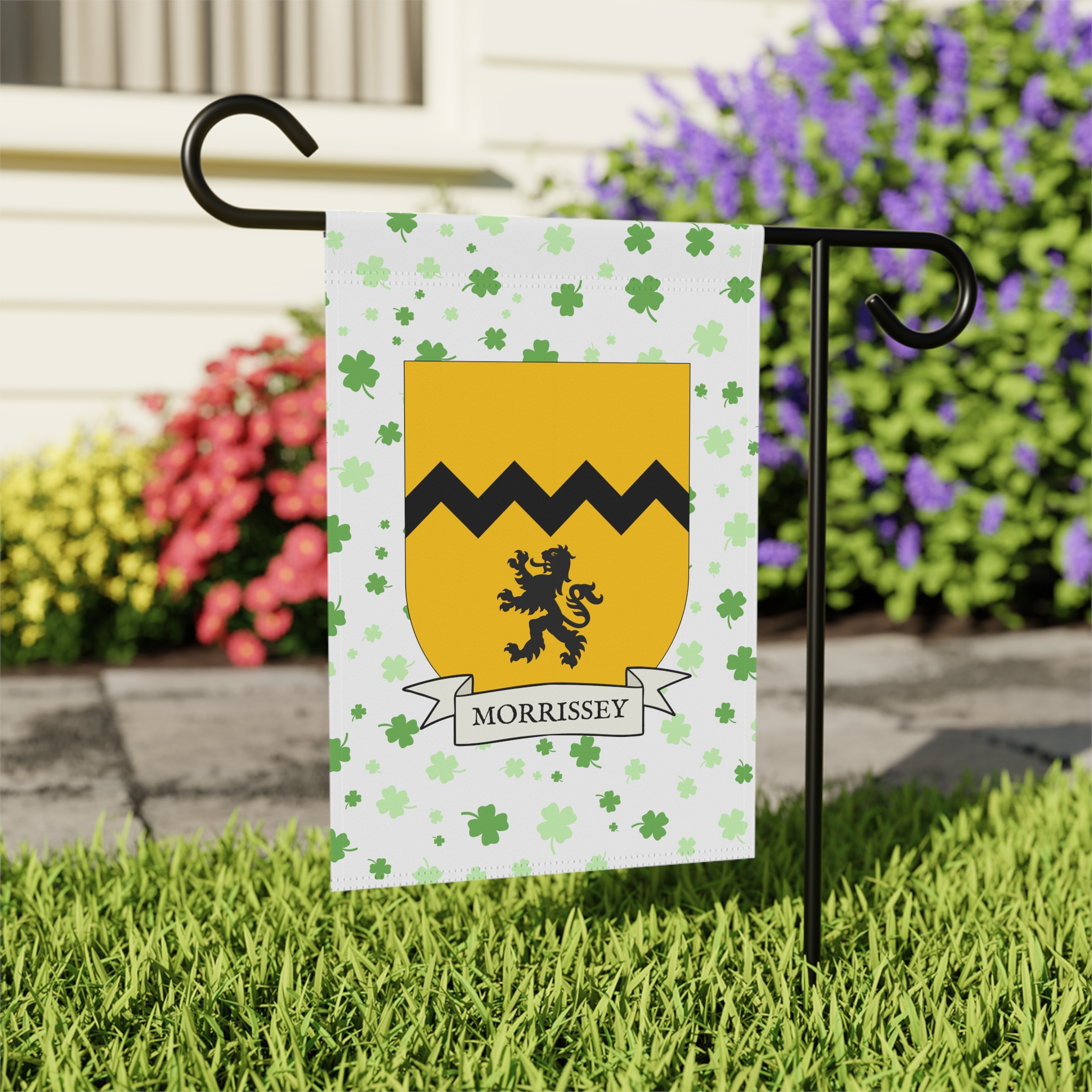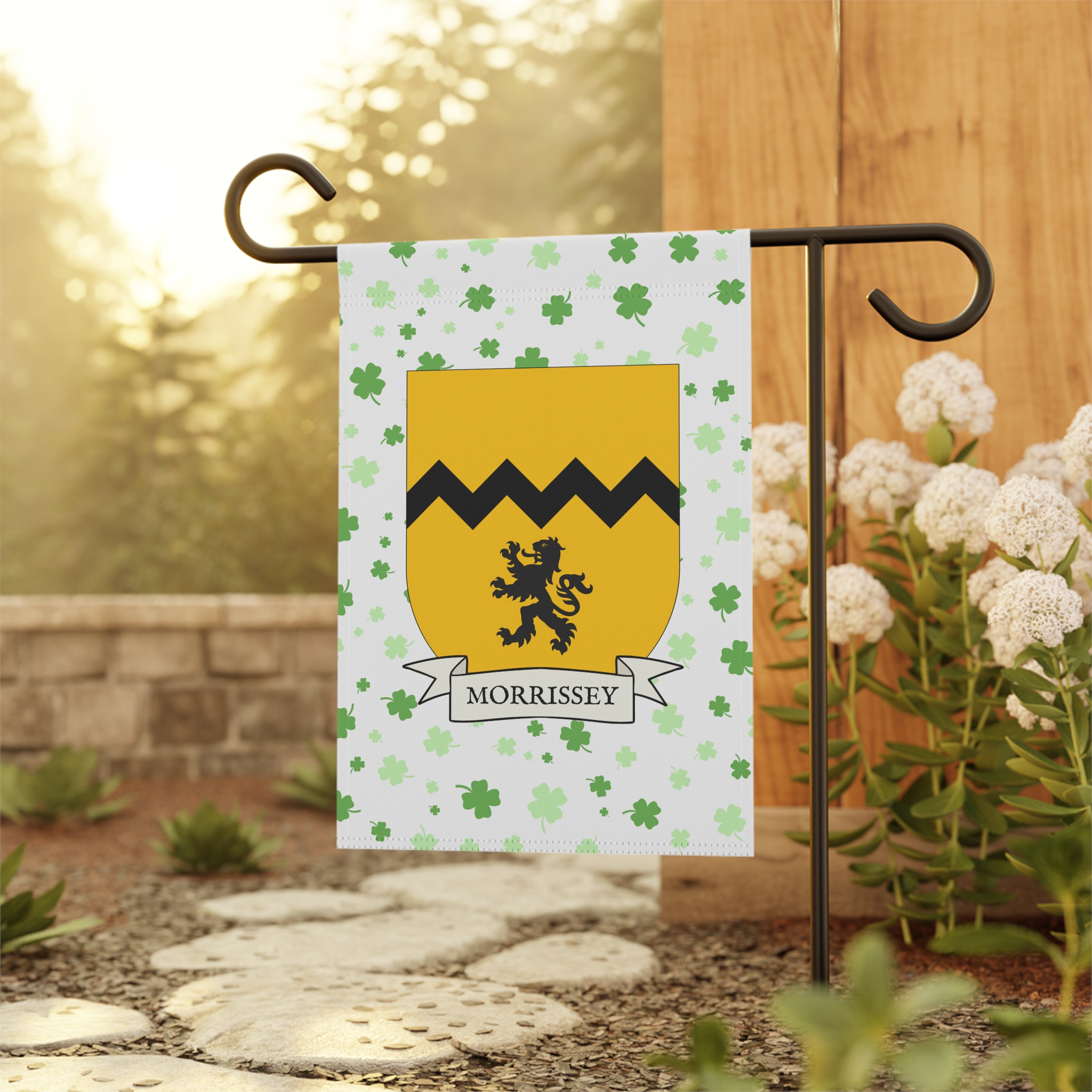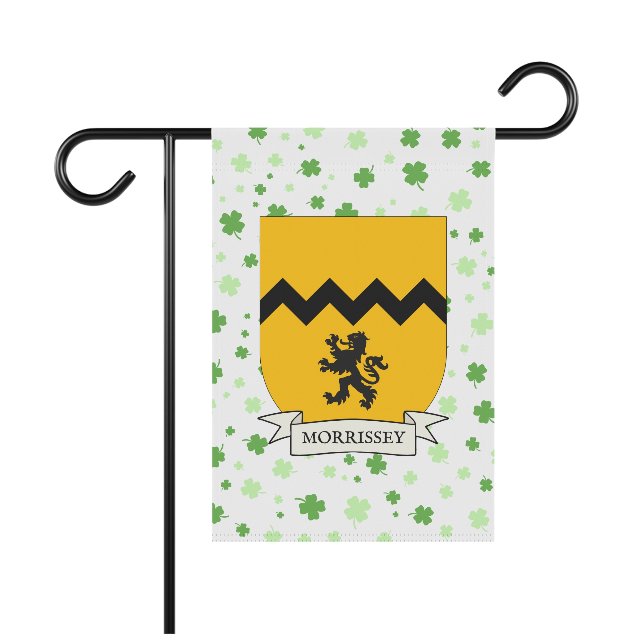 This welcoming Garden Banner will be a great addition to your garden or yard. It displays the Morrissey Family Coat of Arms over a subtle background showing a field of four-leaf shamrocks. Both sides show identical images.