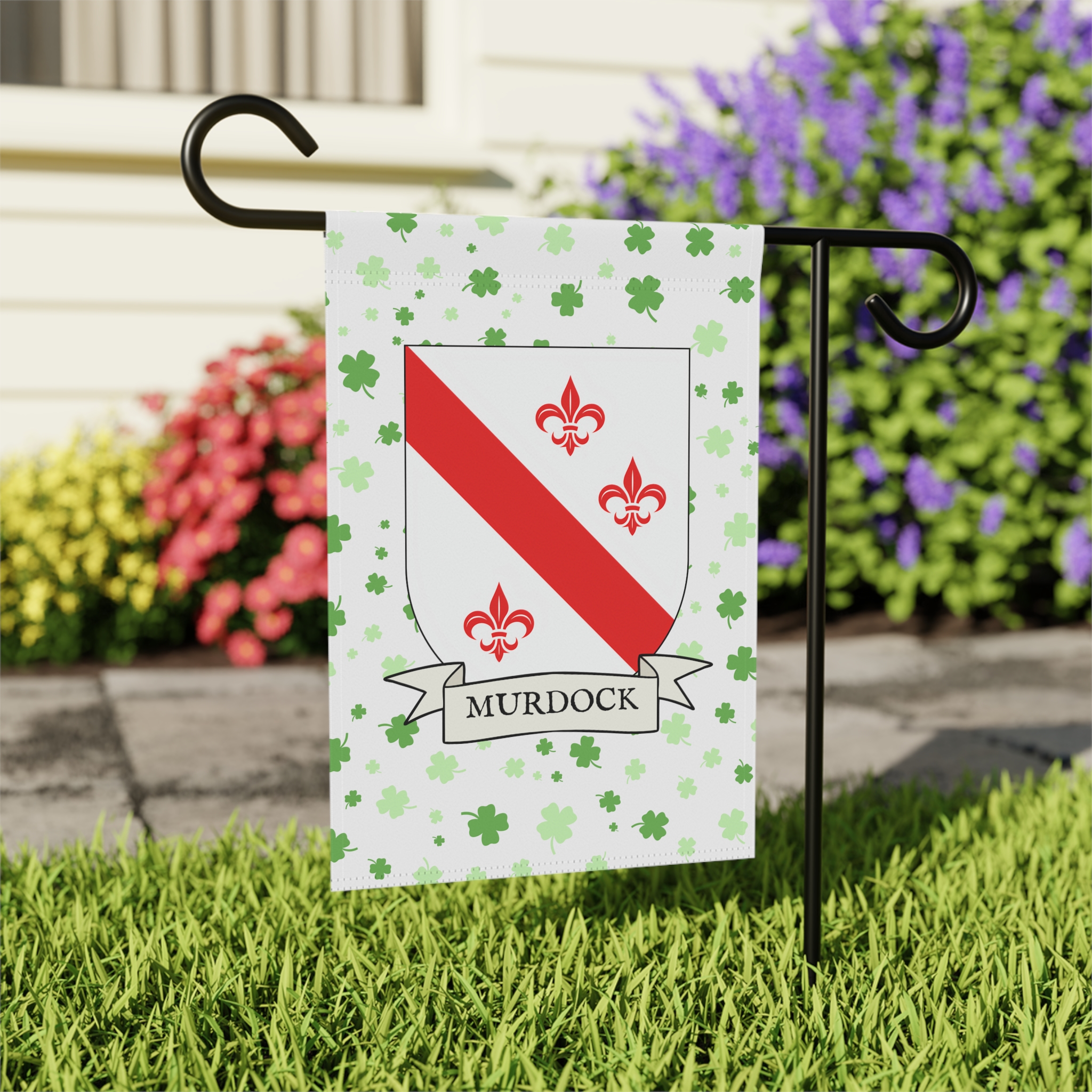 This welcoming Garden Banner will be a great addition to your garden or yard. It displays the Murdock Family Coat of Arms over a subtle background showing a field of four-leaf shamrocks. Both sides show identical images.