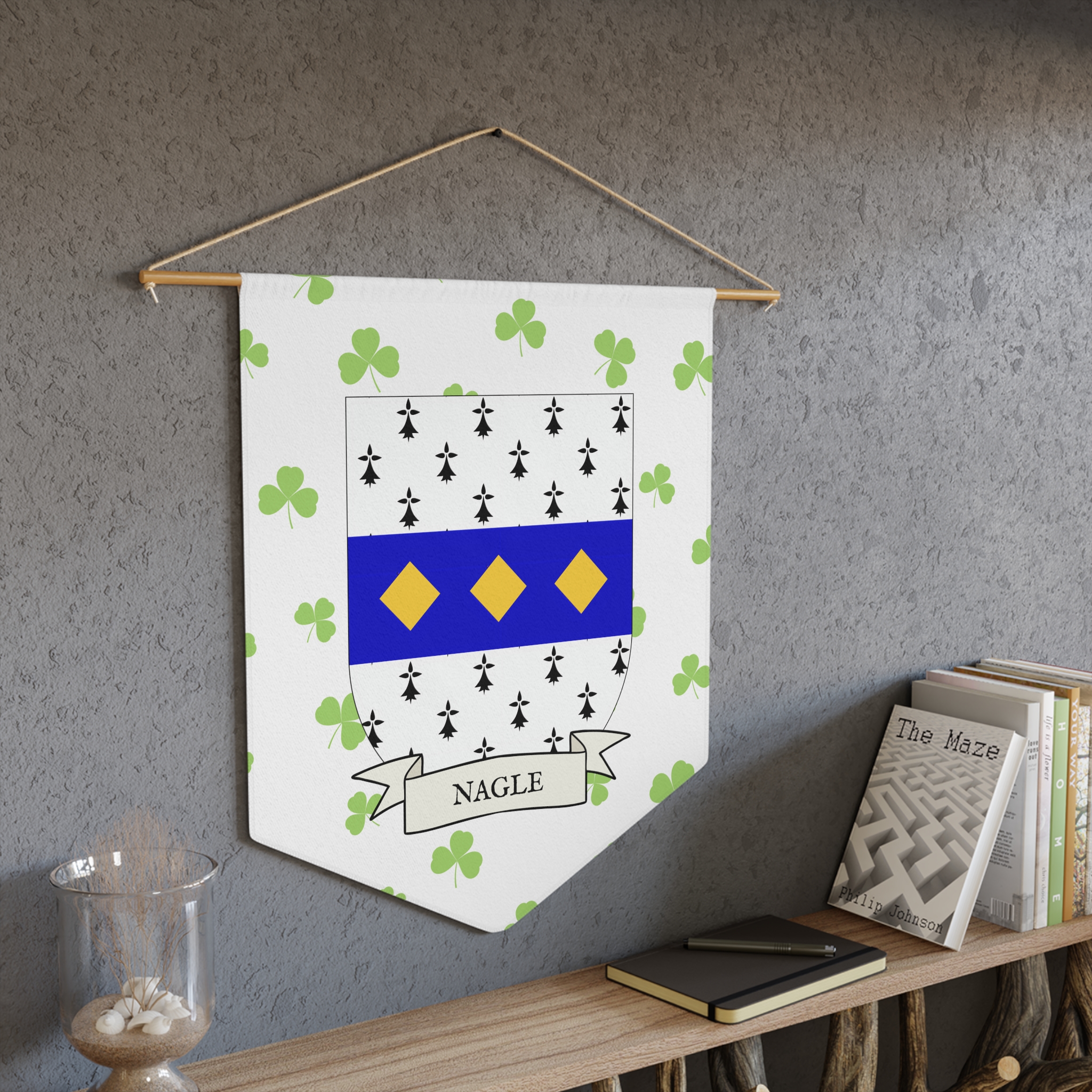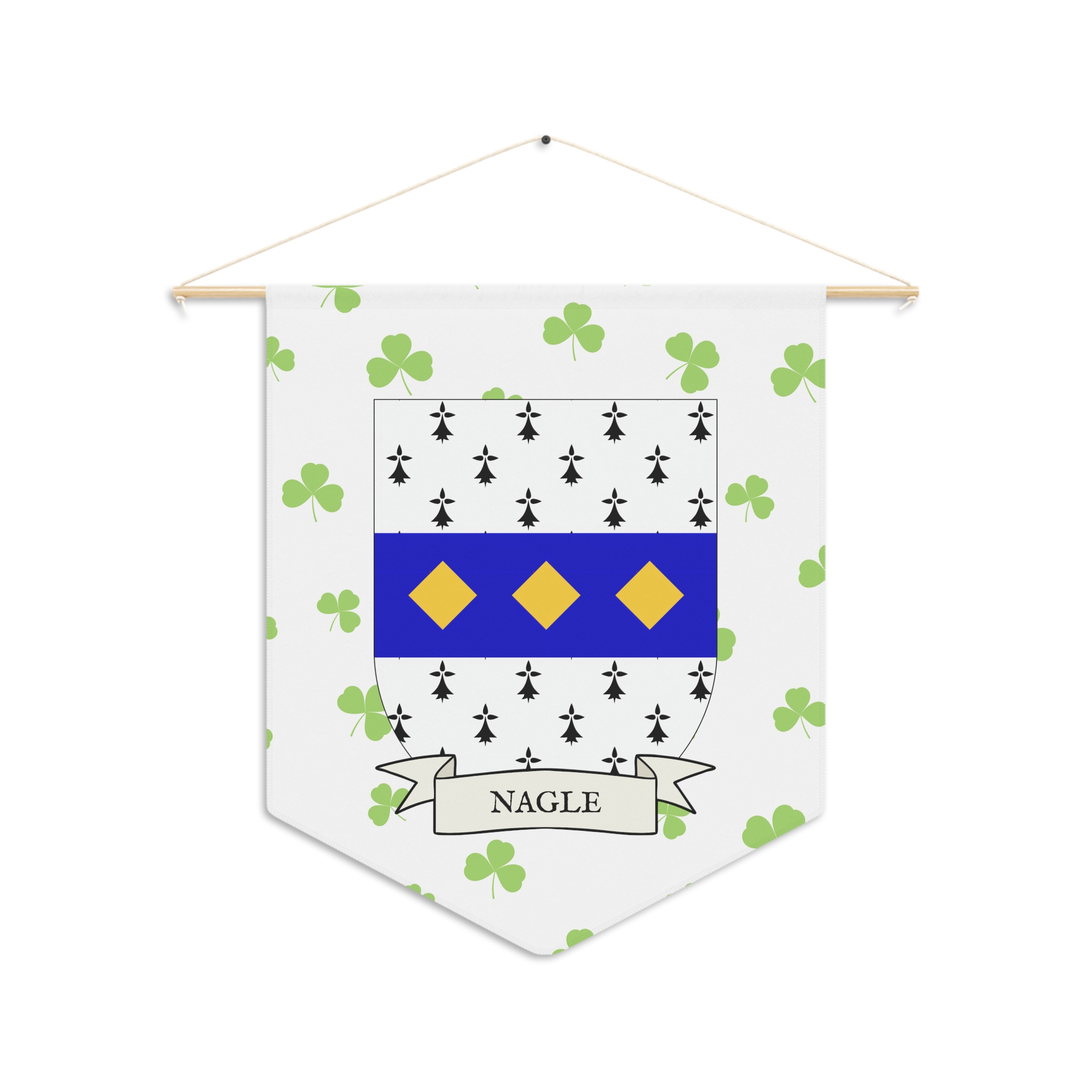 Uplift any room and show off your Irish American roots with this Nagle Family Coat of Arms Indoor Pennant. Pennant is printed on durable poly twill and comes with a wooden dowel/twine frame for easy hanging. Features your family Coat of Arms printed over a restrained shamrock patterned background.