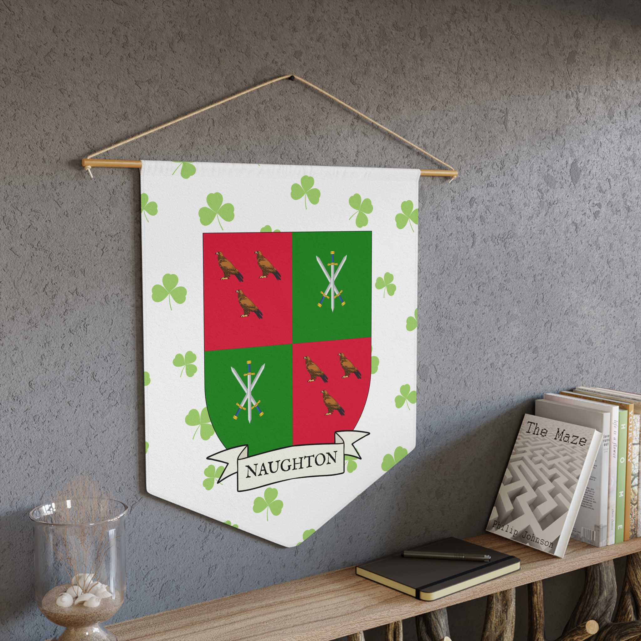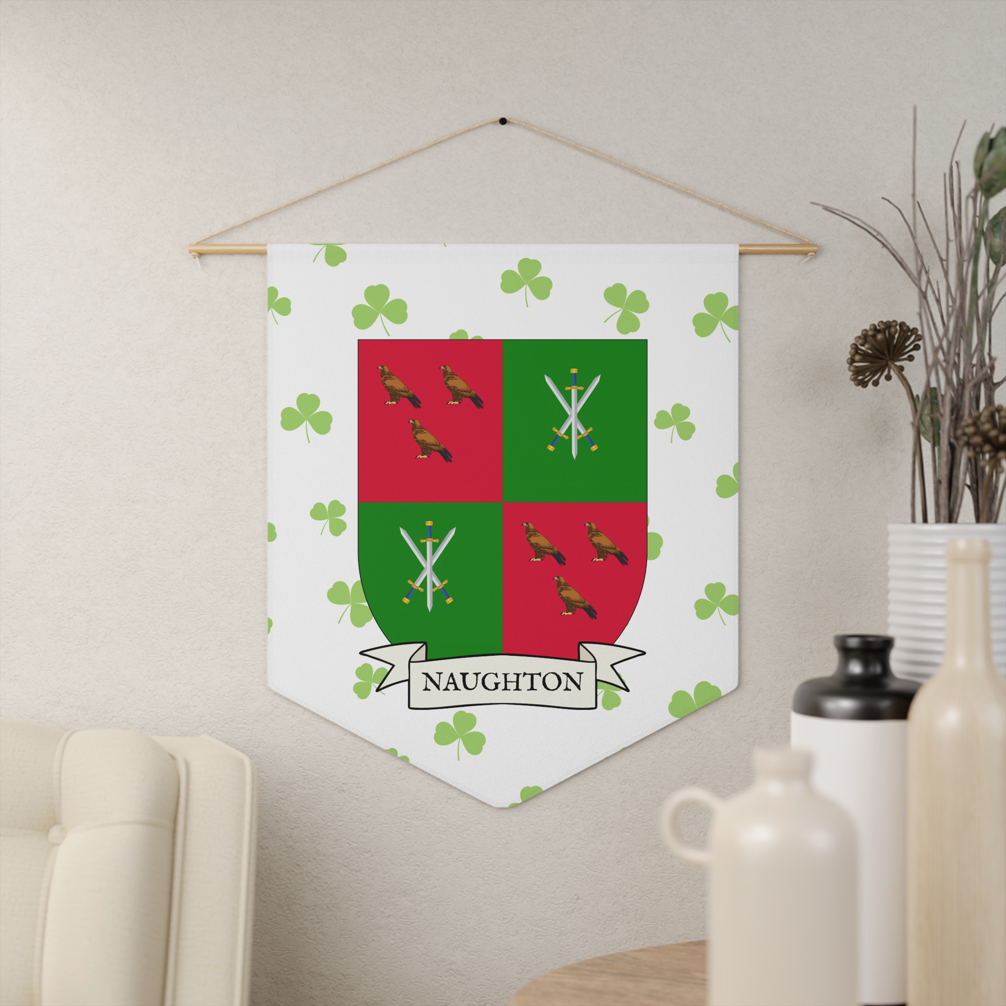 Uplift any room and show off your Irish American roots with this Naughton Family Coat of Arms Indoor Pennant. Pennant is printed on durable poly twill and comes with a wooden dowel/twine frame for easy hanging. Features your family Coat of Arms printed over a restrained shamrock patterned background.
