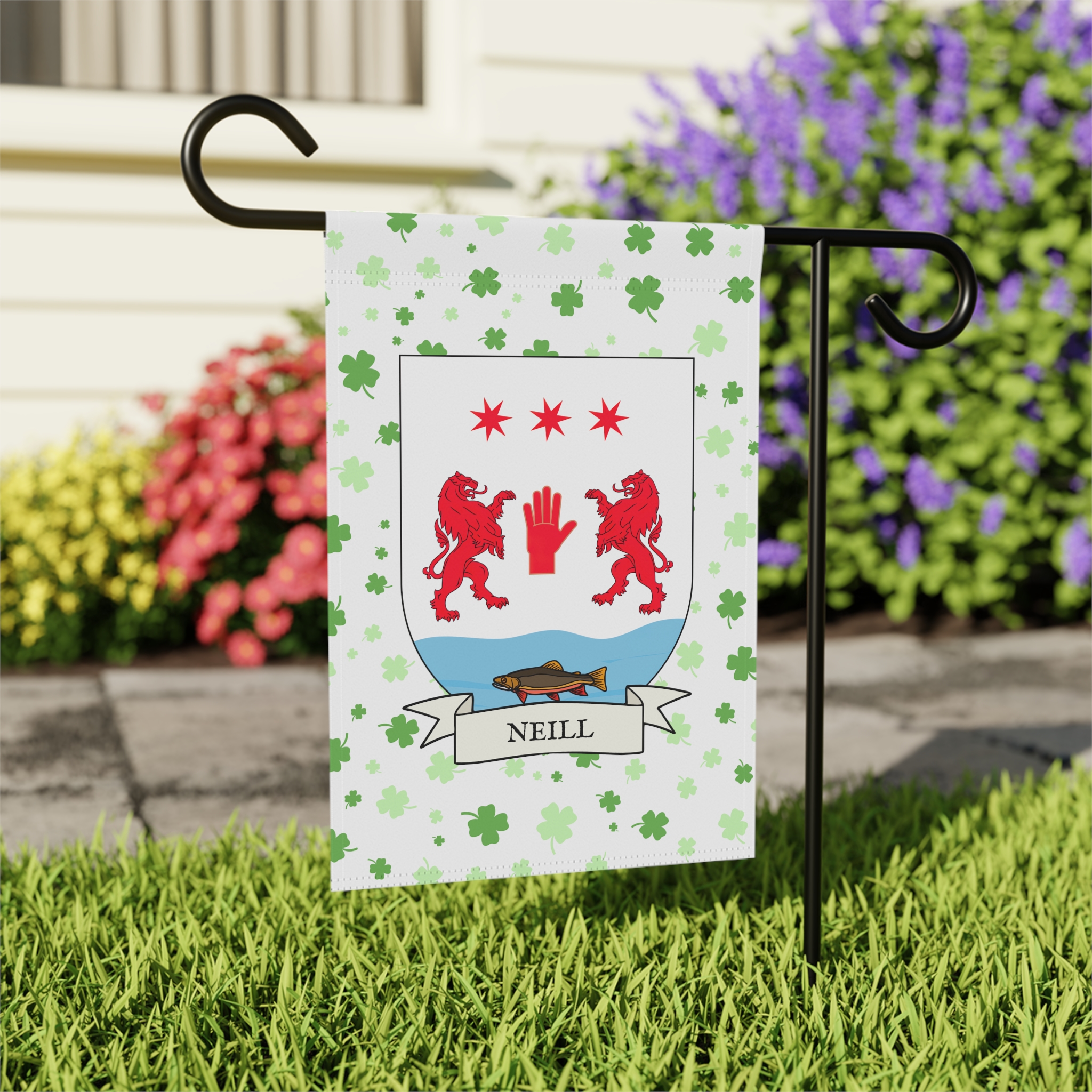 This welcoming Garden Banner will be a great addition to your garden or yard. It displays the Neill Family Coat of Arms over a subtle background showing a field of four-leaf shamrocks. Both sides show identical images.