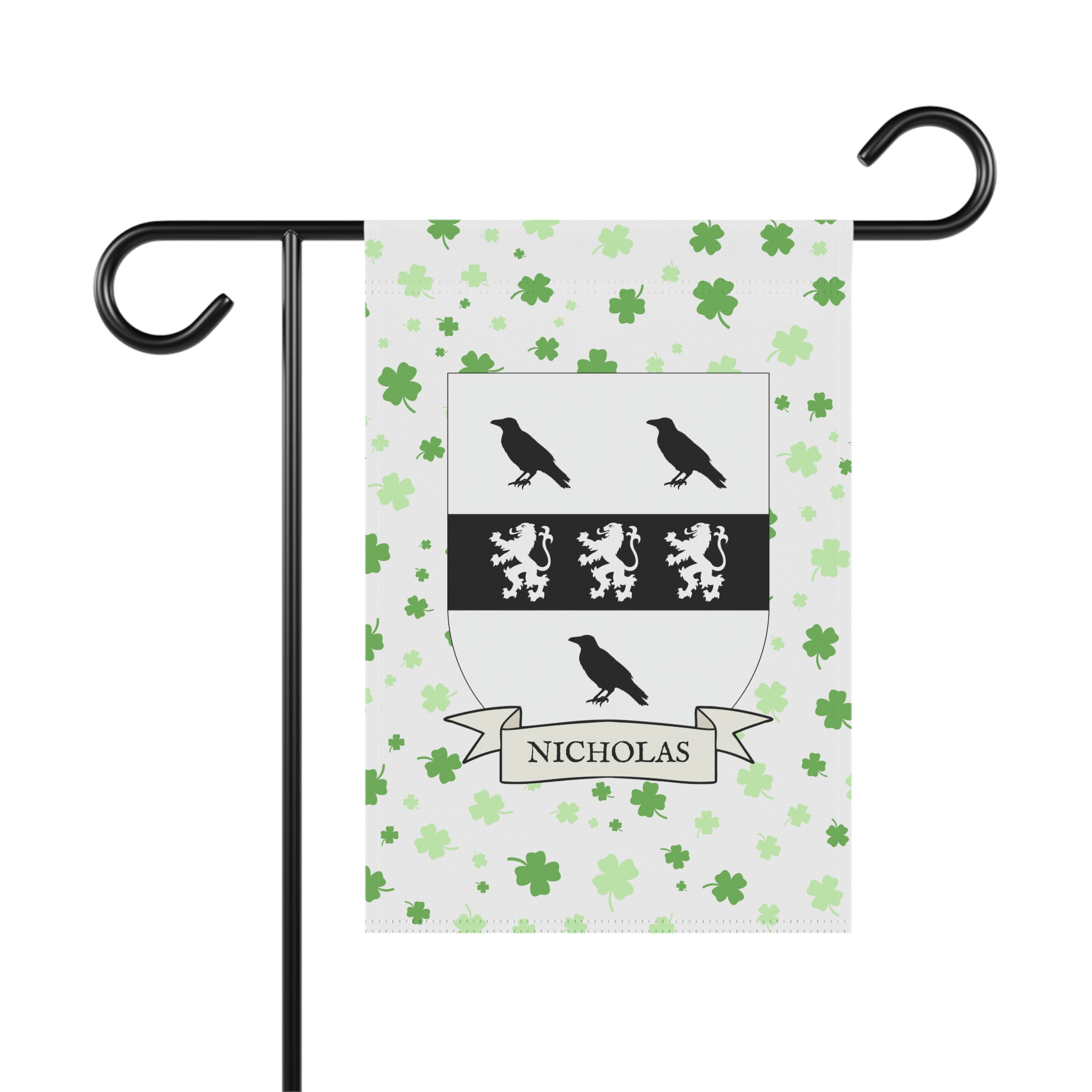 This welcoming Garden Banner will be a great addition to your garden or yard. It displays the Nicholas Family Coat of Arms over a subtle background showing a field of four-leaf shamrocks. Both sides show identical images.