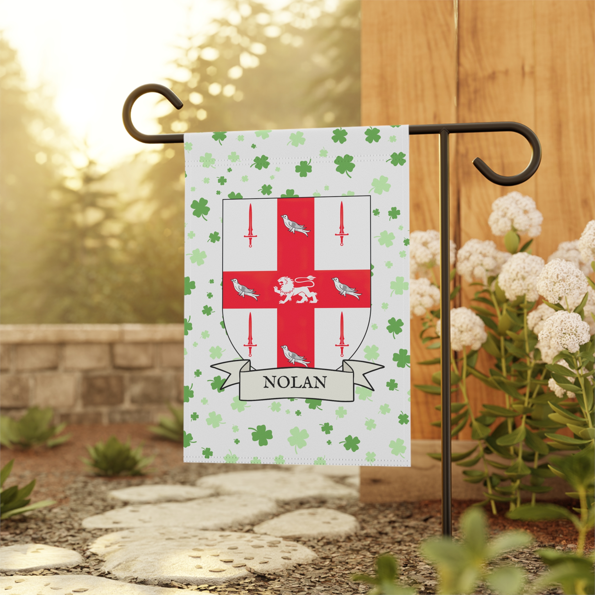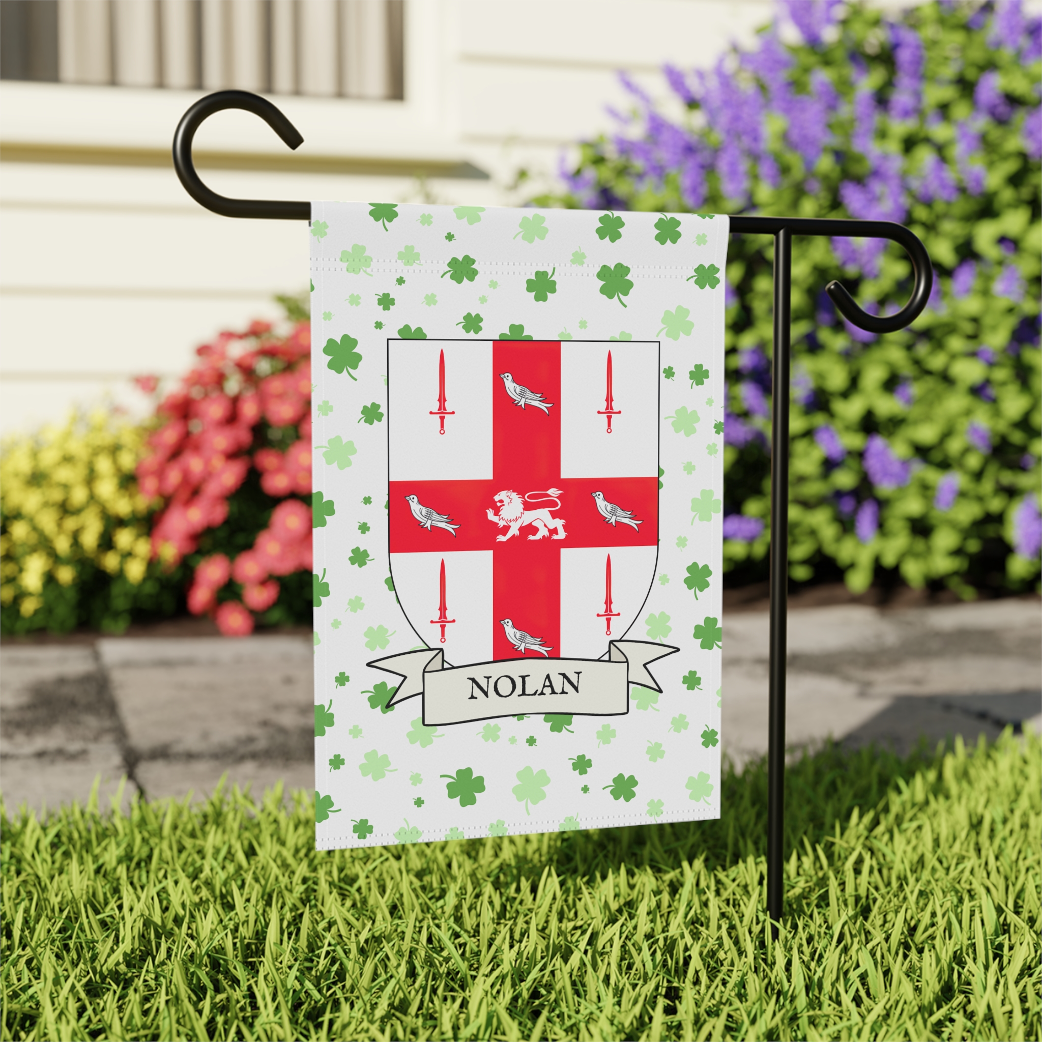 This welcoming Garden Banner will be a great addition to your garden or yard. It displays the Nolan Family Coat of Arms over a subtle background showing a field of four-leaf shamrocks. Both sides show identical images.