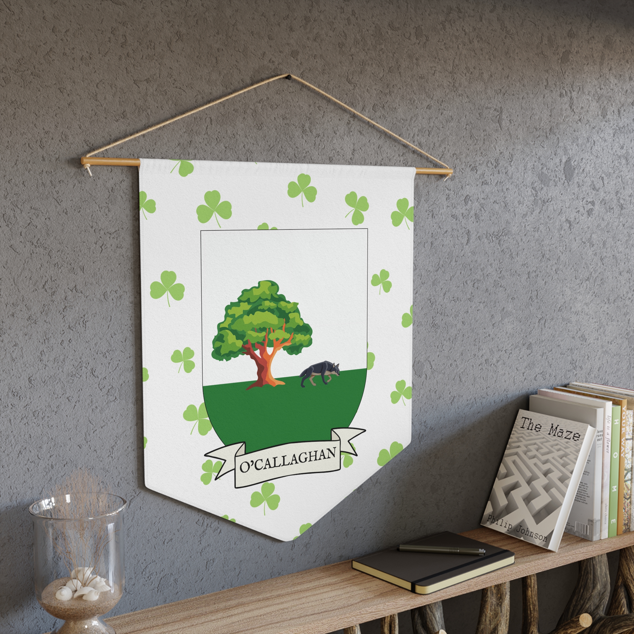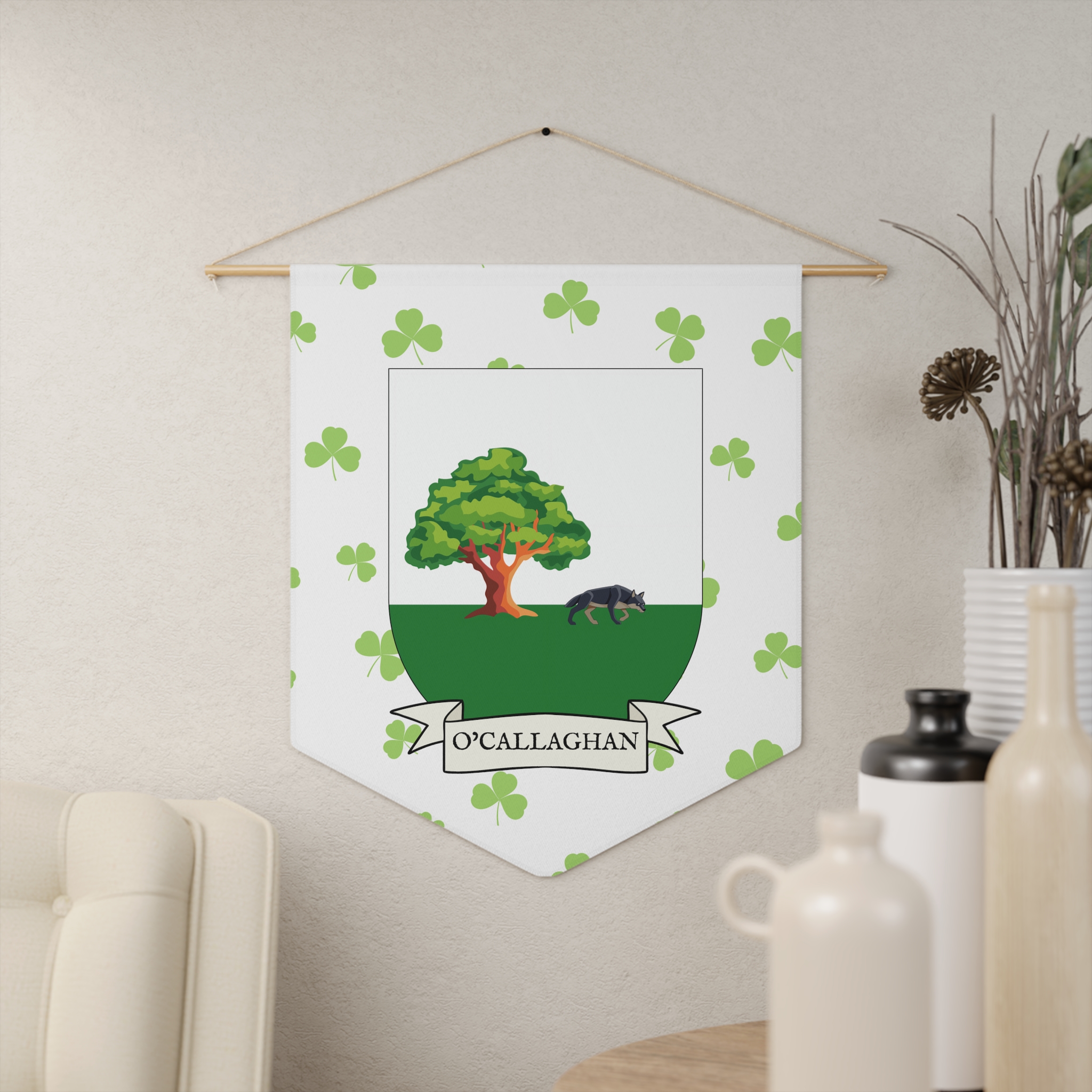 Uplift any room and show off your Irish American roots with this O’Callaghan Family Coat of Arms Indoor Pennant. Pennant is printed on durable poly twill and comes with a wooden dowel/twine frame for easy hanging. Features your family Coat of Arms printed over a restrained shamrock patterned background.